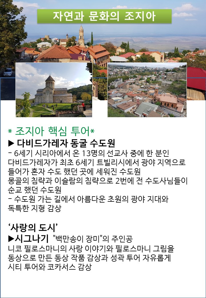 | 8일차 트빌리시 다비드가레자 시그나기 트빌리시 | 호텔 조식 후 ▶ 다비드가레자 동굴 수도원으로 1시간 30분 이동 - 6세기 시리아에서 온 13명의 선교사님중에 한분인 다비드가레자가 최초 6세기 트빌리시에서 광야 지역으로 들어가 혼자 수도 했던 곳에 세워진 수도원 몽골의 침략과 이슬람의 침략으로 2번에 전 수도사님들이 순교 했던 수도원 - 수도원 가는 길에서 아름다운 초원의 광야 지대와 독특한 지형 감상 사랑의 도시 -시그나기로 이동 1시간 ▶시그나기 "백만송이 장미"의 주인공 니코 필로스마니의 사랑 이야기와 필로스마니 그림을 동상으로 만든 동상 작품 감상과 성곽 투어 자유롭게 시티 투어 와 코카서스 감상 트빌리시로 이동 ▶조식 : 호텔식 / 중식 : 현지식 / 석식 : 현지식 ▶힐튼 리버뷰 HITON (REVER VIEW 트빌리시) 또는 동급 |