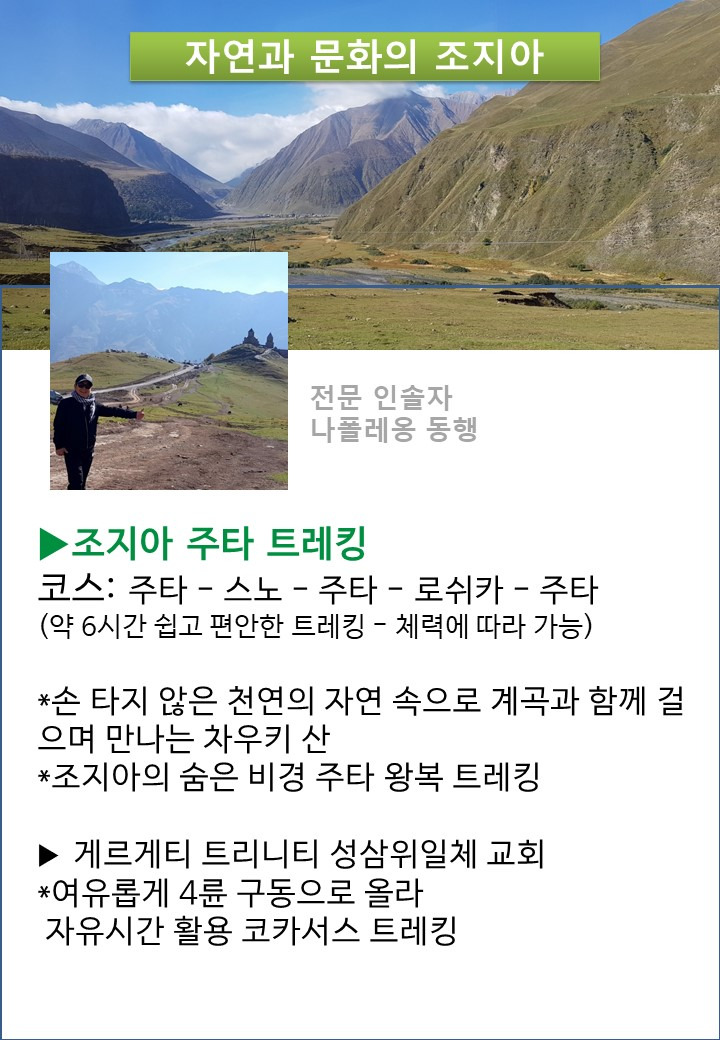 | 5일차 트빌리시 아나누리 주타 구다우리 | 호텔 조식후 아나누리로 이동 1시간 ▶ 아나누리 성 - 최초 13세기 건립된 아라그비 영주의 성 방문 코카서스에서 가장 아름다운 군사도로를 따라 이동 ▶ 주타 트래킹 - 스노 - 주타 - 로쉬카 - 주타 (약 6시간 쉽고 편안한 트레킹- 체력에 따라 가능) - 손 타지 않은 천연의 자연속으로 계곡과 함께 걸으며 만나는 차우키산 - 조지아의 숨은 비경 - 주타 왕복 트레킹 ▶조식 : 호텔식 / 중식 : 현지식 / 석식 : 현지식 ▶ 마르코 폴로 Marco Polo Hotel 구다우리 또는 동급 |