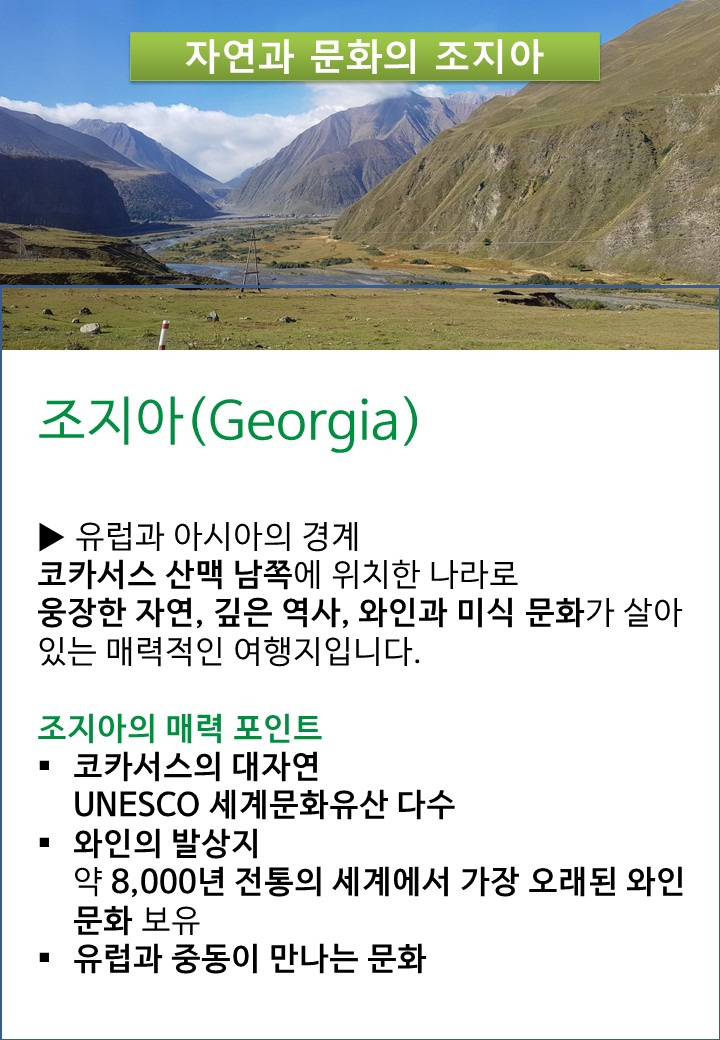 ◆ 아름다운 자연 경관: 조지아는 '동유럽의 스위스'라 불릴 만큼 아름다운 자연을 자랑합니다.