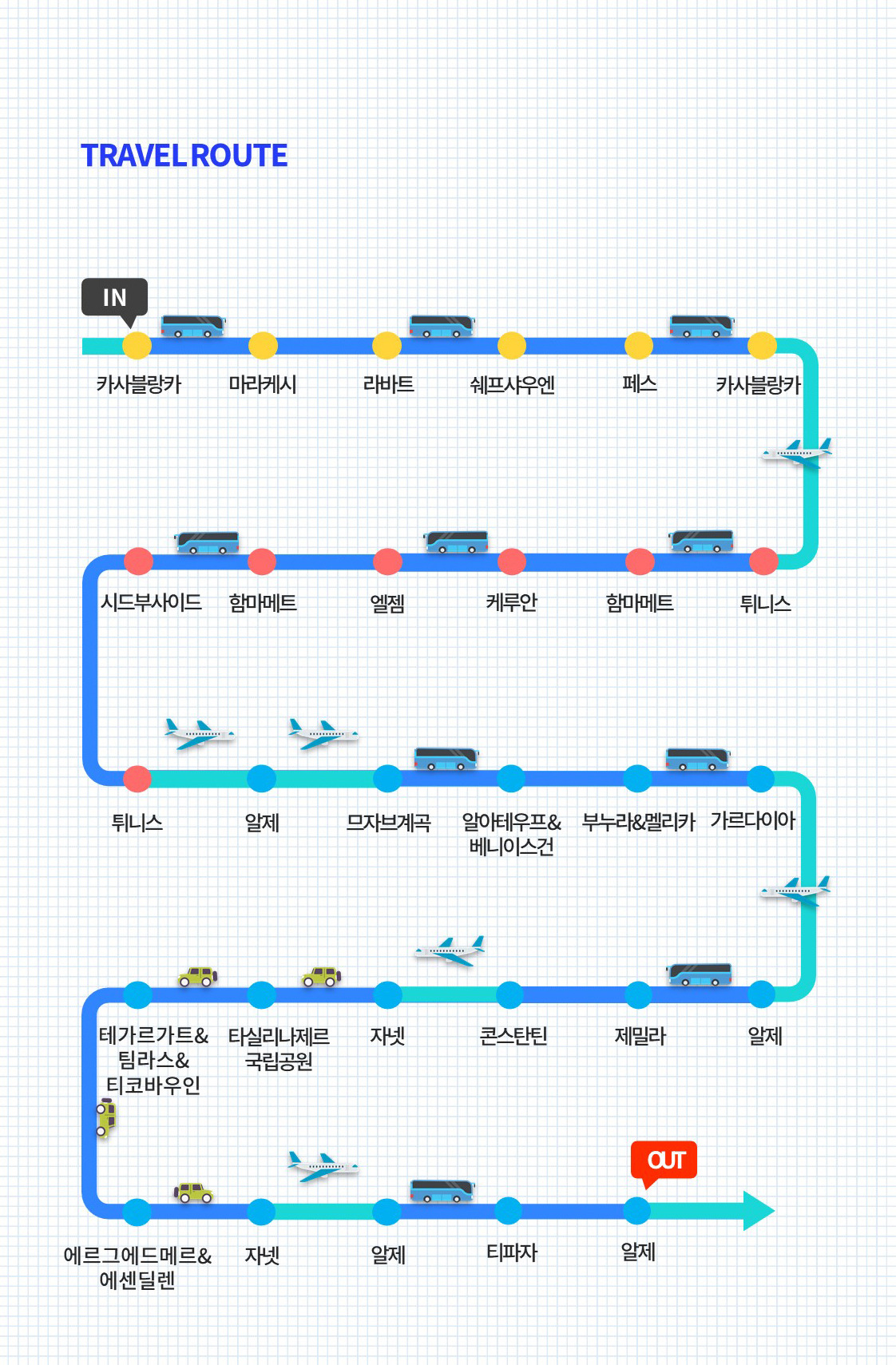 | 7일차 | 카사블랑카 ↓ 튀니스 ↓ 함마매트 | 전용차량 / 항공 | ▷ 호텔 조식 후 ■ 까사블랑카 투어 - 바다 위의 사원, 핫산 2세 사원(내부관람) - 모하마드 5세 광장 ▷ 공항 이동 14:15 카사블랑카 출발 (AT572) 17:20 튀니스 도착 ▷ 함마매트로 이동 후 휴식 | ||||