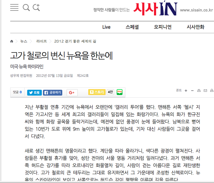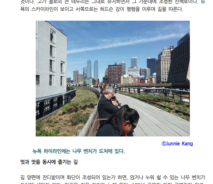 아래는 <시사IN>에 적었던 뉴욕 하이라인 관련 기사. 기사가 중간에 잘려서 아쉽지만 그래도 말하고 싶은 내용은 다 들어 있다. https://www.sisain.co.kr/?mod=news&act=articleView&idxno=13172