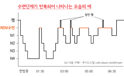 주소 글에 보셨듯이 수면단계 표를 보시면 렘수면기때 '잠깐 깨어남' 단계가 있습니다.
