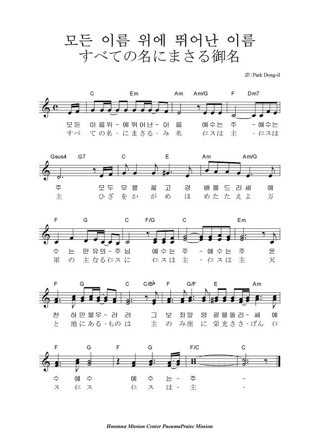 [ㅁ]모든 이름 위에 뛰어난 이름 / 全ての名に優る御名 - C 작성자석성주|작성시간10.12.25|조회수5,984 목록 댓글 0 글자크기 작게가 글자크기 크게가 SubetenoNaniMasaruMina.mp3음원은 코드가 다를 수 있습니다.협찬 - Hosanna Mission Center* 수정 및 무단 복제는 불법입니다. 하나님께 쓰여질 예배를 위한 도구로만 사용해 주세요. 첨부파일첨부된 파일이 2개 있습니다. jpg 파일 SubetenoNaniMasaruMina_C.jpg 다운로드 mp3 파일 SubetenoNaniMasaruMina.mp3 다운로드 다음검색 현재 게시글 추가 기능 열기 북마크 공유하기 신고 센터로 신고 댓글 댓글 0 댓글쓰기 답글쓰기 댓글 리스트