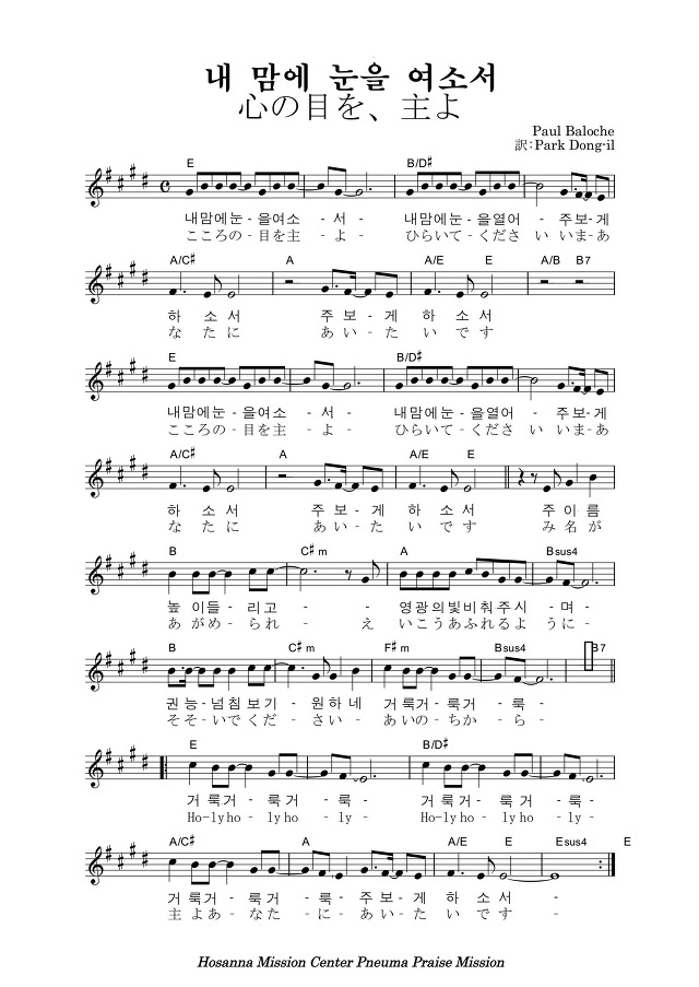 [ㄴ]내 맘에 눈을 여소서 / 心の目を主よ(Open The Eyes In My Heart) - E 작성자석성주|작성시간10.10.19|조회수1,541 목록 댓글 0 글자크기 작게가 글자크기 크게가 CocoronoMewoSyuyo.mp3음원은 코드가 다를 수 있습니다.일본어 발음 및 뜻 보러가기 클릭 !!찬양 영상 보러가기 클릭!!협찬 - Hosanna Mission Center* 수정 및 무단 복제는 불법입니다. 하나님께 쓰여질 예배를 위한 도구로만 사용해 주세요 첨부파일첨부된 파일이 2개 있습니다. jpg 파일 CocoronoMewoSyuyo_E.jpg 다운로드 mp3 파일 CocoronoMewoSyuyo.mp3 다운로드 다음검색 현재 게시글 추가 기능 열기 북마크 공유하기 신고 센터로 신고 댓글 댓글 0 댓글쓰기 답글쓰기 댓글 리스트