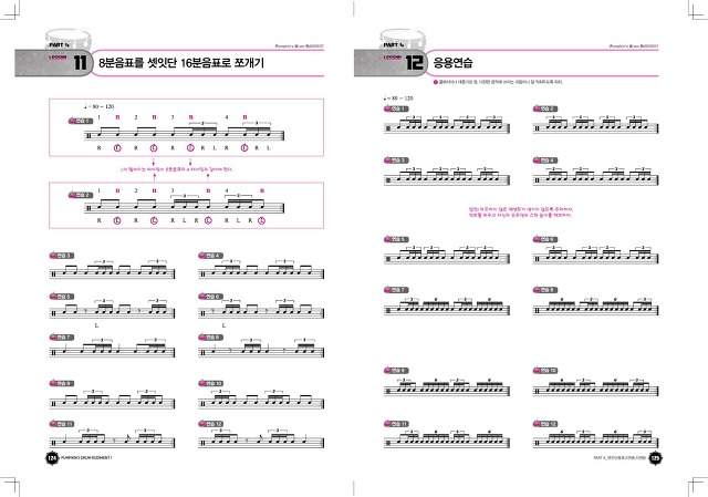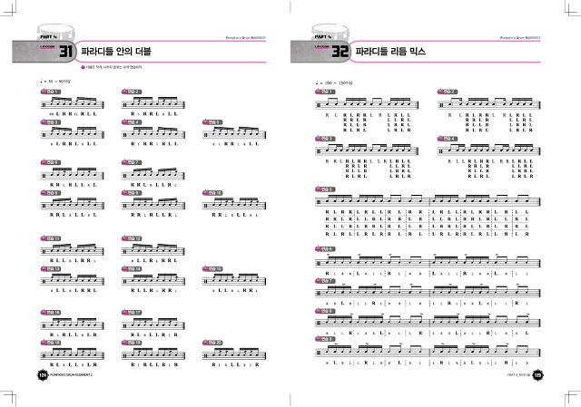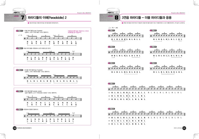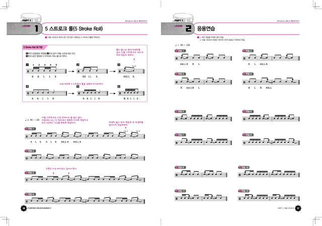 2권 더블 스트로크와 파라디들 편 : 더블 스트로크, 플램, 러프, 파라디들, 셔플(바운스), 5연음, 7연음, 버즈롤