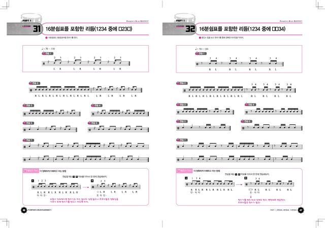 1권 싱글 스트로크와 악센트 편 : 트레이닝, 4분 ,8분, 16분음표, 8분의 6박, 엑센트, 3연음, 6연음, 32분음표