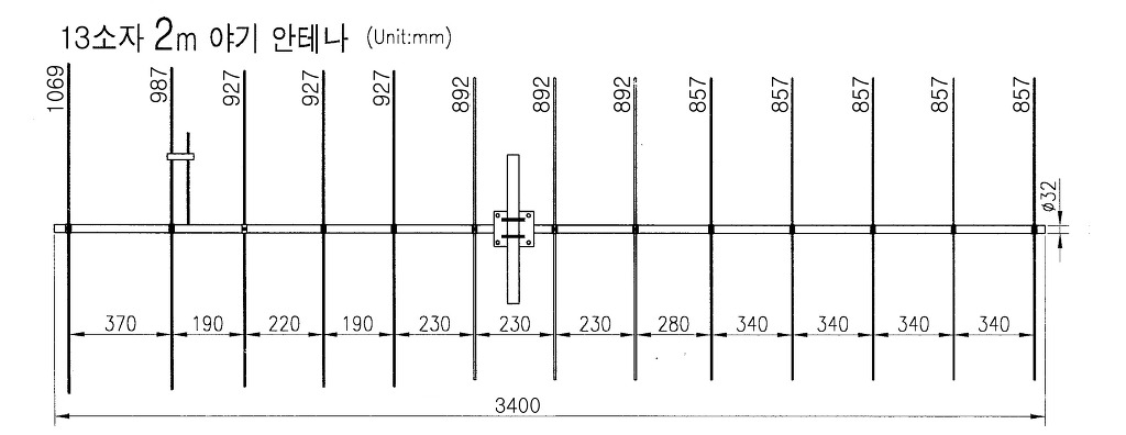 안테나 반사기 에서 마지막 도파기까지의 거리는 약 3m 40cm(안테나 길이임)