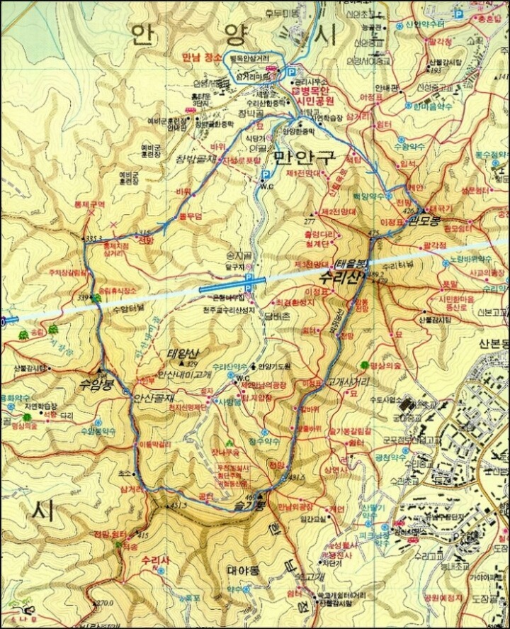 : {안양방면} 병목안시민공원→ 석탑→ 백영약수 터→ 관모봉→ 태을봉→ 수암봉→ 병목안시민 공원 (거리: 13.4km, 소요시간: 약 3시 간 30분)