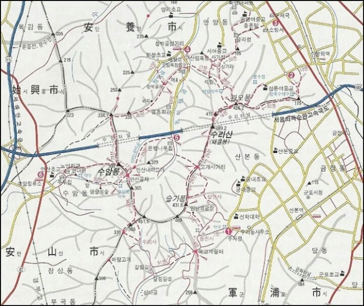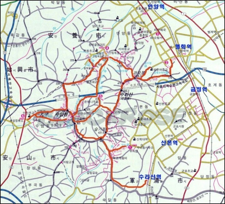 {군포방면} 수리산역→ 능선터널위→ 슬기봉→ 태 을봉→ 관음봉→ 수리약수터 (거리: 8.7km, 소요시간: 약 4시간 30 분)