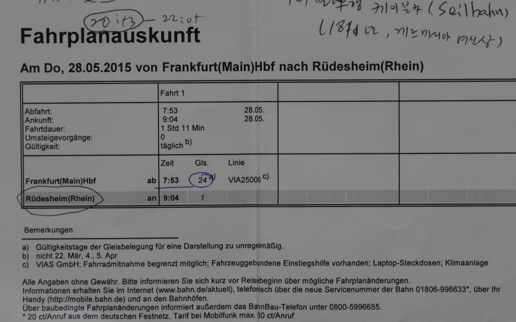프랑크프르트에서 뤄더스하임행 기차시간 안내(인폼센터 인쇄해줌)