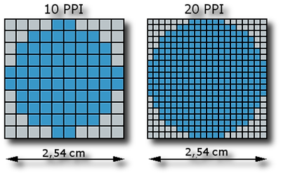 디스플레이의 해상도는 패널에 적용되는 가로세로 픽셀 숫자로 구분한다. PPI(Pixel Per Inch)로 표기하는 해상도는 가로세로 1인치의 넓이의 한 축에 픽셀이 몇 개 집적됐는지를 표기한다. 위 사진처럼 10PPI면 가로 10개, 총 68개의 픽셀이 배치된 것이고, 20PPI는 가로 20개, 총 316개의 픽셀이 배치된 것이다. 픽셀의 크기가 작으면 작을수록 화질이 좋다. 1920X1080 해상도는 픽셀이 가로 1920개, 세로 1080개로 총 207만여 개의 픽셀이 적용된 것이라고 보면 된다.