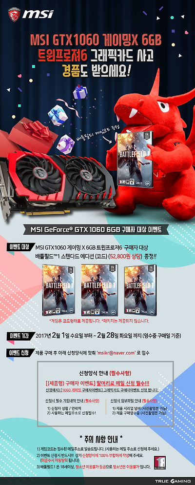 이번 행사는 업계 단독으로 진행되며, 오는 28일까지 2월 한 달간 구매한 고객을 대상으로 ‘배틀필드1’을 1대1로 제공한다. ‘배틀필드1’은 게임 코드 형태로 증정하며, 코드를 받기 위해서는 ‘MSI 지포스 GTX1060 게이밍X 6GB 트윈프로져6’를 구입한 후 신청양식에 맞춰 메일을 작성 후 ‘msikr@naver.com’ 메일로 발송하면 된다. 신청양식은 참여자 이름, 연락처, 시리얼 넘버(사진 촬영본), 구매 영수증(사진 촬영 또는 캡쳐본 가능)을 포함한다. 내용이 확인되면 게임 코드는 접수된 메일 주소로 발송된다.