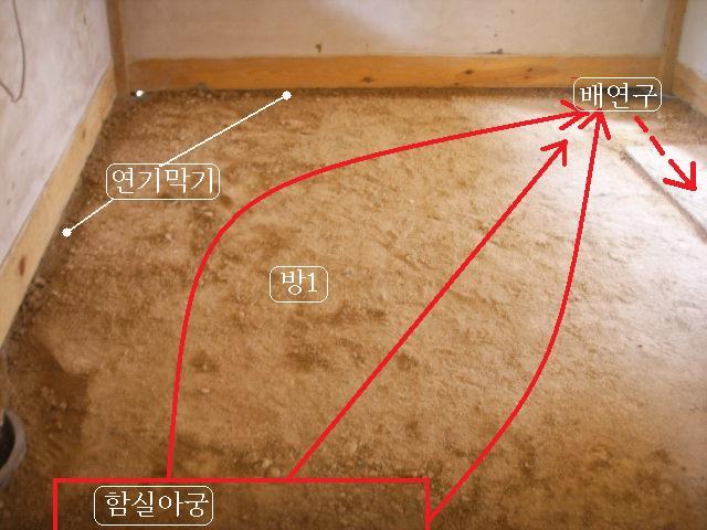 아궁에서 화력이 고래속으로 잘 들어 가지도 않거니와 방 양측면으로 불을 펴기는 너무나 어렵다.