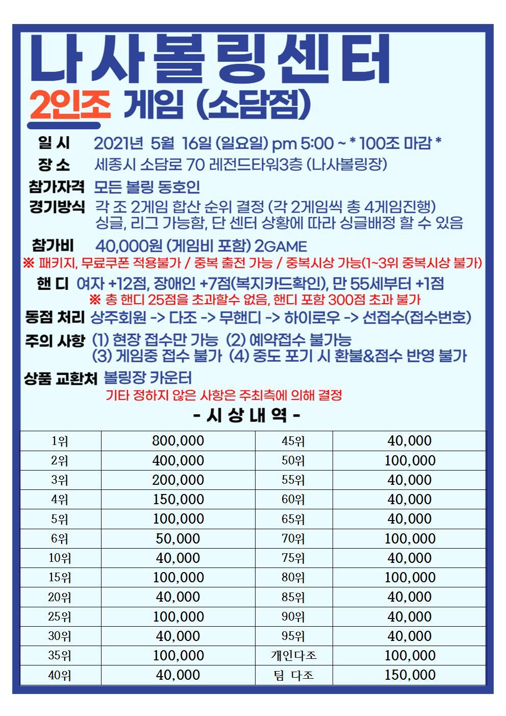 ★나사볼링장 5/16일 소담점 2인조 이벤트게임★ 작성자양병준|작성시간21.05.12|조회수558 목록 댓글 0 글자크기 작게가 글자크기 크게가 다음검색 현재 게시글 추가 기능 열기 북마크 공유하기 신고 센터로 신고 댓글 댓글 0 댓글쓰기 답글쓰기 댓글 리스트