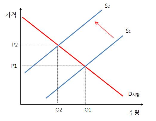 최초로 수요(D)와 공급(S1)이 균형을 이루는 교차점(Q1)에서 가격( P1 )이 형성되고 시장은 안정을 유지한다. 그런데, 수요는 변함없는데 공급이 부족해지면 공급선은 S1에서 S2로 이동하면서 가격을 P1에서 P2로 올리는 작용을 하고 극심한 경우에는 가격 파동을 일으킨다. 또 공급은 변함없는데 수요가 증가해도 마찬가지로 가격은 올라간다. 반대 현상으로 공급이 늘거나 수요가 줄면 가격이 내려가게 되어 아래와 같은 4가지 형태의 가격 변화 현상이 일어난다.