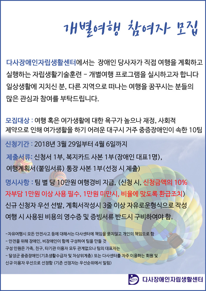 개별여행 프로그램 참여자 모집 작성자다사장애인자립생활센터|작성시간18.03.29|조회수67 목록 댓글 0 글자크기 작게가 글자크기 크게가 [다사센터] _ 개별여행 참여신청서.hwp [서식]_여행계획서(신청자용).hwp 첨부파일첨부된 파일이 3개 있습니다. jpg 파일 홍보지.jpg 다운로드 hwp 파일 [다사센터] _ 개별여행 참여신청서.hwp 다운로드 hwp 파일 [서식]_여행계획서(신청자용).hwp 다운로드 다음검색 현재 게시글 추가 기능 열기 북마크 공유하기 신고 센터로 신고 댓글 댓글 0 댓글쓰기 답글쓰기 댓글 리스트