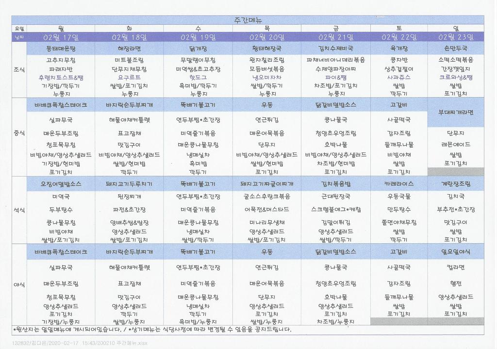 주간메뉴(02.17~02.23) 작성자김다은|작성시간20.02.14|조회수59 목록 댓글 0 글자크기 작게가 글자크기 크게가 다음검색 현재 게시글 추가 기능 열기 북마크 공유하기 신고 센터로 신고 댓글 댓글 0 댓글쓰기 답글쓰기 댓글 리스트