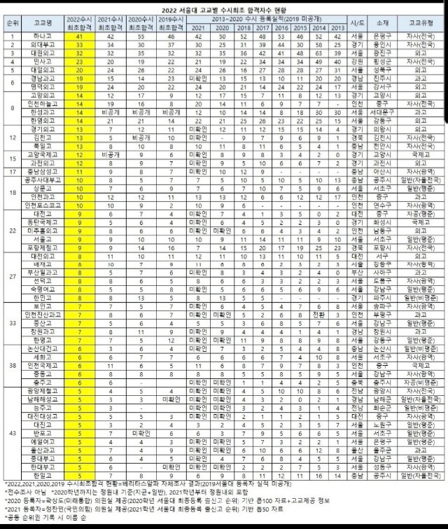 2022년 서울대학교 수시 최초 합격 고등학교 순위 작성자정하나|작성시간21.12.20|조회수6,362 목록 댓글 2 글자크기 작게가 글자크기 크게가 2022학년도 서울대학교 수시 최초 합격자 고교 순위전수조사는 아닙니다. 고3학부모님 중에서 안산동산고 서울대학교수시실적 아시면 댓글 부탁합니다. 다음검색 현재 게시글 추가 기능 열기 북마크 공유하기 신고 센터로 신고 댓글 댓글 2 댓글쓰기 답글쓰기 댓글 리스트 작성자살며 사랑하며 | 작성시간 21.12.21 더 있겠지만, 아이가 후배한테 문과 1명 합격소식 들었다네요. 작성자헤네시 | 작성시간 22.01.22 7명있다들었습니다. 댓글 전체보기
