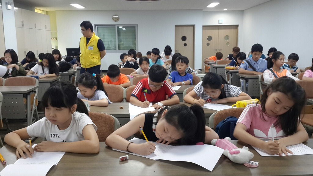 글짓기에 열중하는 어린이들 생각이 깊어보인다