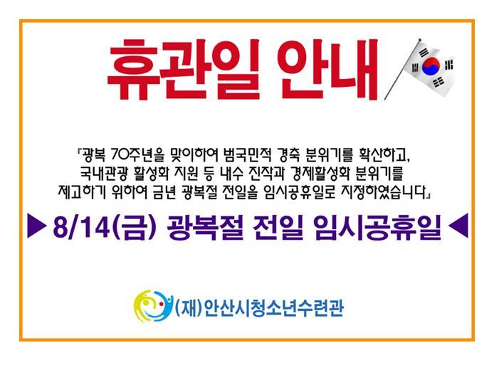 8월 14일 임시공휴일 지정에 따른 휴관안내 작성자이협승|작성시간15.08.08|조회수4 목록 댓글 0 글자크기 작게가 글자크기 크게가 다음검색 현재 게시글 추가 기능 열기 북마크 공유하기 신고 센터로 신고 댓글 댓글 0 댓글쓰기 답글쓰기 댓글 리스트