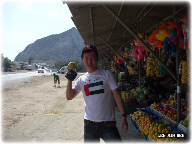 우!~ 푸자이라의 특1급 호텔들을 향해서 가는 중 ㅋㅋㅋ 이곳은 중간중간 이렇게 과일이나 카펫 파는 곳들이 즐비하다. ㅋㅋ