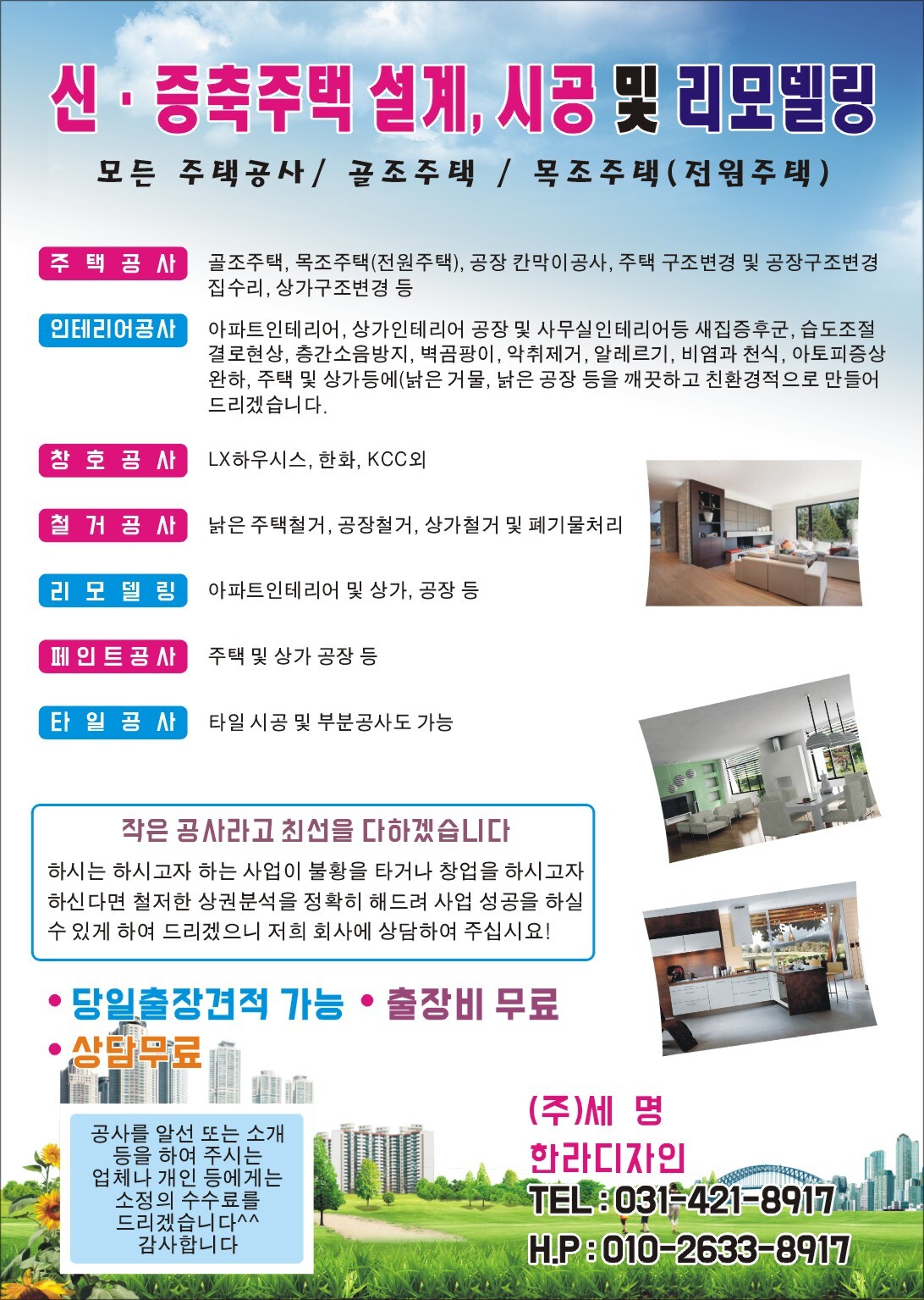 안녕하세요..^^ 인테리어 업체 한라디자인 입니다.저희 업체는 신.증축, 리모델링,구경하는집,이노베이션, 확장공사,샷시.철거를 전문으로 하고있습니다.언제든지 전화주시면 무료 방문 견적을 해드립니다.http://blog.naver.com/opko773 견적문의 환영H.P:010-2633-8917