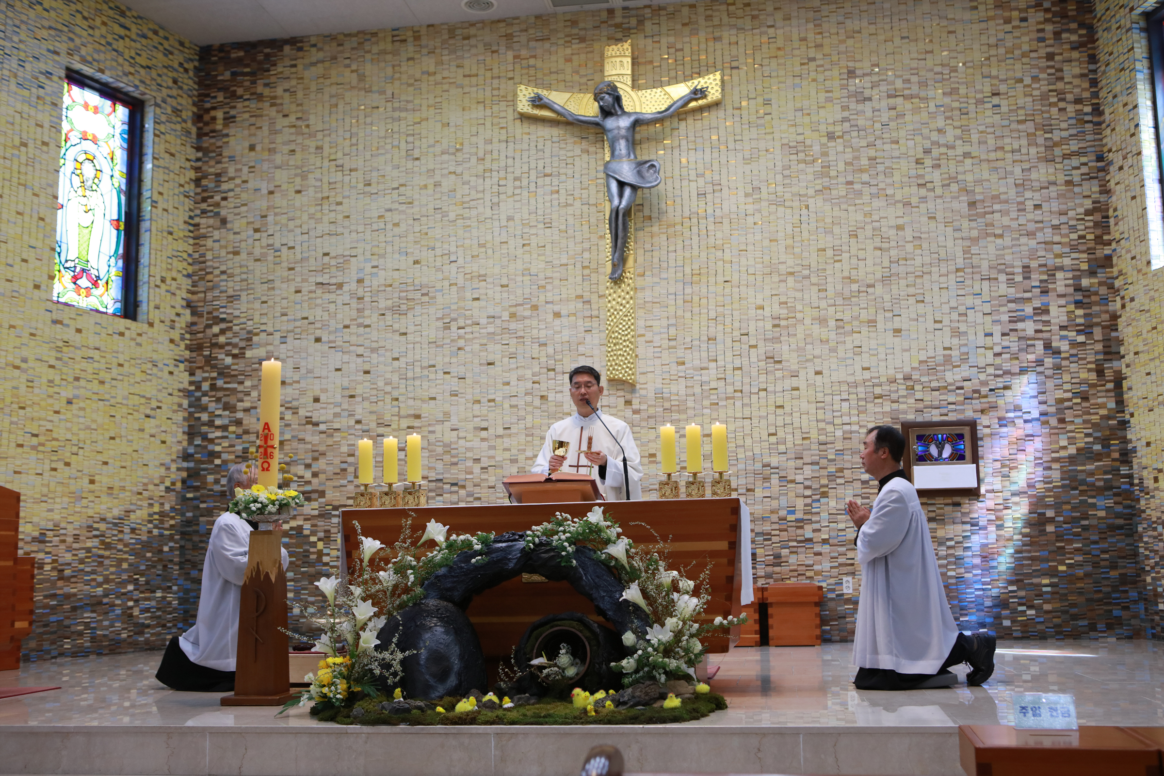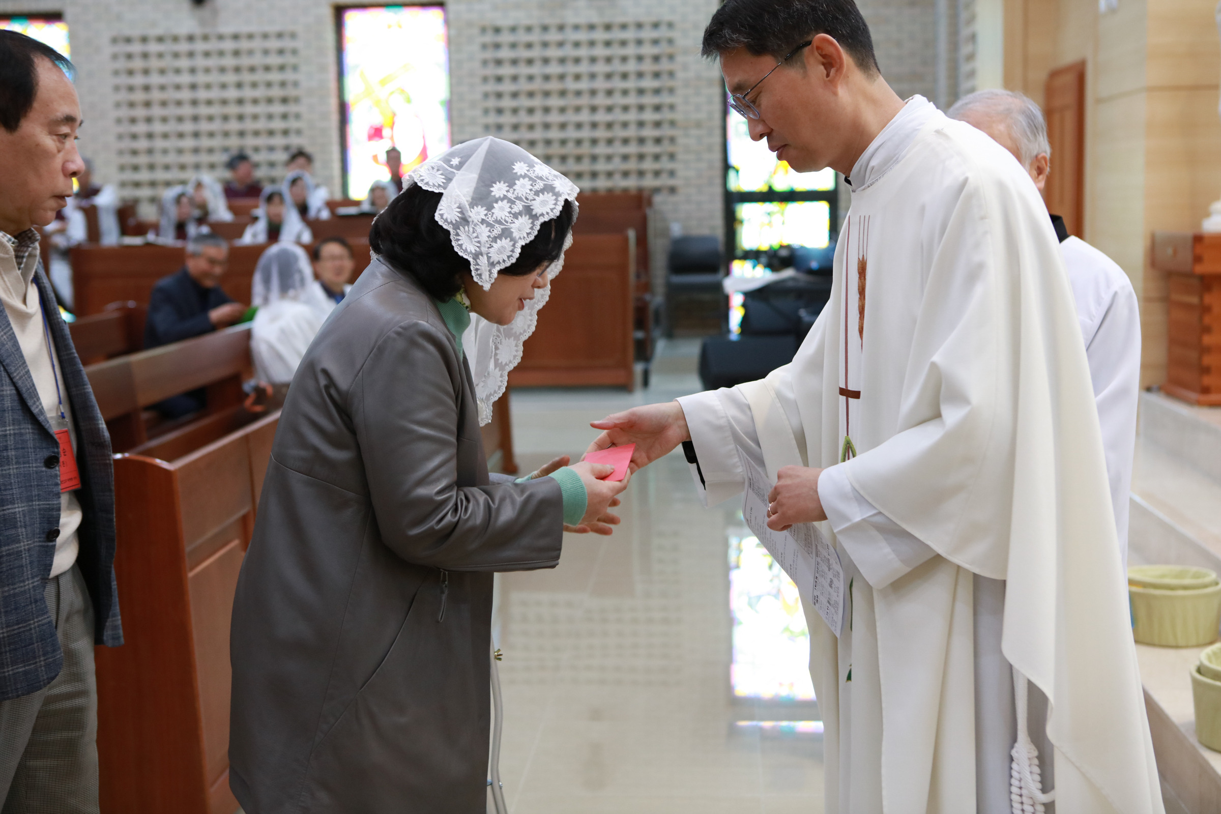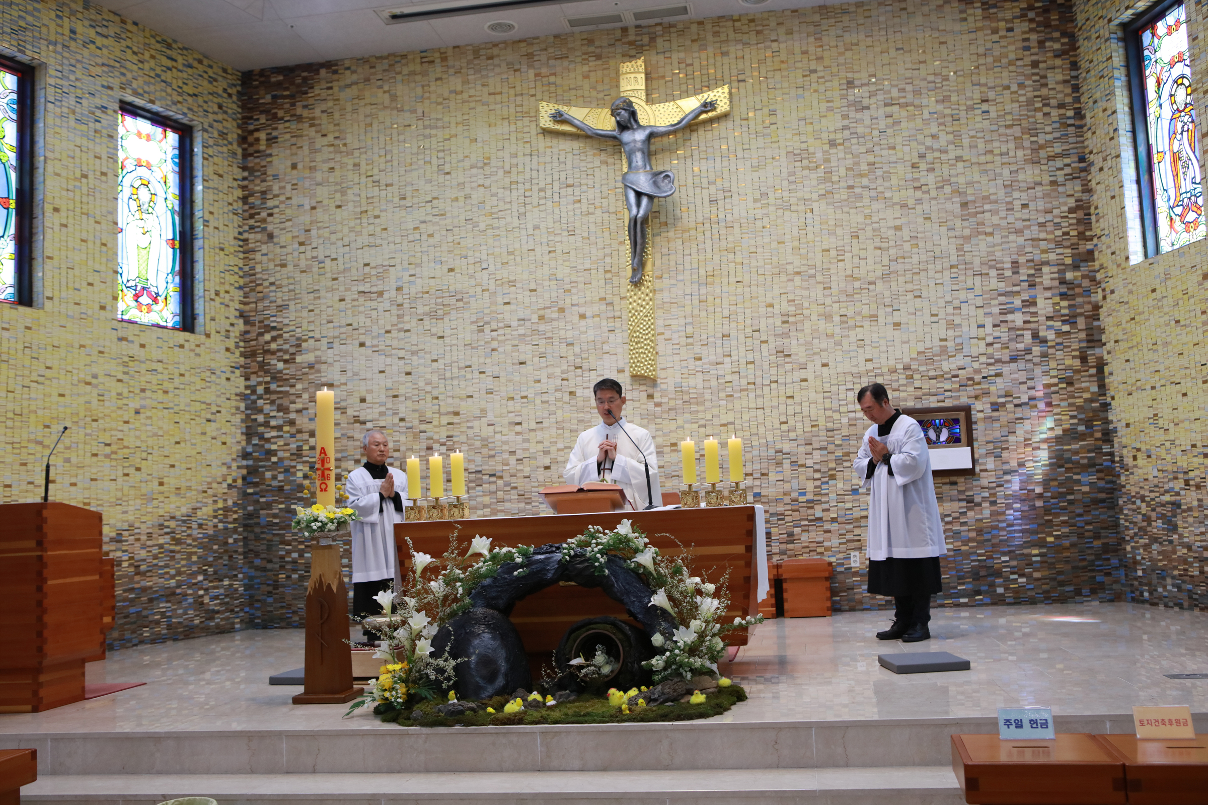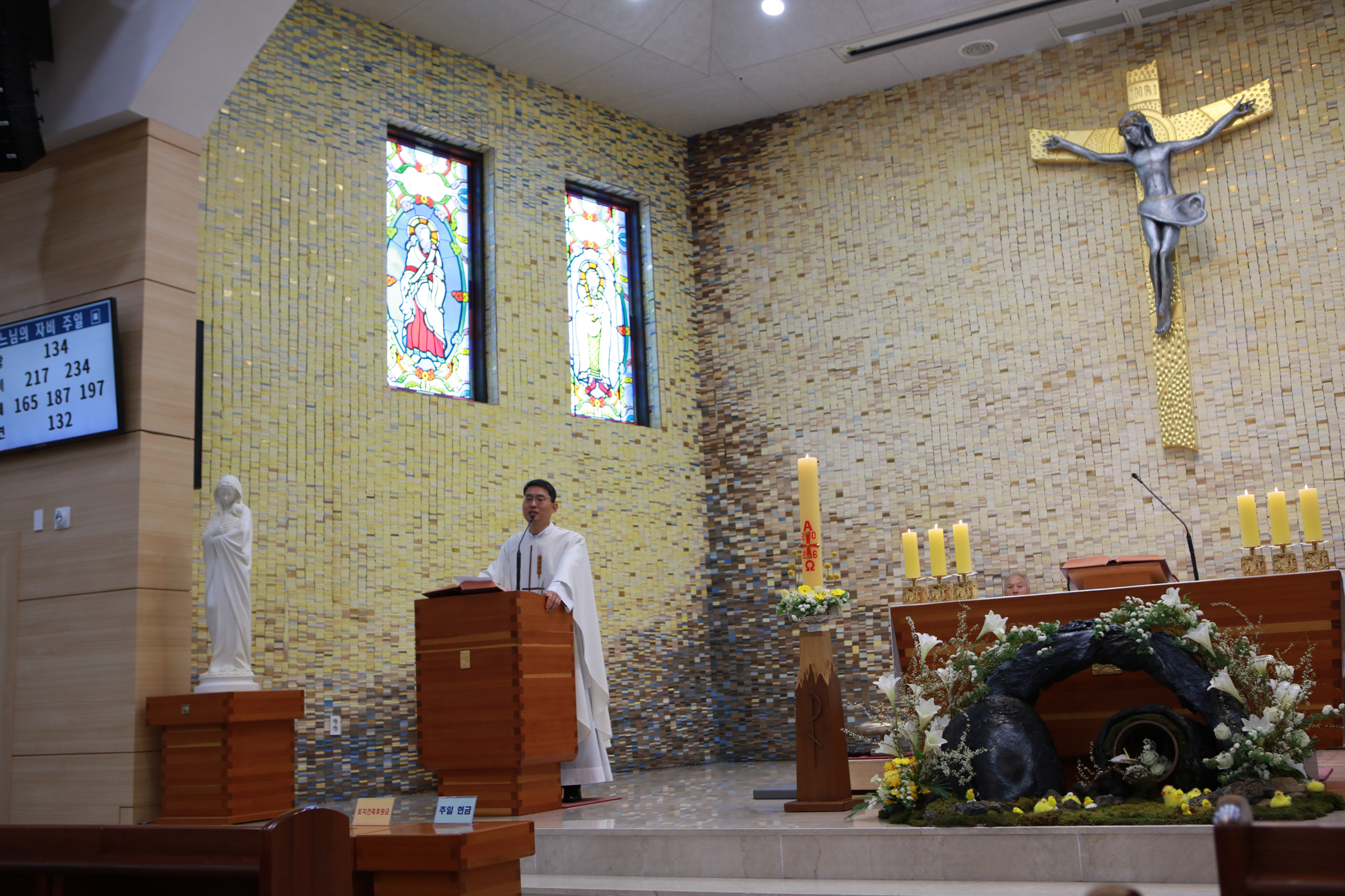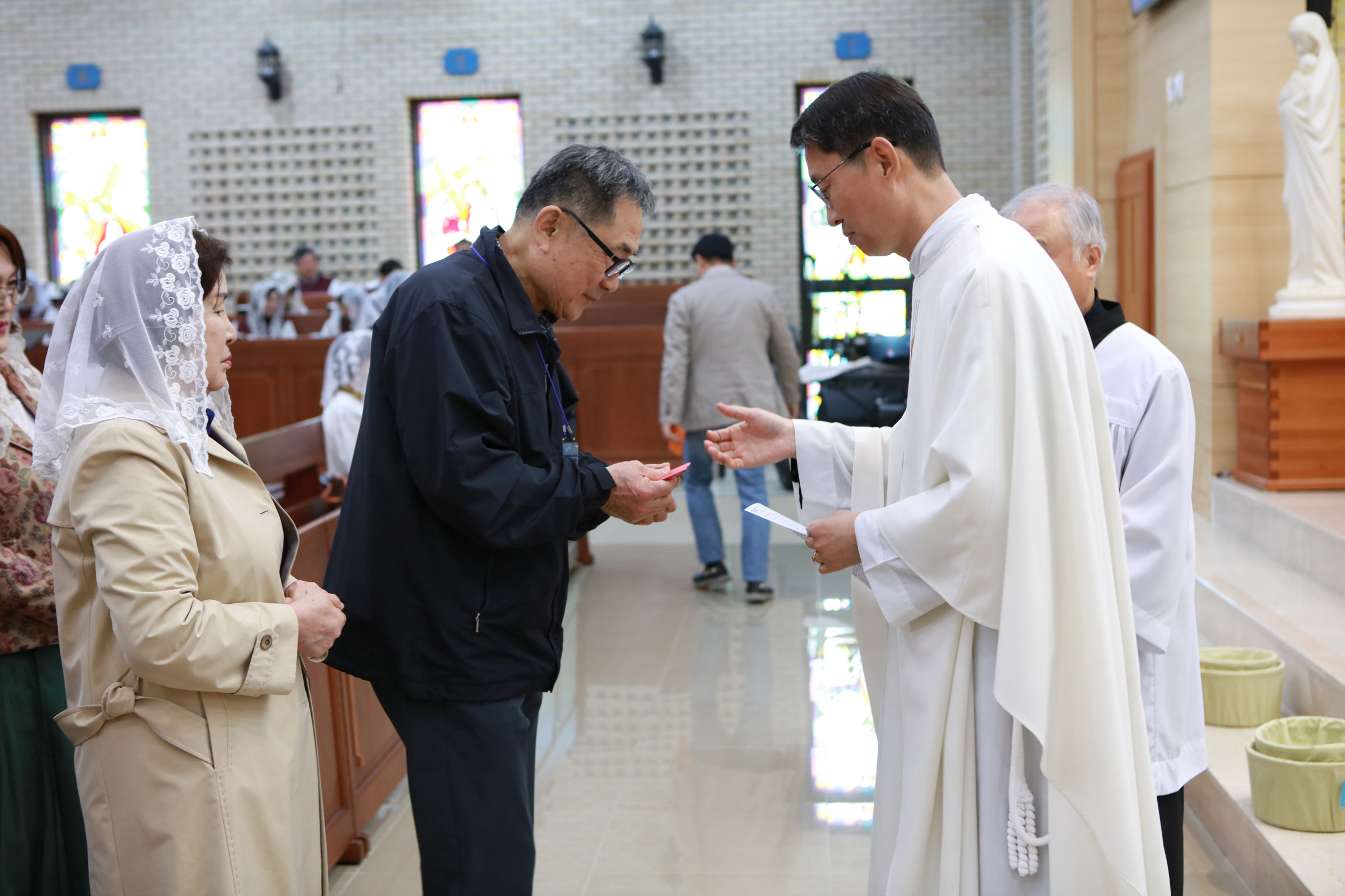 4월 12일 (주일) 오전 10시 30분 김영직 사도 요한 주임신부님 주례로 “하느님의 자비 주일” 미사를 봉헌했습니다. 강론에서 ‘오시어 가운데 서시며 “ 평화가 너희와 함께” 하고’ 함께함을 강조했습니다. 물동이 문제를 풀고 실천한 69명에게 나무로 손수 만드신 성경구 책갈피를 부상하고 로마서 필사를 치하했습니다. 미사 후 성전 입구에서 4 구역 봉사 차 나눔을, 105호실에서 사목회를 했습니다.