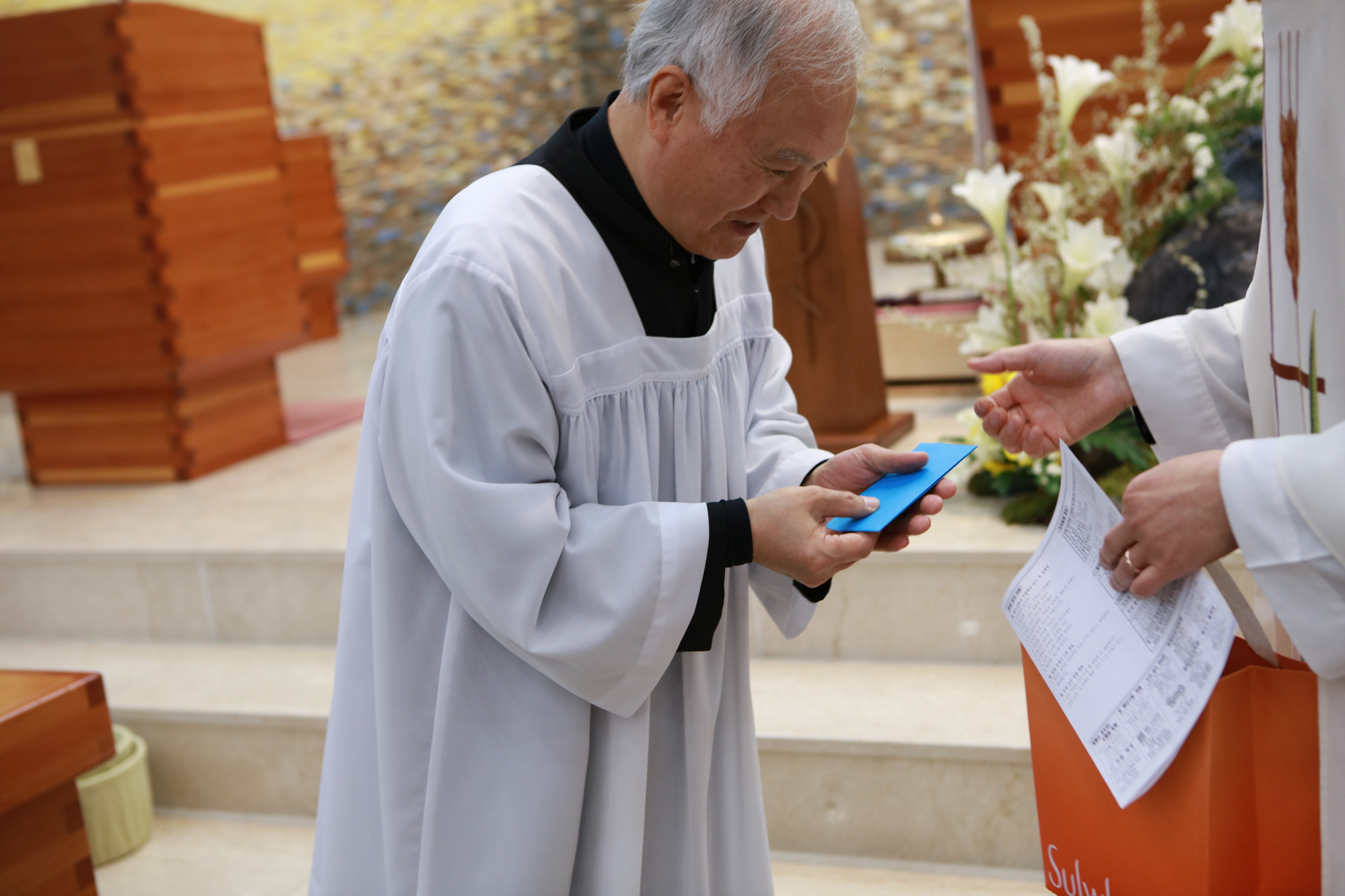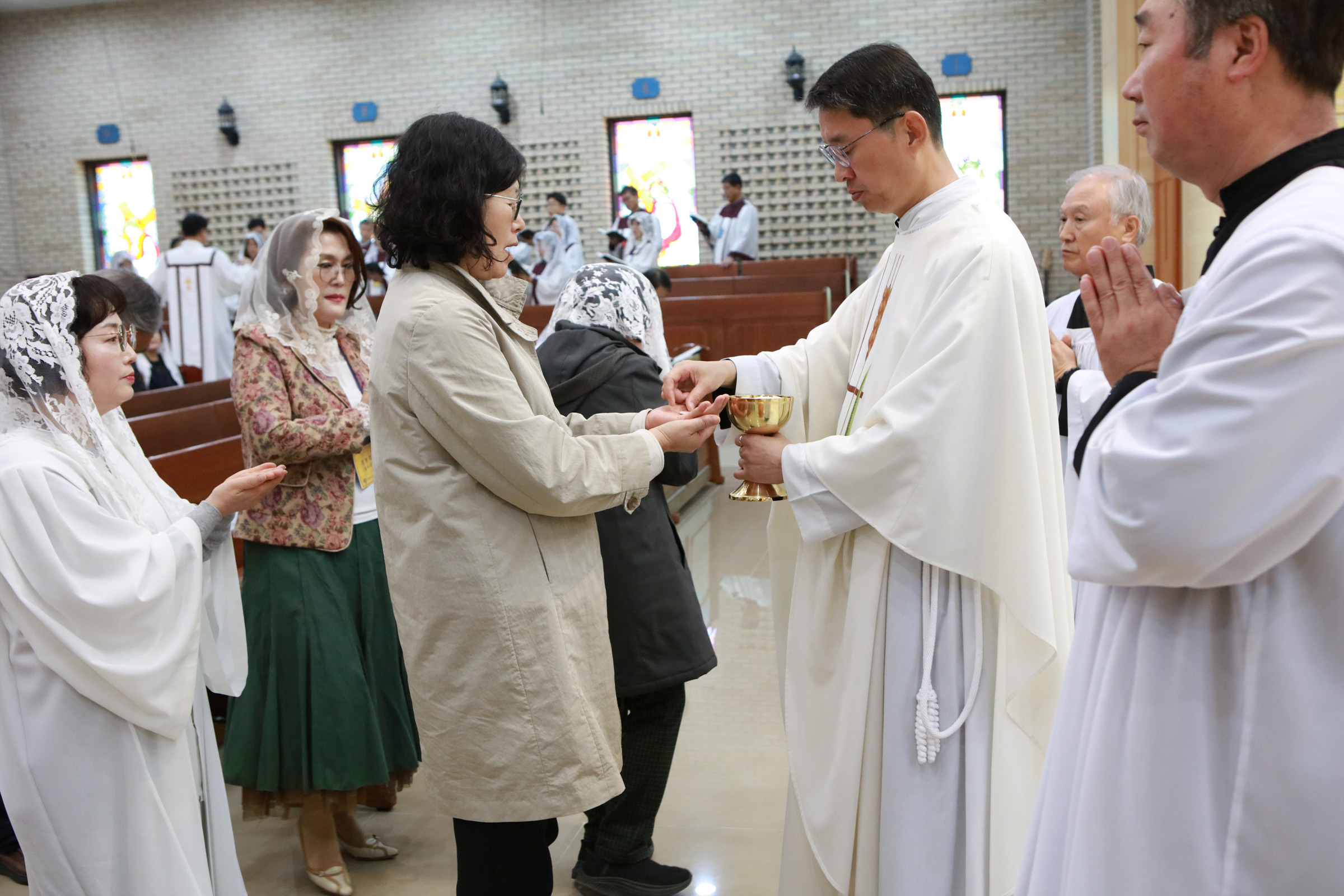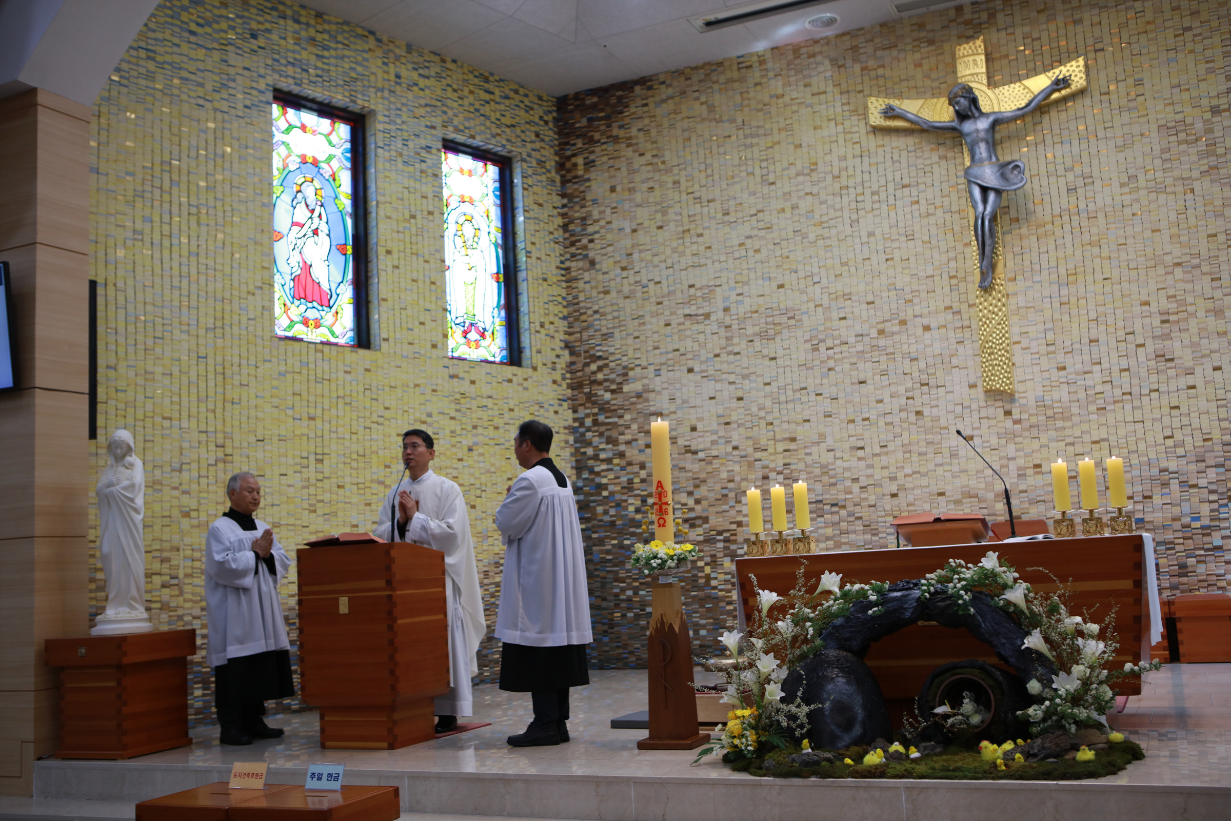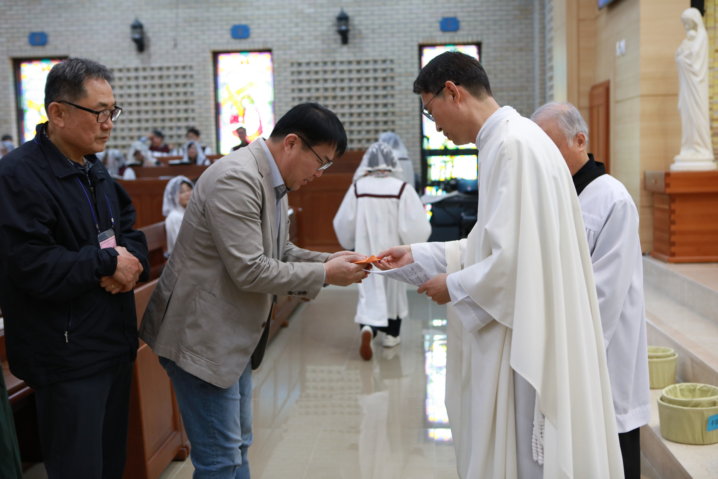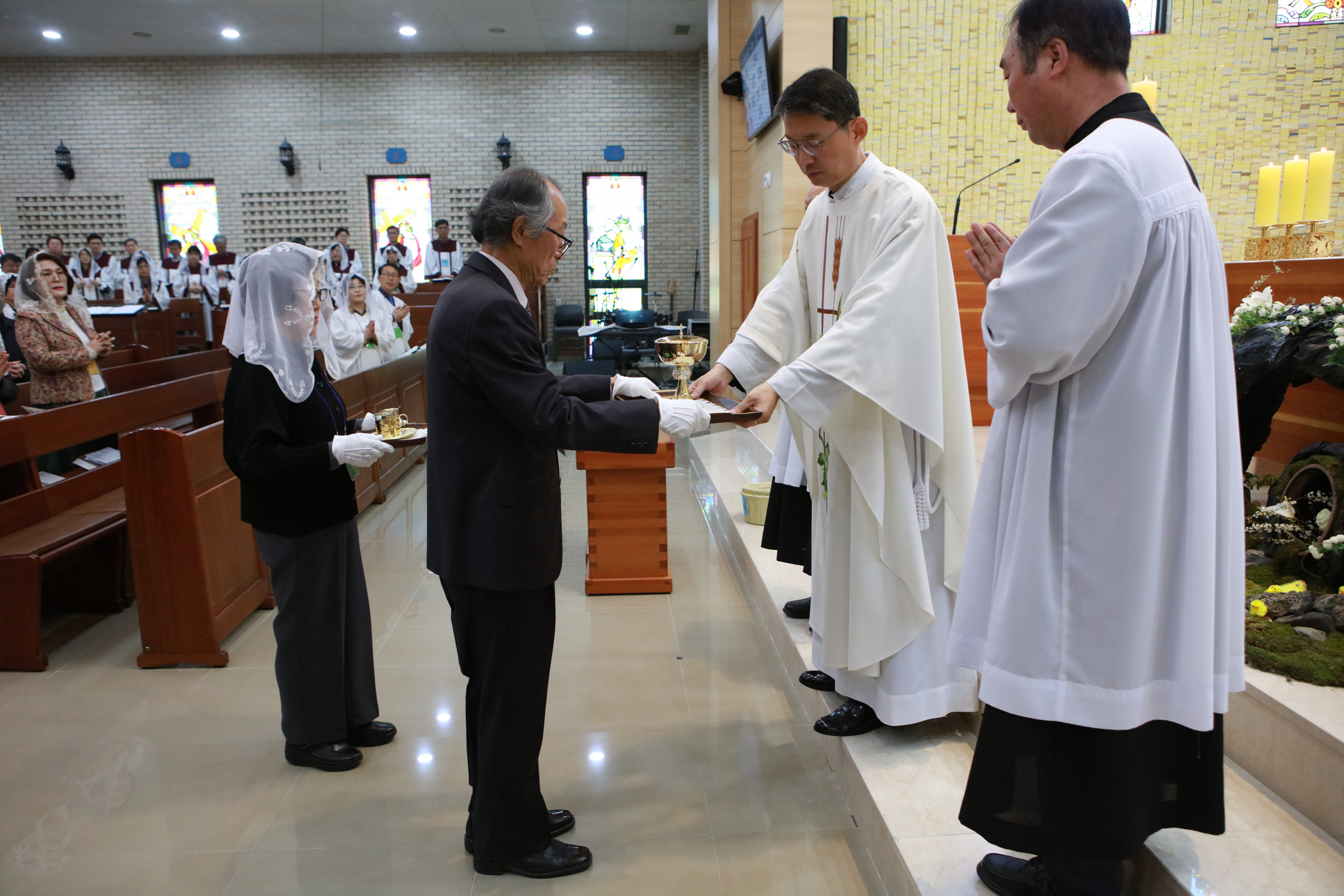 4월 12일 (주일) 오전 10시 30분 김영직 사도 요한 주임신부님 주례로 “하느님의 자비 주일” 미사를 봉헌했습니다. 강론에서 ‘오시어 가운데 서시며 “ 평화가 너희와 함께” 하고’ 함께함을 강조했습니다. 물동이 문제를 풀고 실천한 69명에게 나무로 손수 만드신 성경구 책갈피를 부상하고 로마서 필사를 치하했습니다. 미사 후 성전 입구에서 4 구역 봉사 차 나눔을, 105호실에서 사목회를 했습니다.