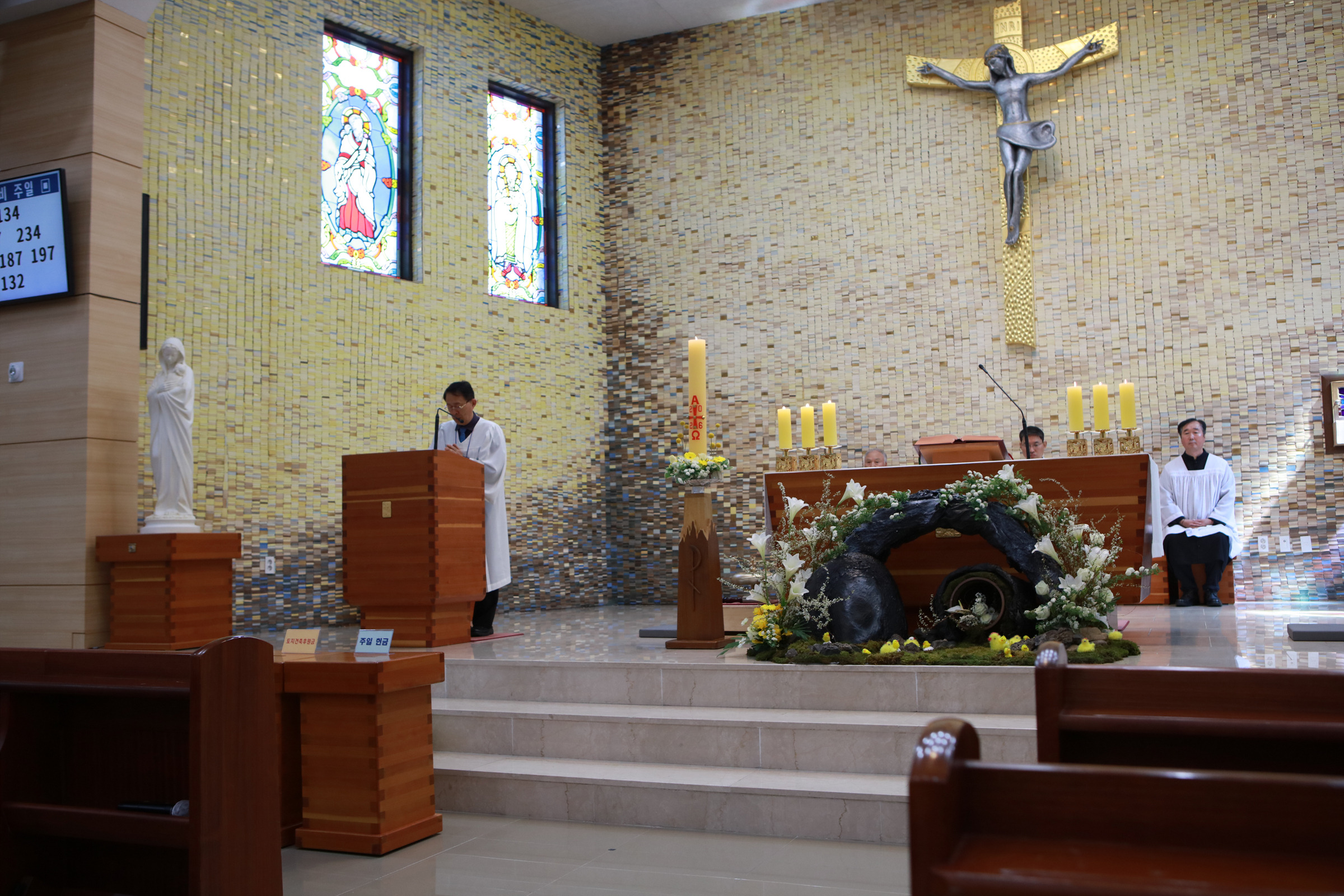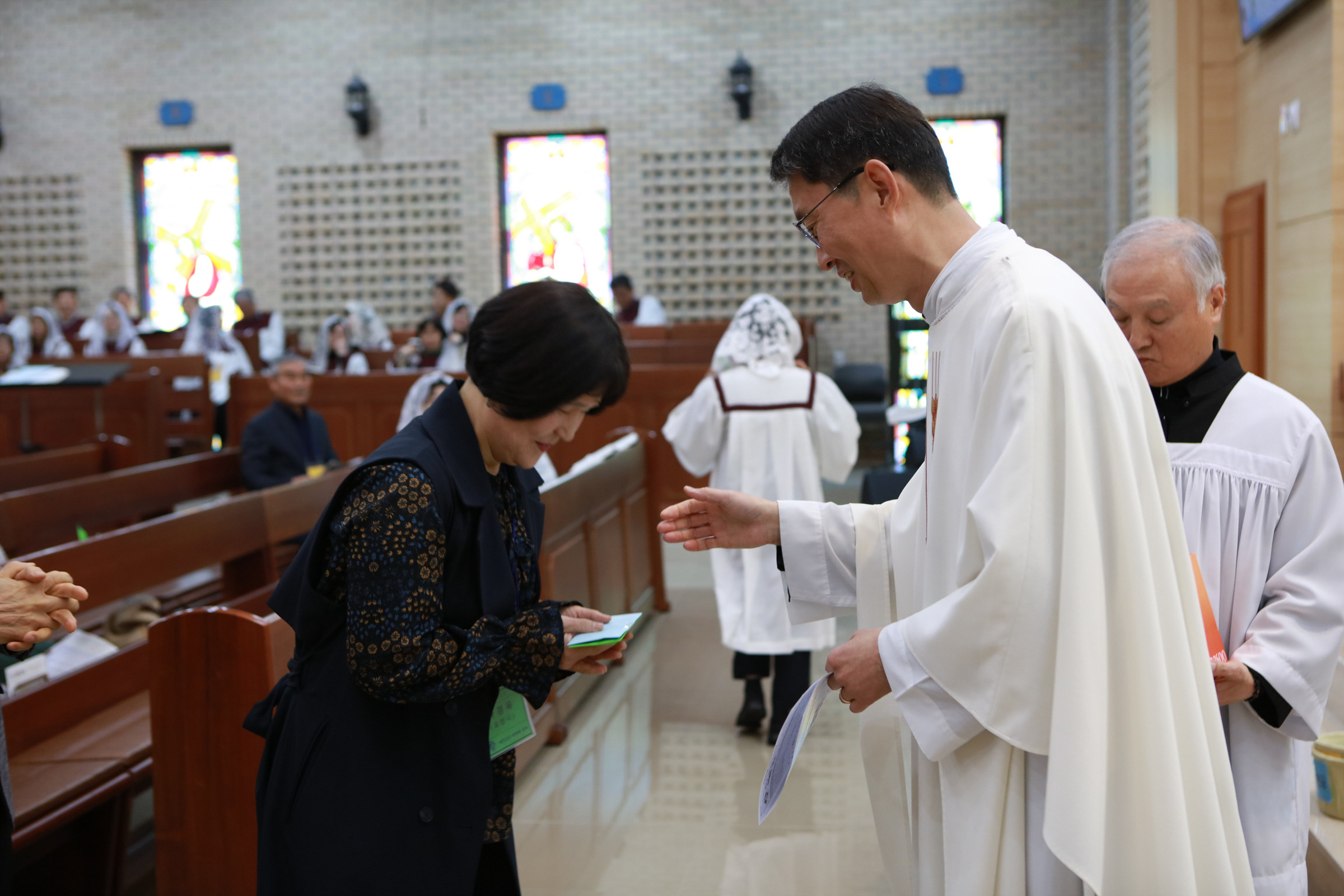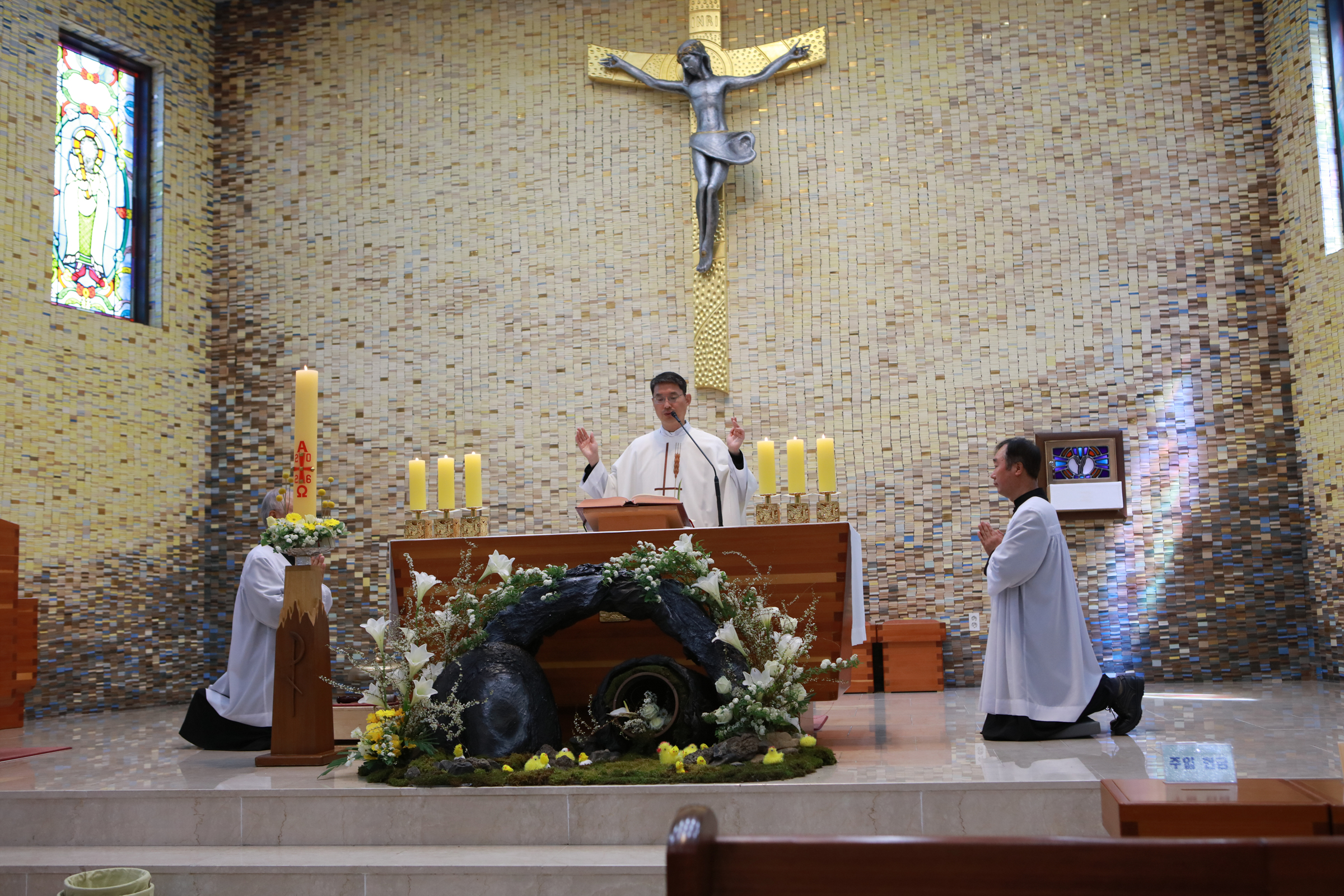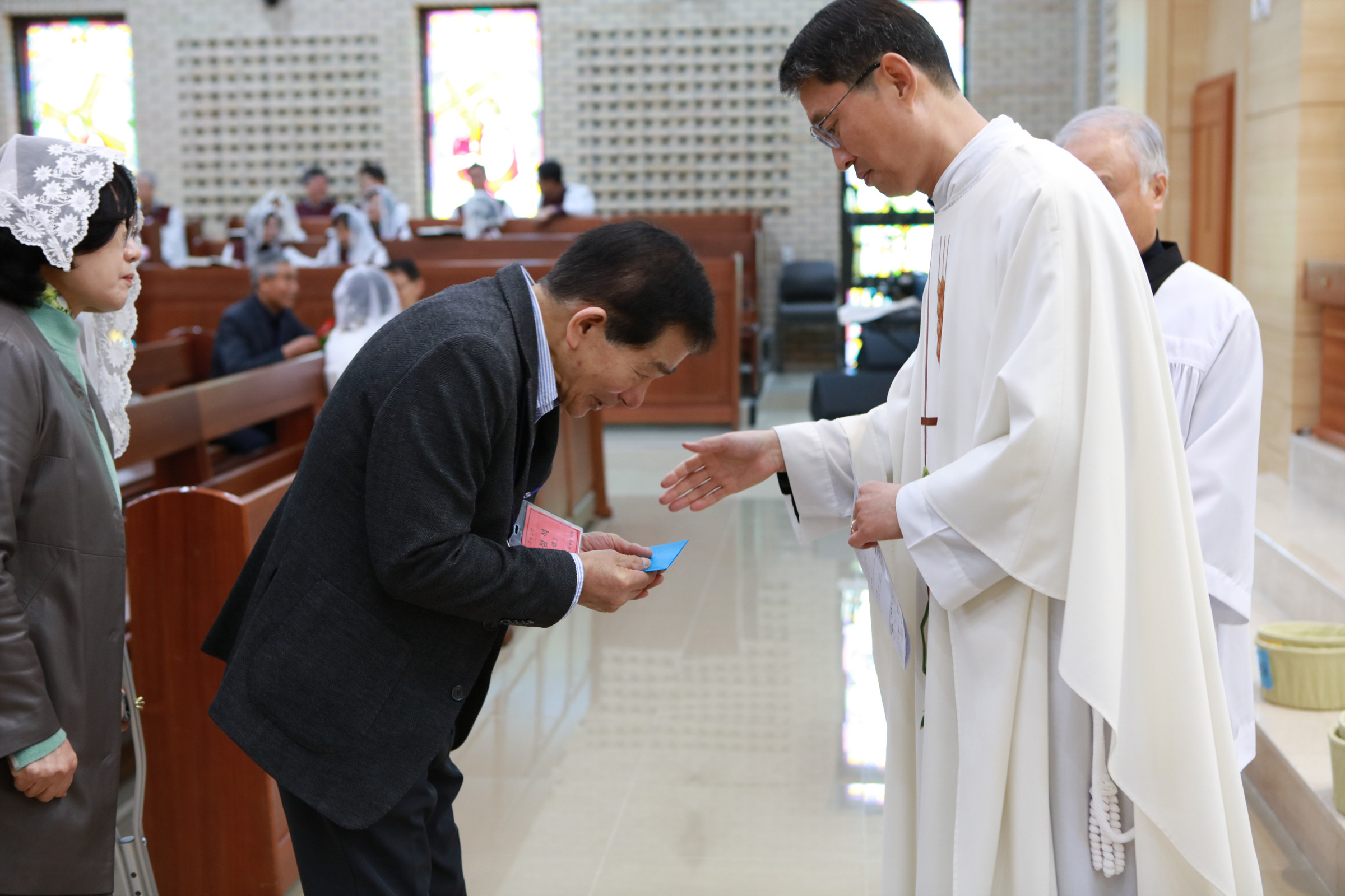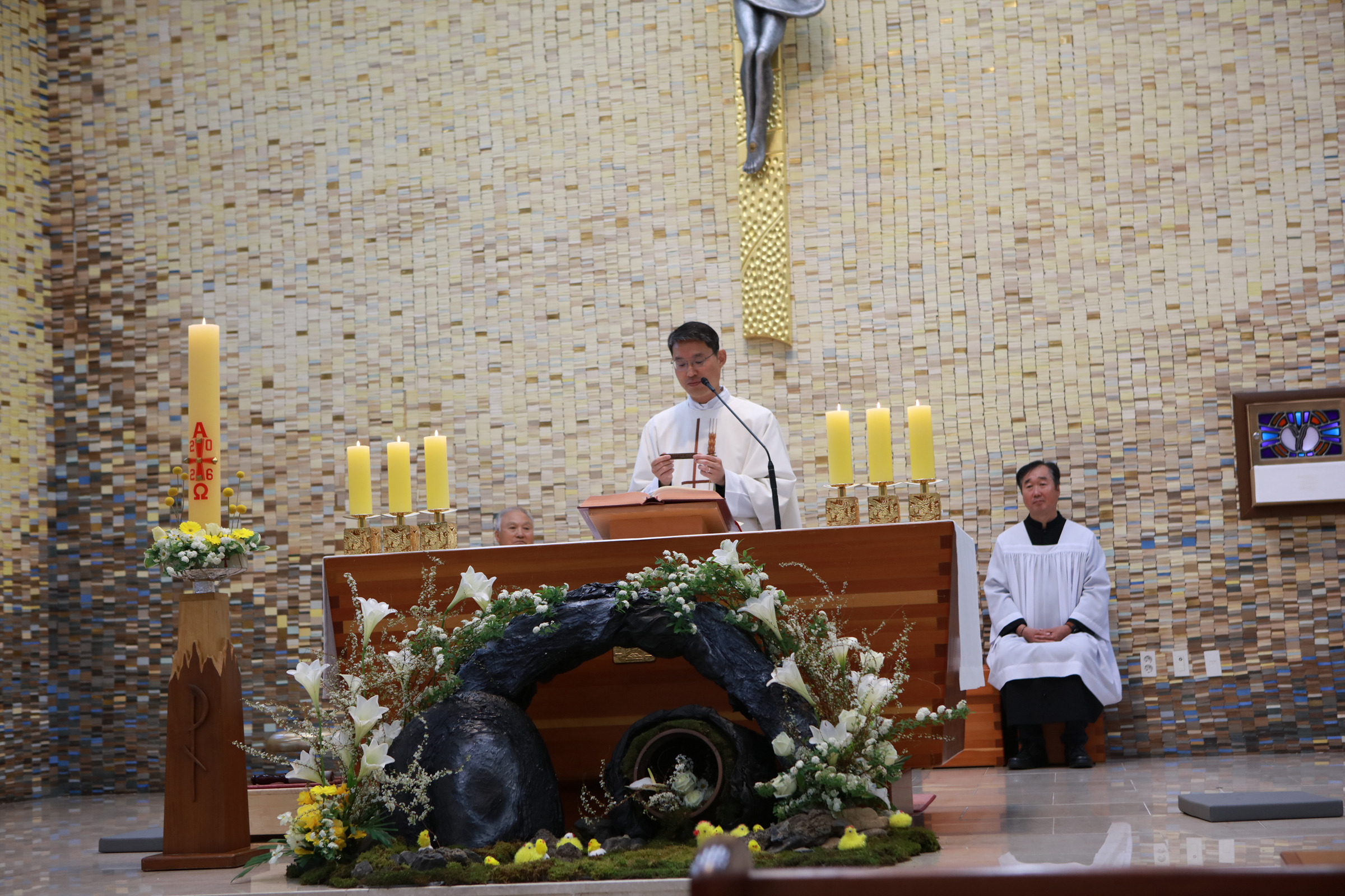 4월 12일 (주일) 오전 10시 30분 김영직 사도 요한 주임신부님 주례로 “하느님의 자비 주일” 미사를 봉헌했습니다. 강론에서 ‘오시어 가운데 서시며 “ 평화가 너희와 함께” 하고’ 함께함을 강조했습니다. 물동이 문제를 풀고 실천한 69명에게 나무로 손수 만드신 성경구 책갈피를 부상하고 로마서 필사를 치하했습니다. 미사 후 성전 입구에서 4 구역 봉사 차 나눔을, 105호실에서 사목회를 했습니다.