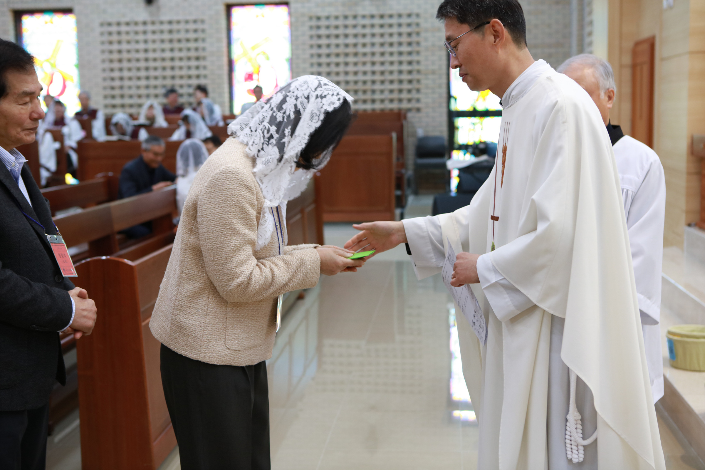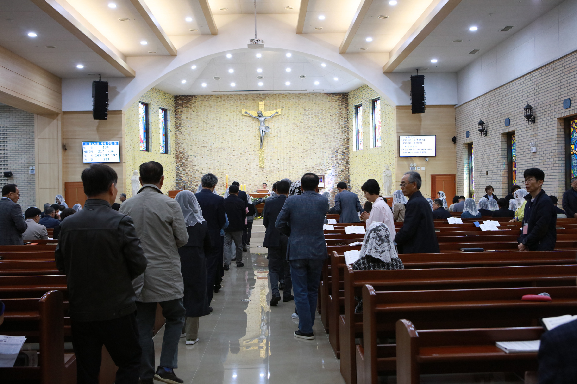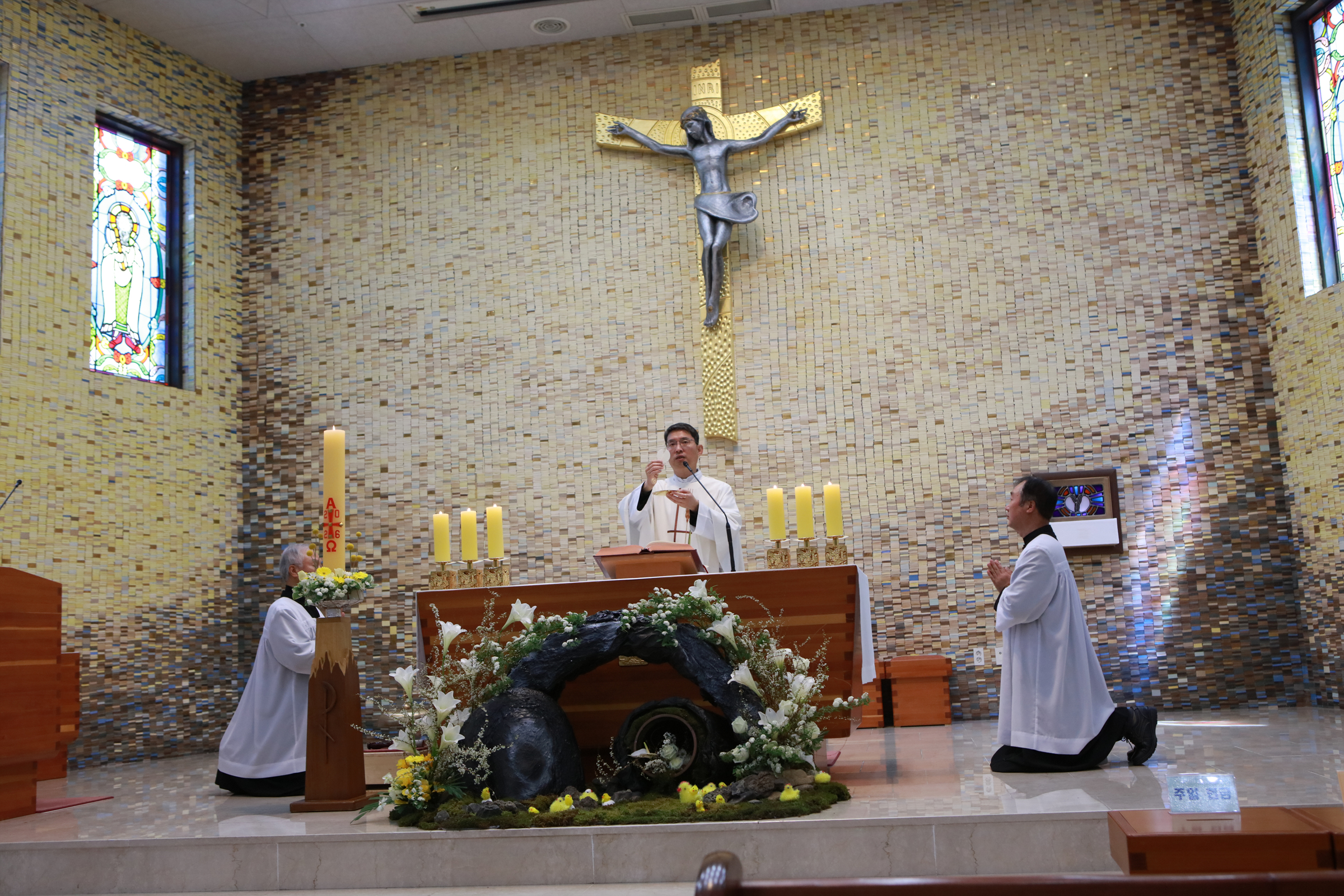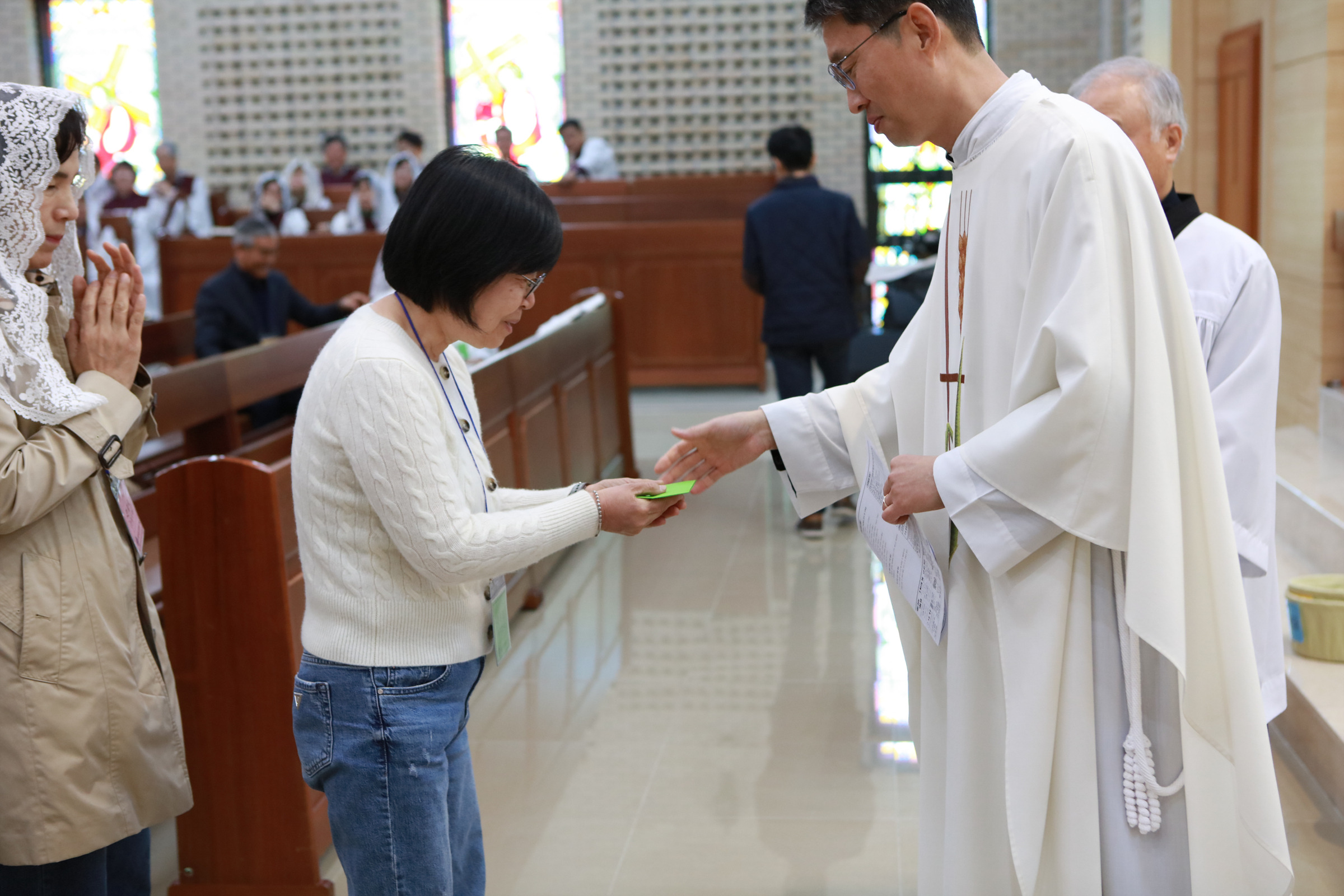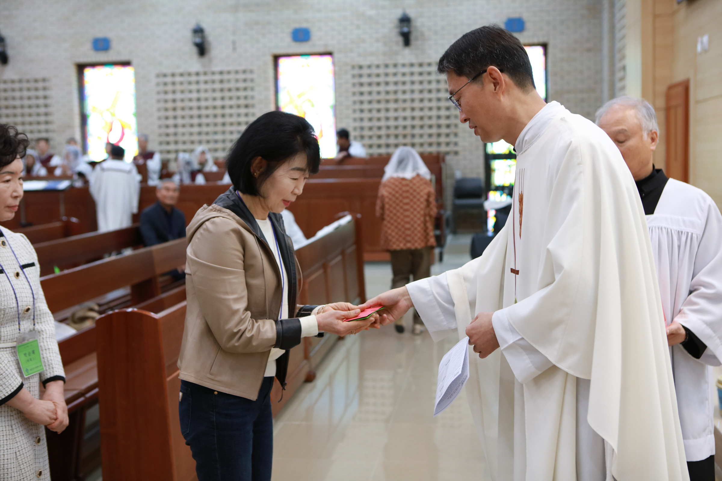 4월 12일 (주일) 오전 10시 30분 김영직 사도 요한 주임신부님 주례로 “하느님의 자비 주일” 미사를 봉헌했습니다. 강론에서 ‘오시어 가운데 서시며 “ 평화가 너희와 함께” 하고’ 함께함을 강조했습니다. 물동이 문제를 풀고 실천한 69명에게 나무로 손수 만드신 성경구 책갈피를 부상하고 로마서 필사를 치하했습니다. 미사 후 성전 입구에서 4 구역 봉사 차 나눔을, 105호실에서 사목회를 했습니다.