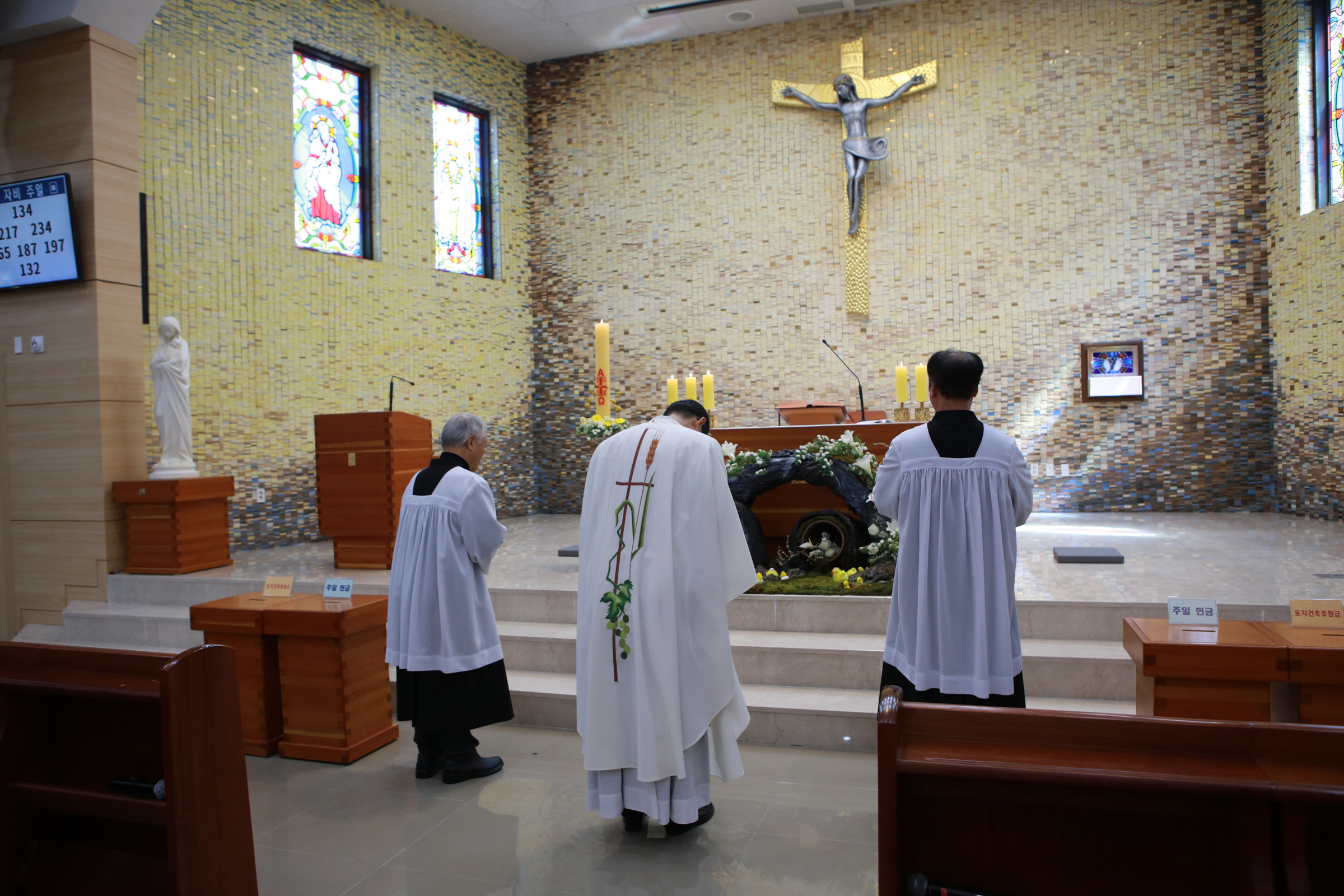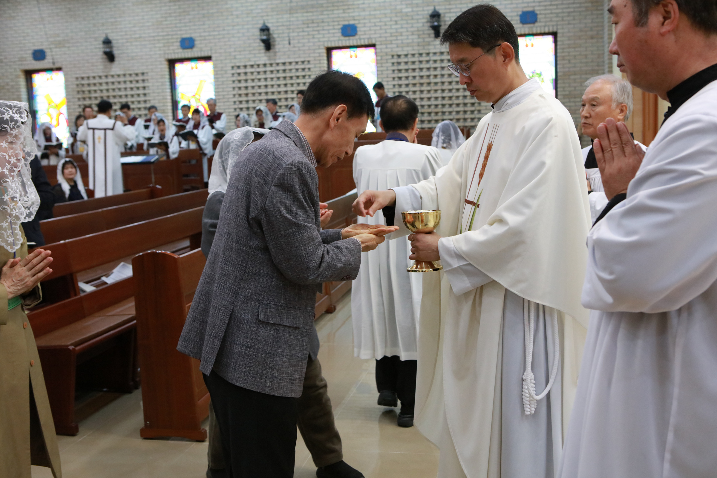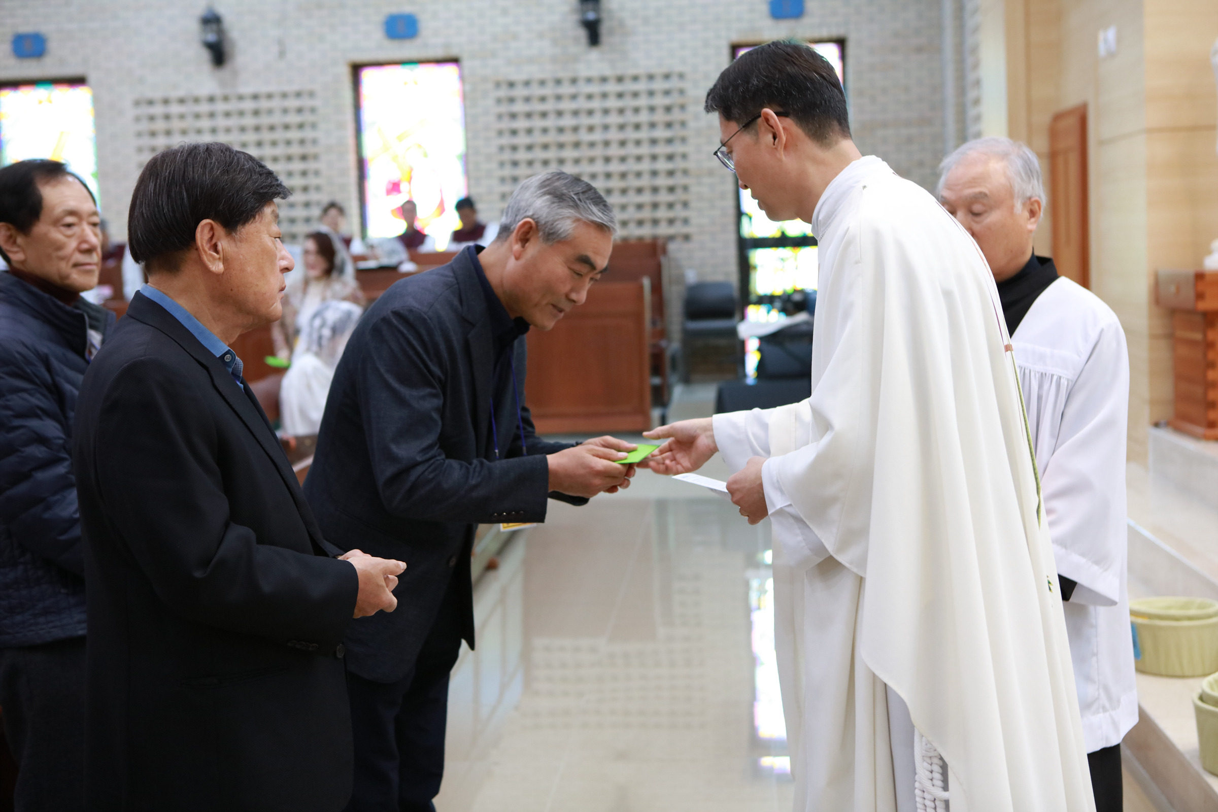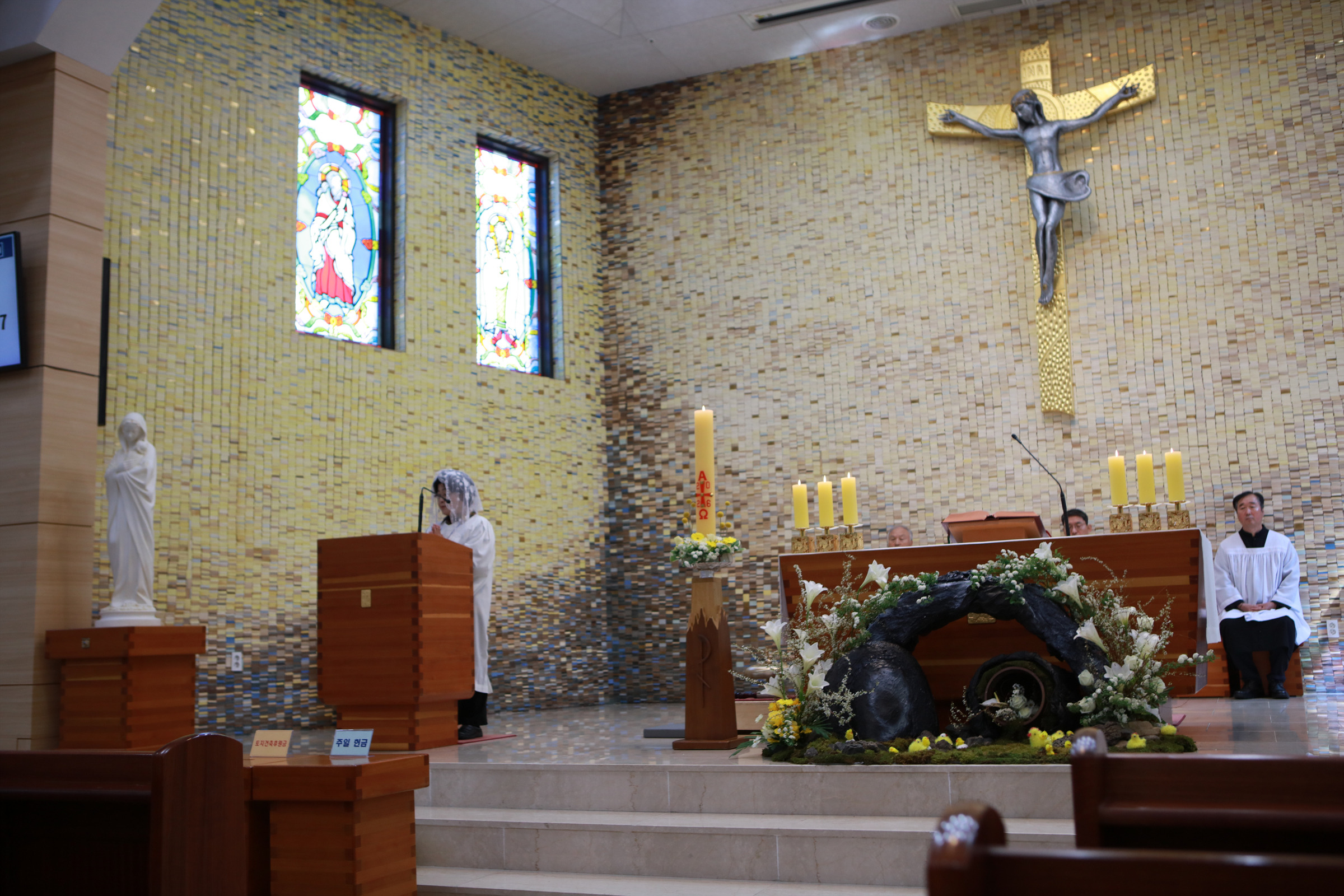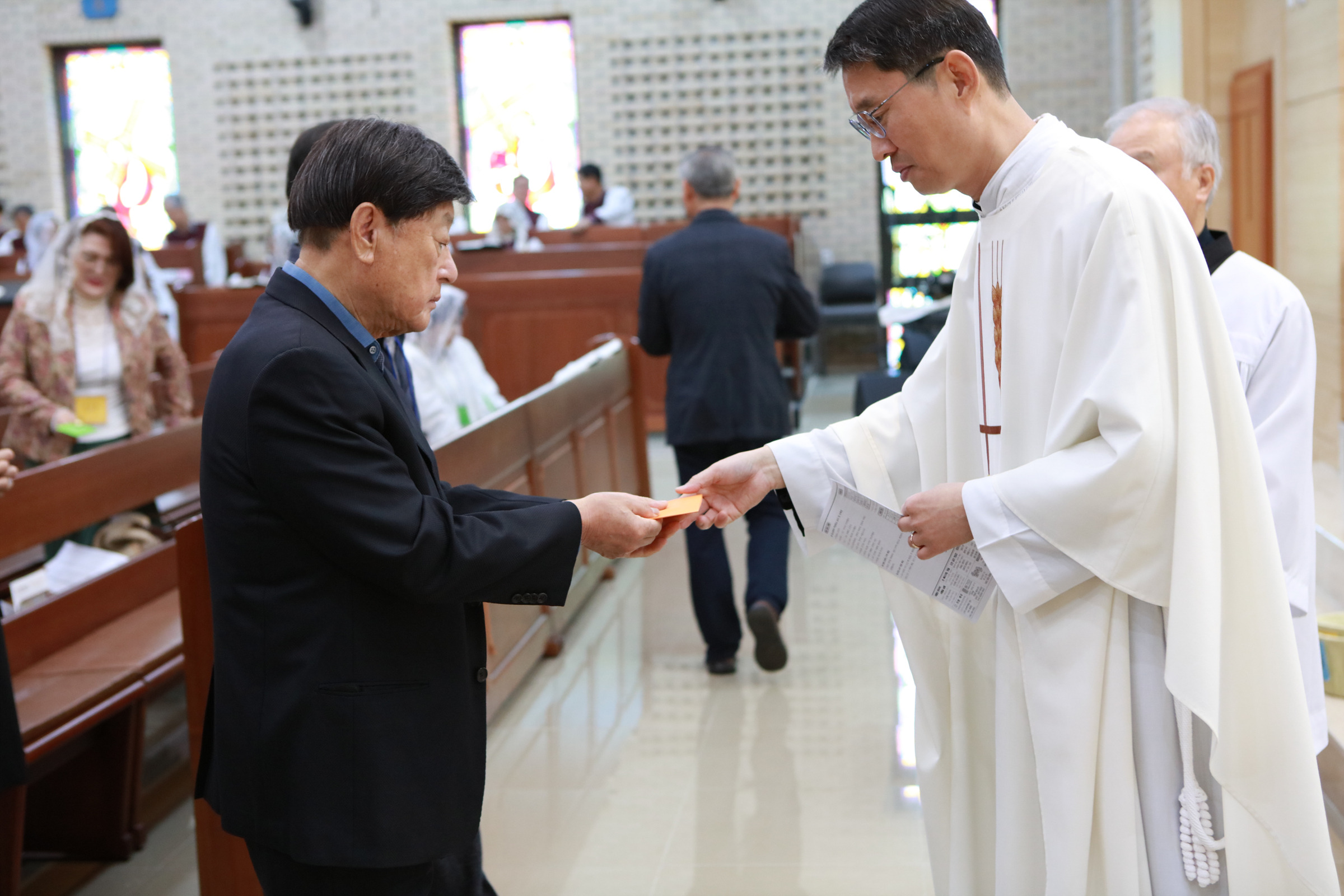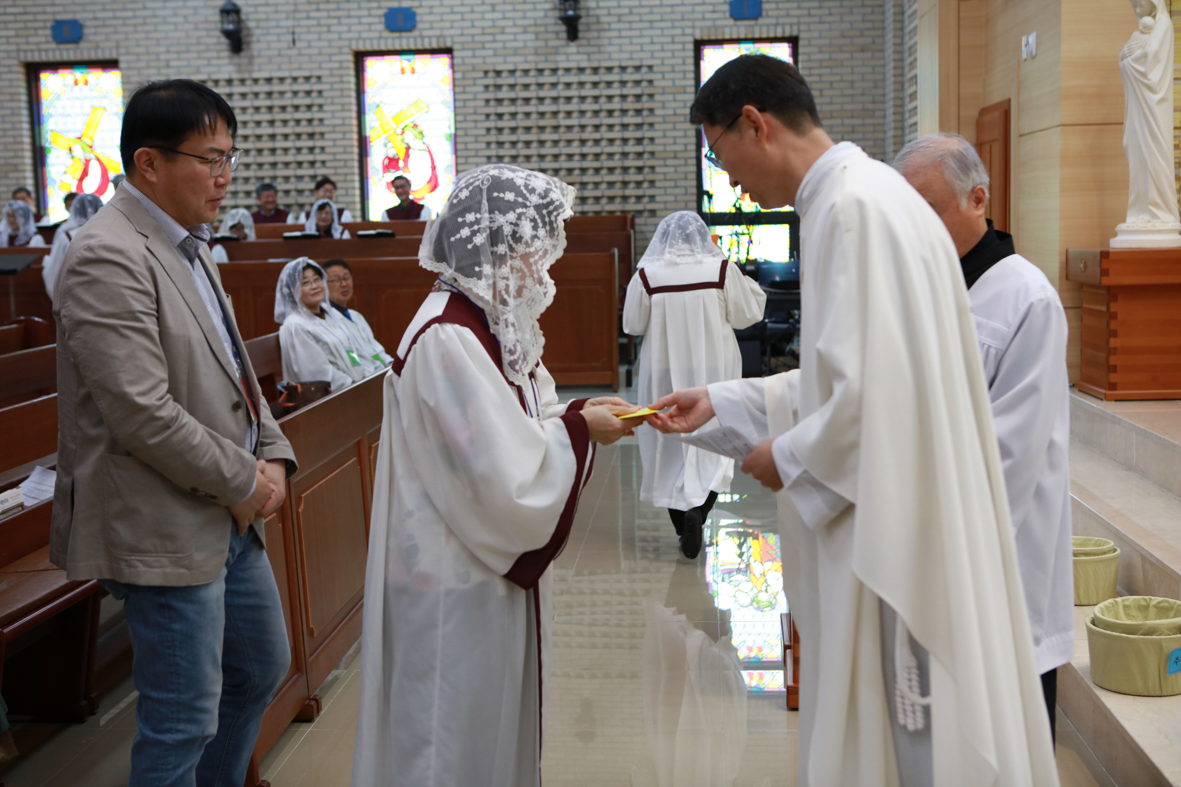 4월 12일 (주일) 오전 10시 30분 김영직 사도 요한 주임신부님 주례로 “하느님의 자비 주일” 미사를 봉헌했습니다. 강론에서 ‘오시어 가운데 서시며 “ 평화가 너희와 함께” 하고’ 함께함을 강조했습니다. 물동이 문제를 풀고 실천한 69명에게 나무로 손수 만드신 성경구 책갈피를 부상하고 로마서 필사를 치하했습니다. 미사 후 성전 입구에서 4 구역 봉사 차 나눔을, 105호실에서 사목회를 했습니다.