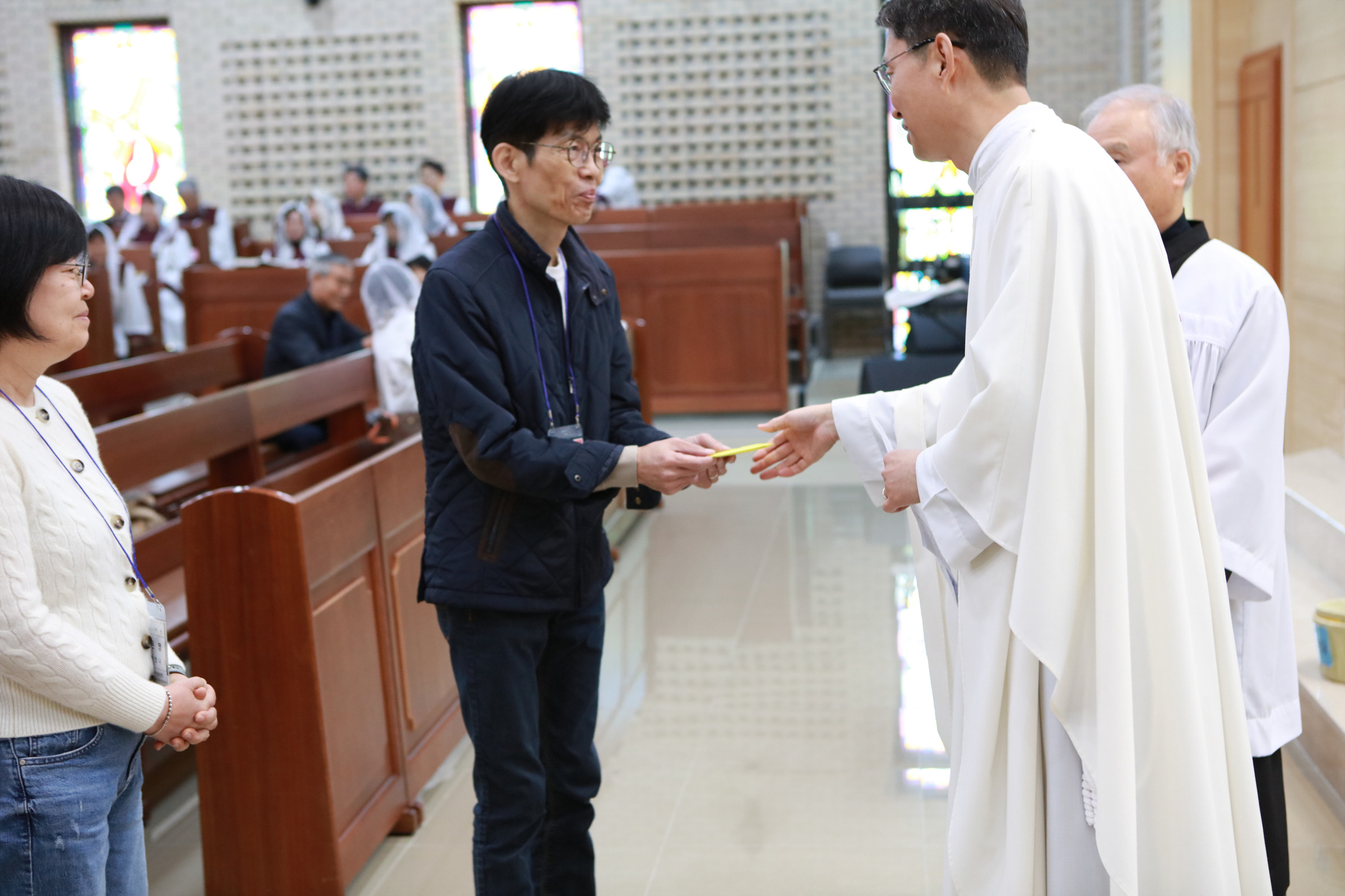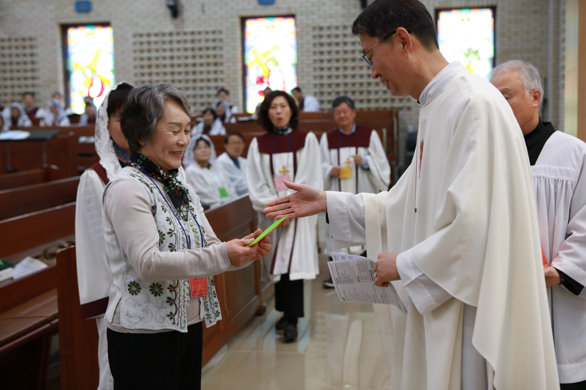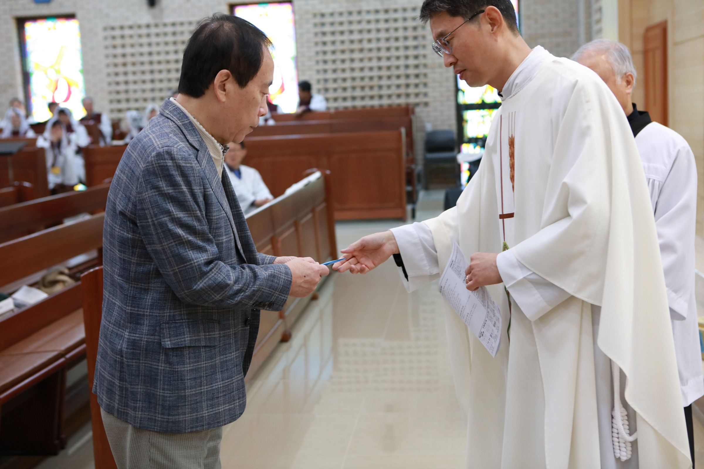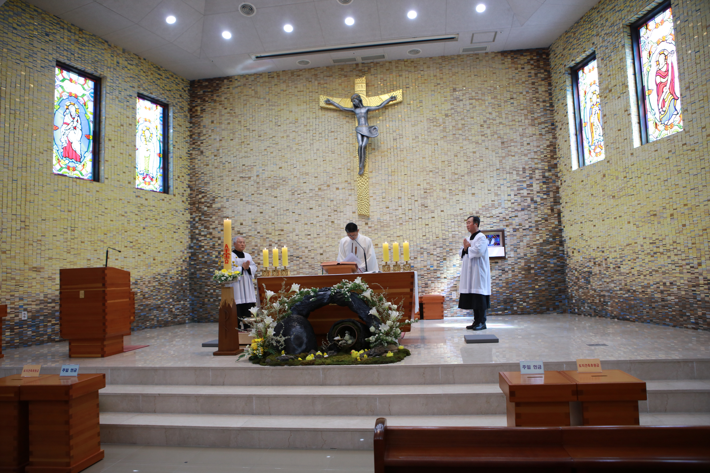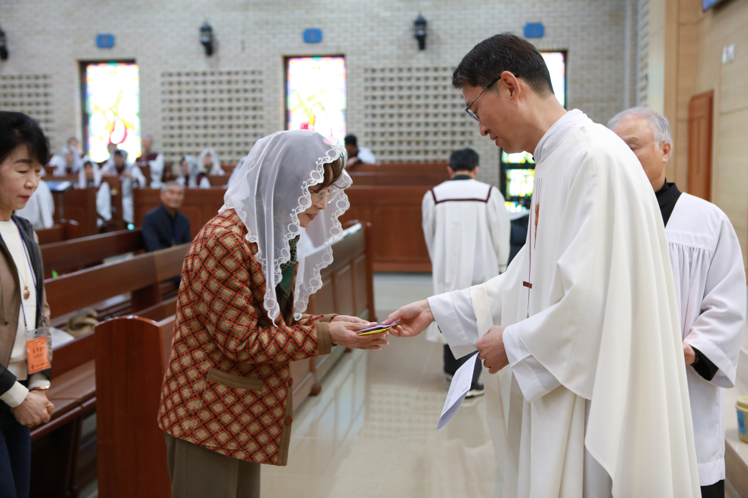 4월 12일 (주일) 오전 10시 30분 김영직 사도 요한 주임신부님 주례로 “하느님의 자비 주일” 미사를 봉헌했습니다. 강론에서 ‘오시어 가운데 서시며 “ 평화가 너희와 함께” 하고’ 함께함을 강조했습니다. 물동이 문제를 풀고 실천한 69명에게 나무로 손수 만드신 성경구 책갈피를 부상하고 로마서 필사를 치하했습니다. 미사 후 성전 입구에서 4 구역 봉사 차 나눔을, 105호실에서 사목회를 했습니다.