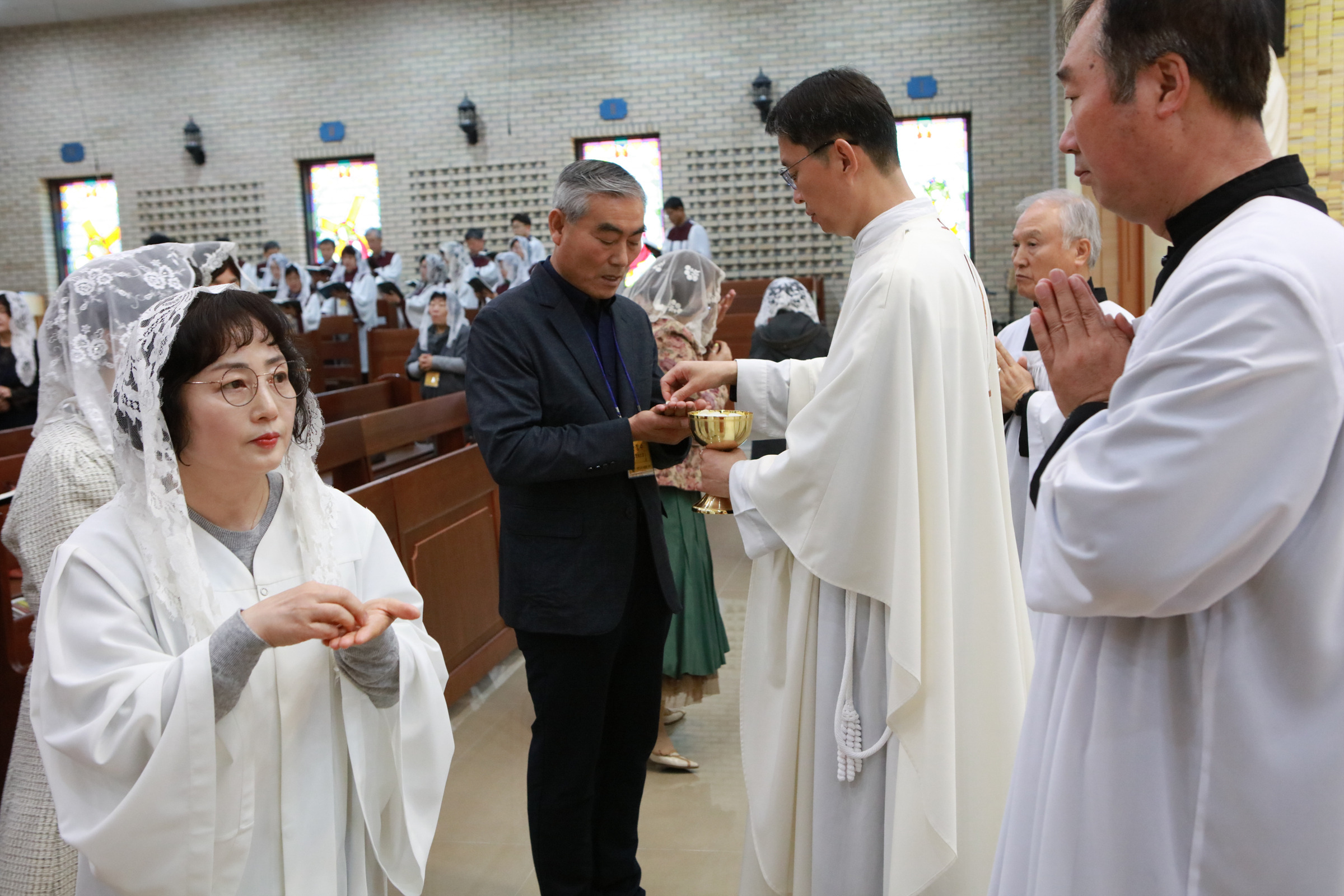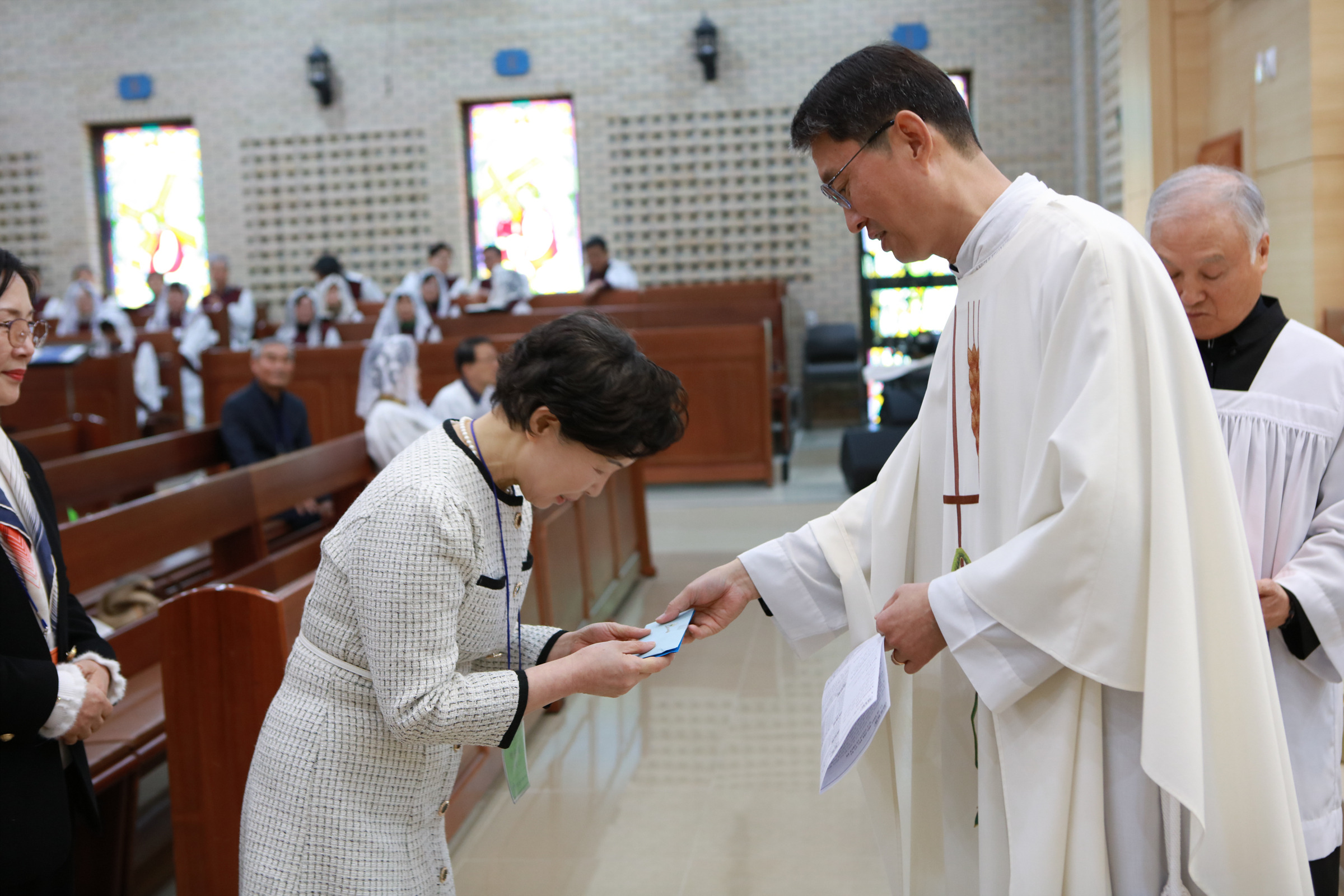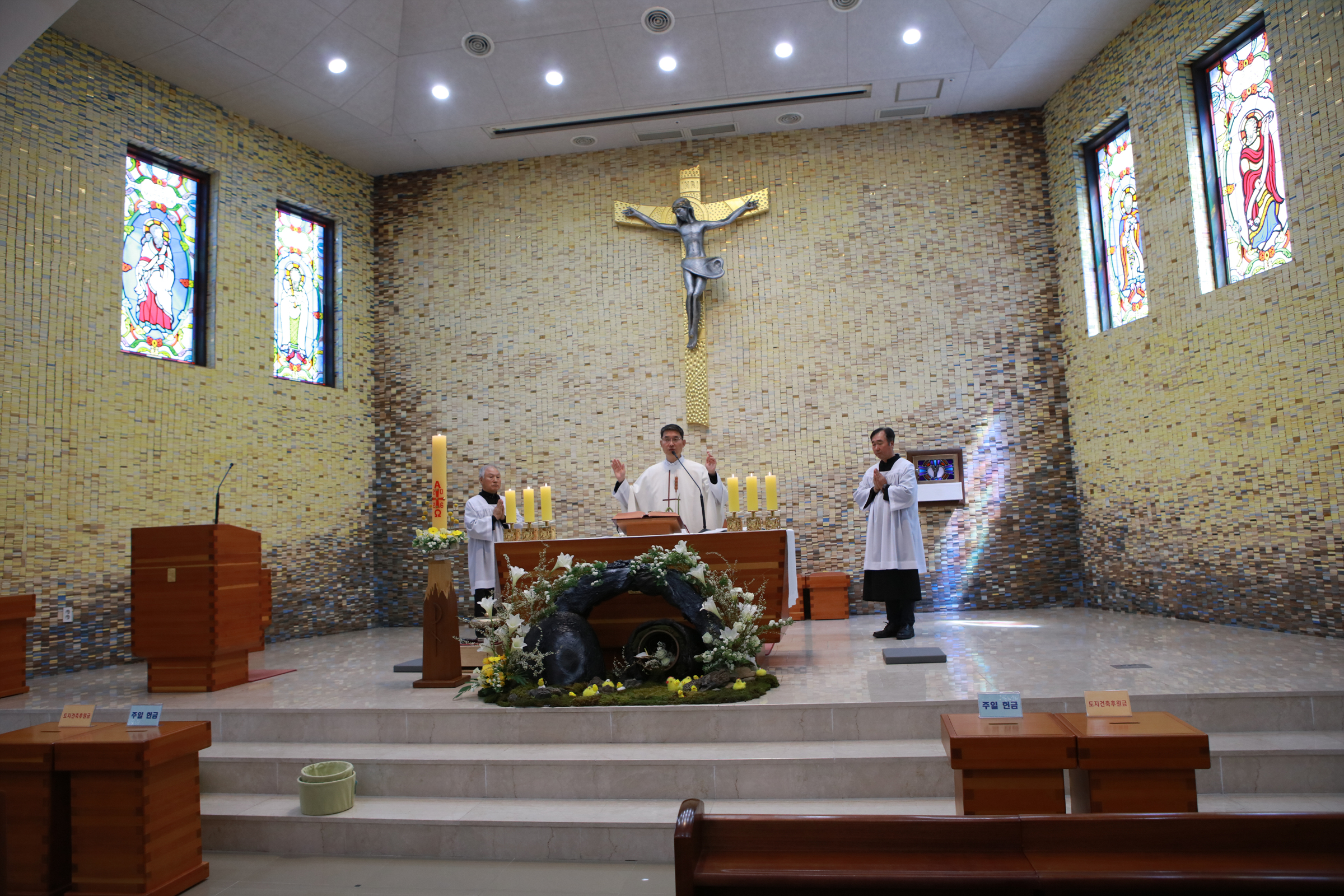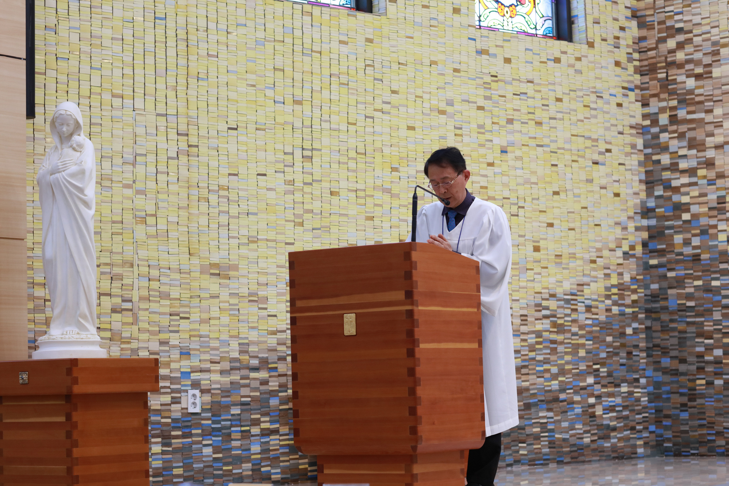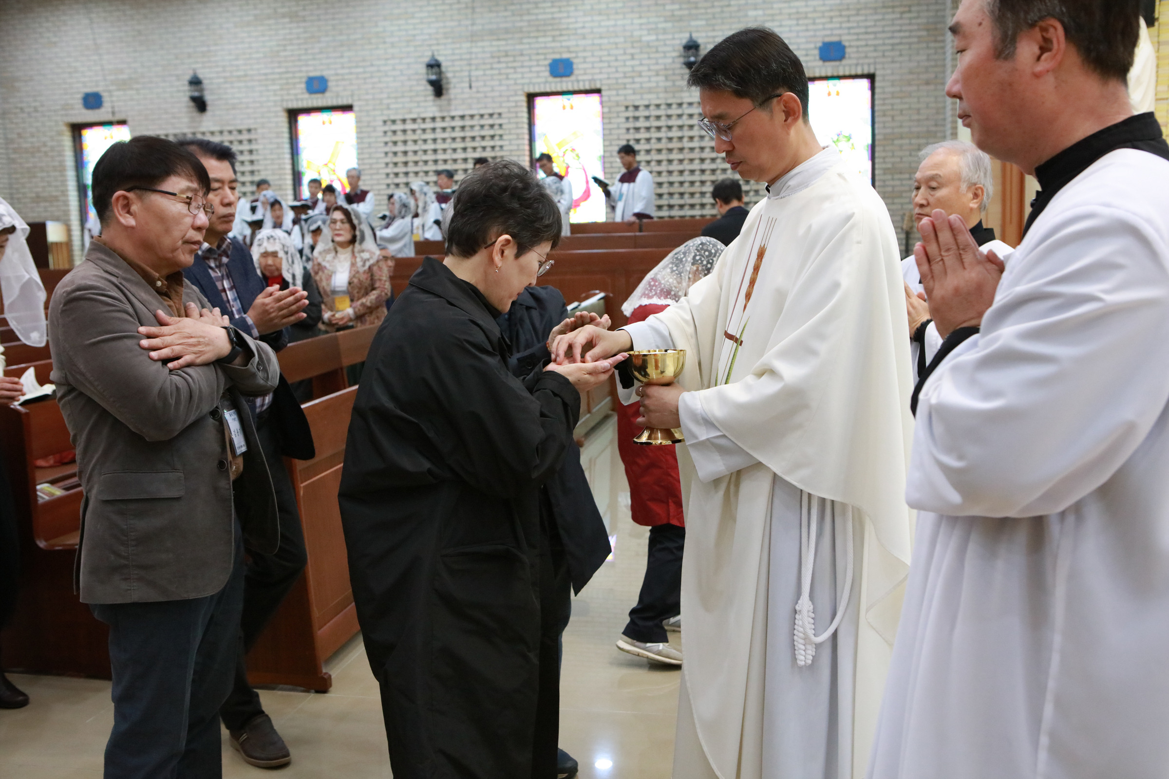 4월 12일 (주일) 오전 10시 30분 김영직 사도 요한 주임신부님 주례로 “하느님의 자비 주일” 미사를 봉헌했습니다. 강론에서 ‘오시어 가운데 서시며 “ 평화가 너희와 함께” 하고’ 함께함을 강조했습니다. 물동이 문제를 풀고 실천한 69명에게 나무로 손수 만드신 성경구 책갈피를 부상하고 로마서 필사를 치하했습니다. 미사 후 성전 입구에서 4 구역 봉사 차 나눔을, 105호실에서 사목회를 했습니다.