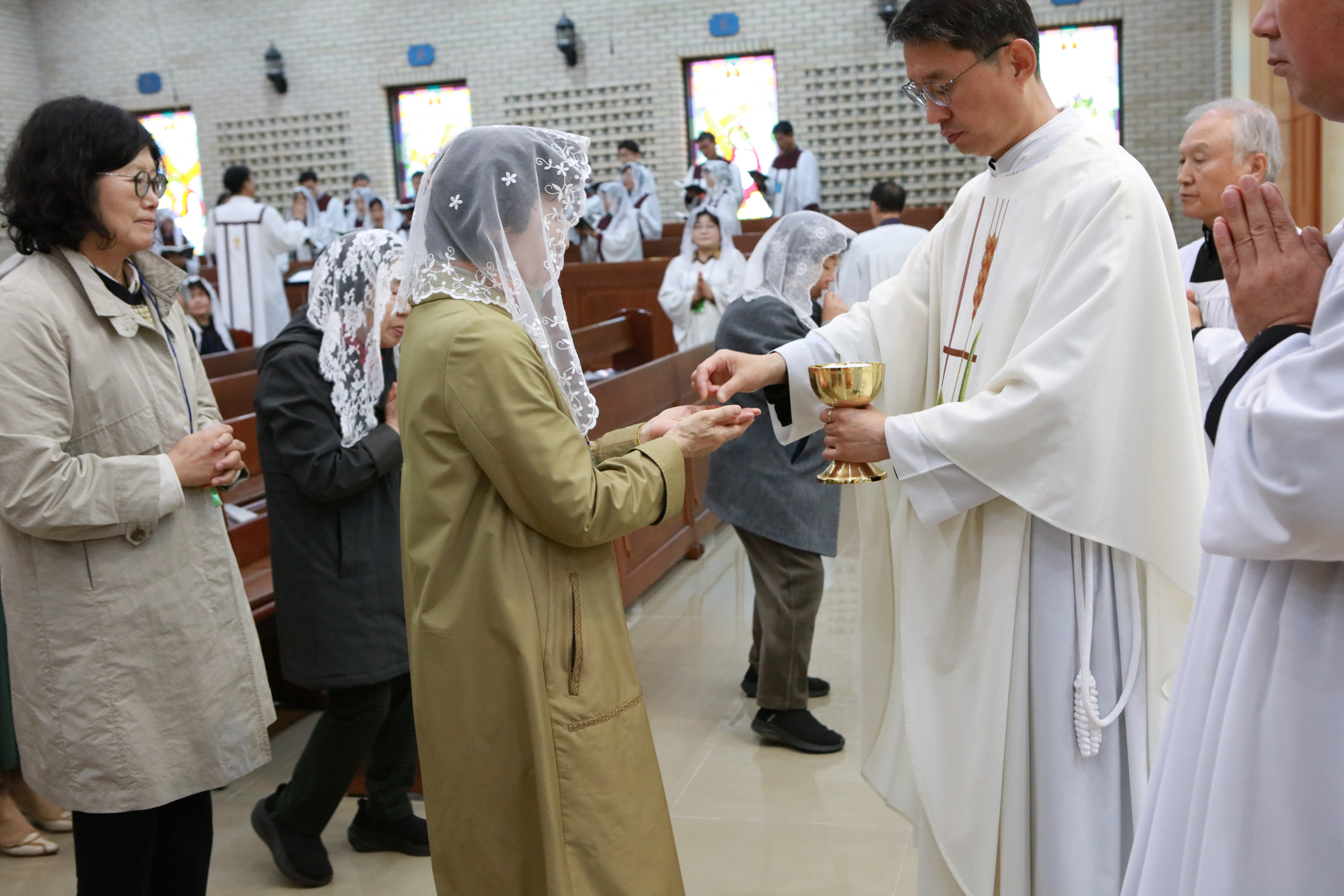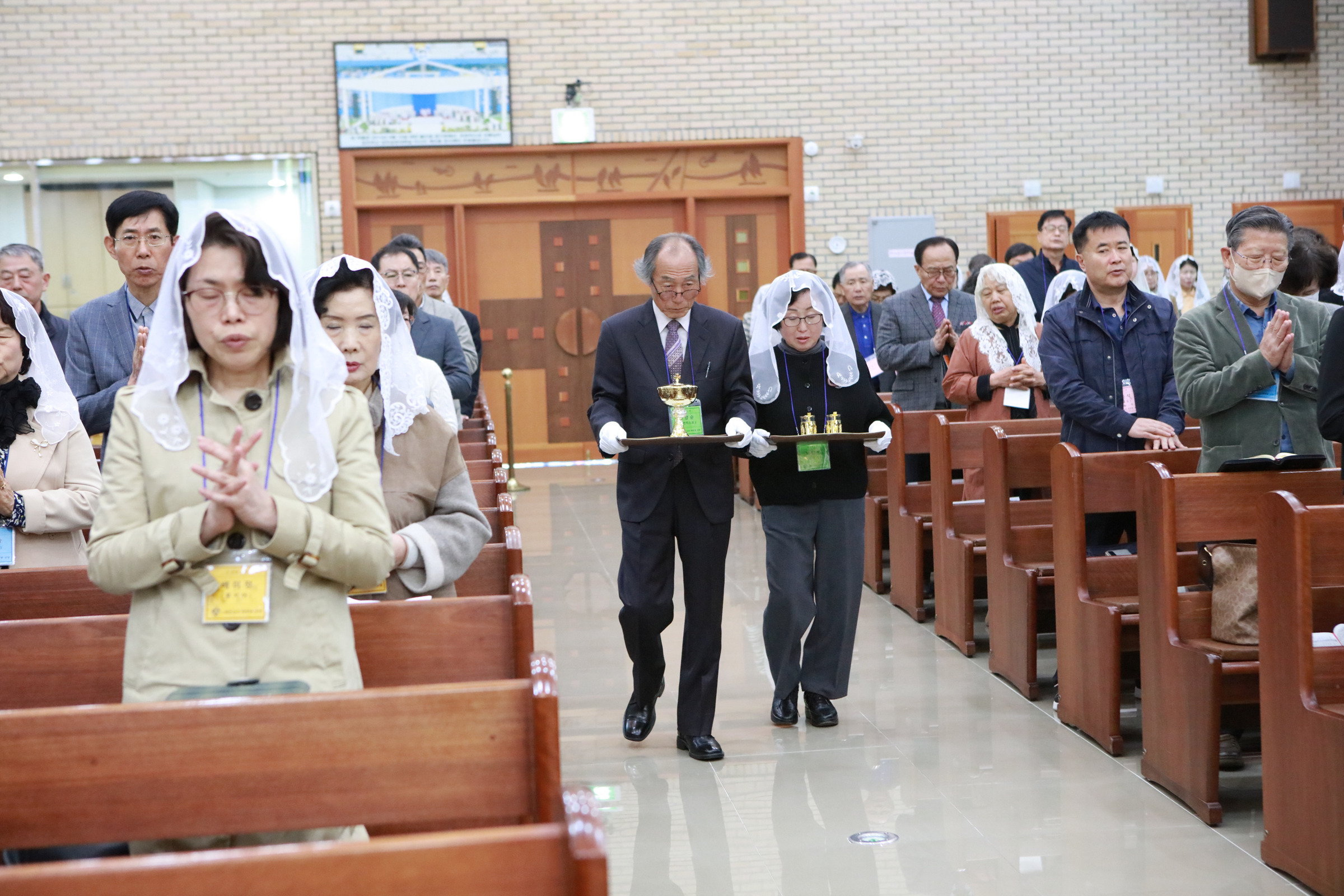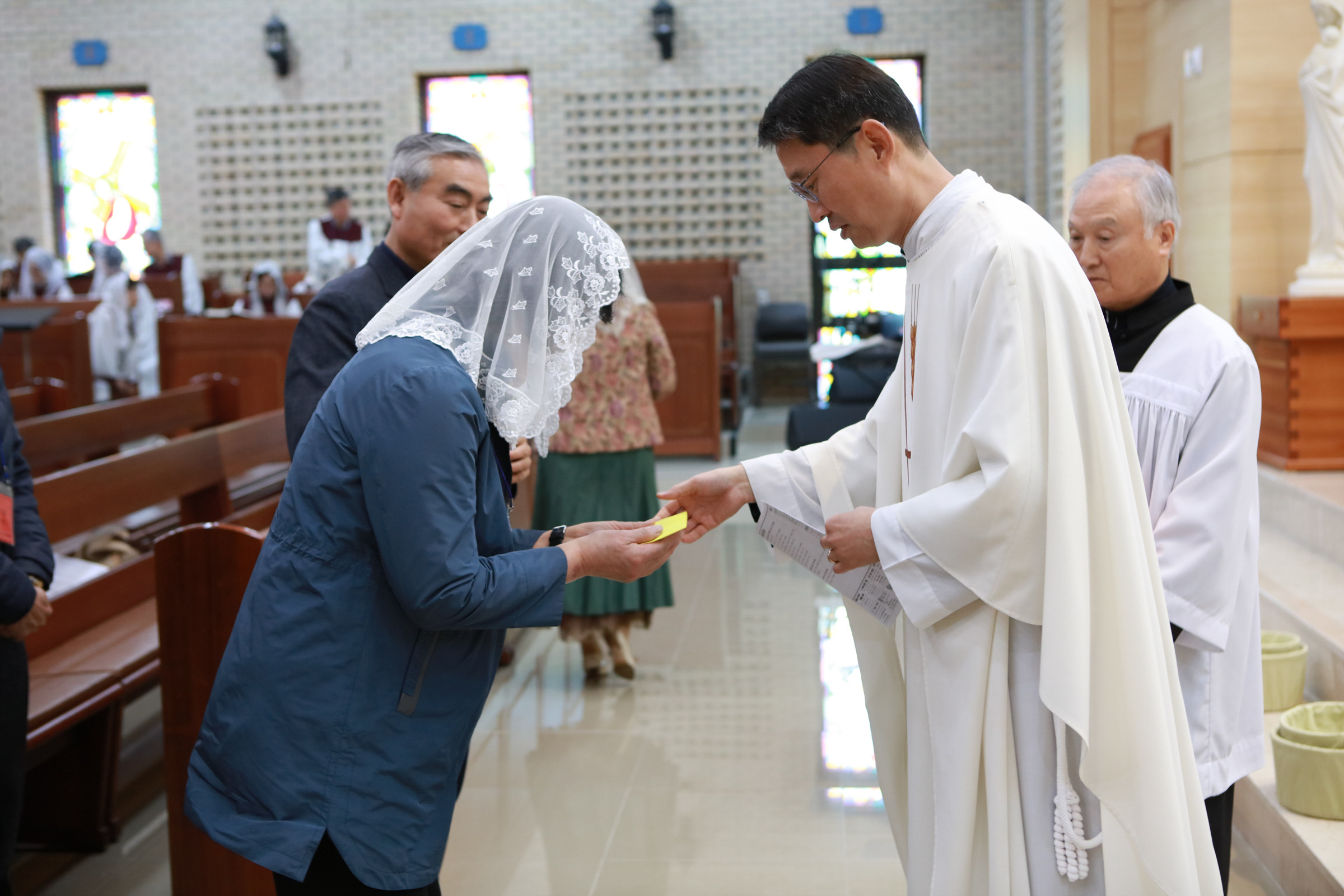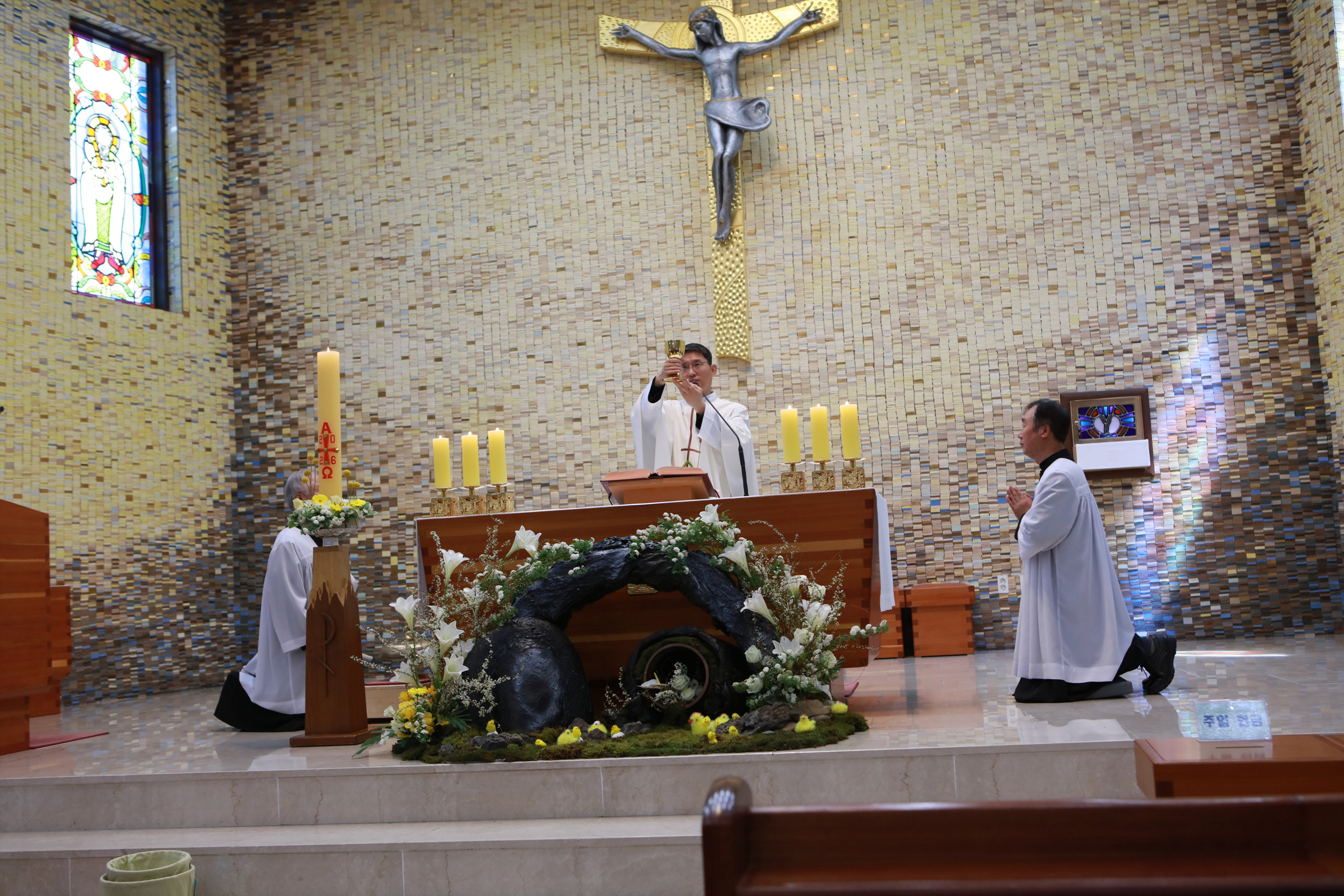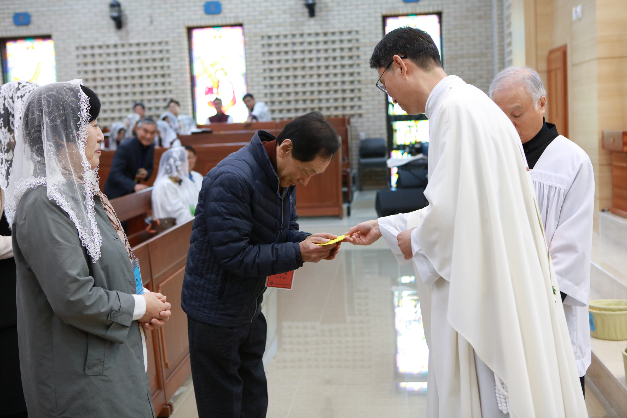 4월 12일 (주일) 오전 10시 30분 김영직 사도 요한 주임신부님 주례로 “하느님의 자비 주일” 미사를 봉헌했습니다. 강론에서 ‘오시어 가운데 서시며 “ 평화가 너희와 함께” 하고’ 함께함을 강조했습니다. 물동이 문제를 풀고 실천한 69명에게 나무로 손수 만드신 성경구 책갈피를 부상하고 로마서 필사를 치하했습니다. 미사 후 성전 입구에서 4 구역 봉사 차 나눔을, 105호실에서 사목회를 했습니다.