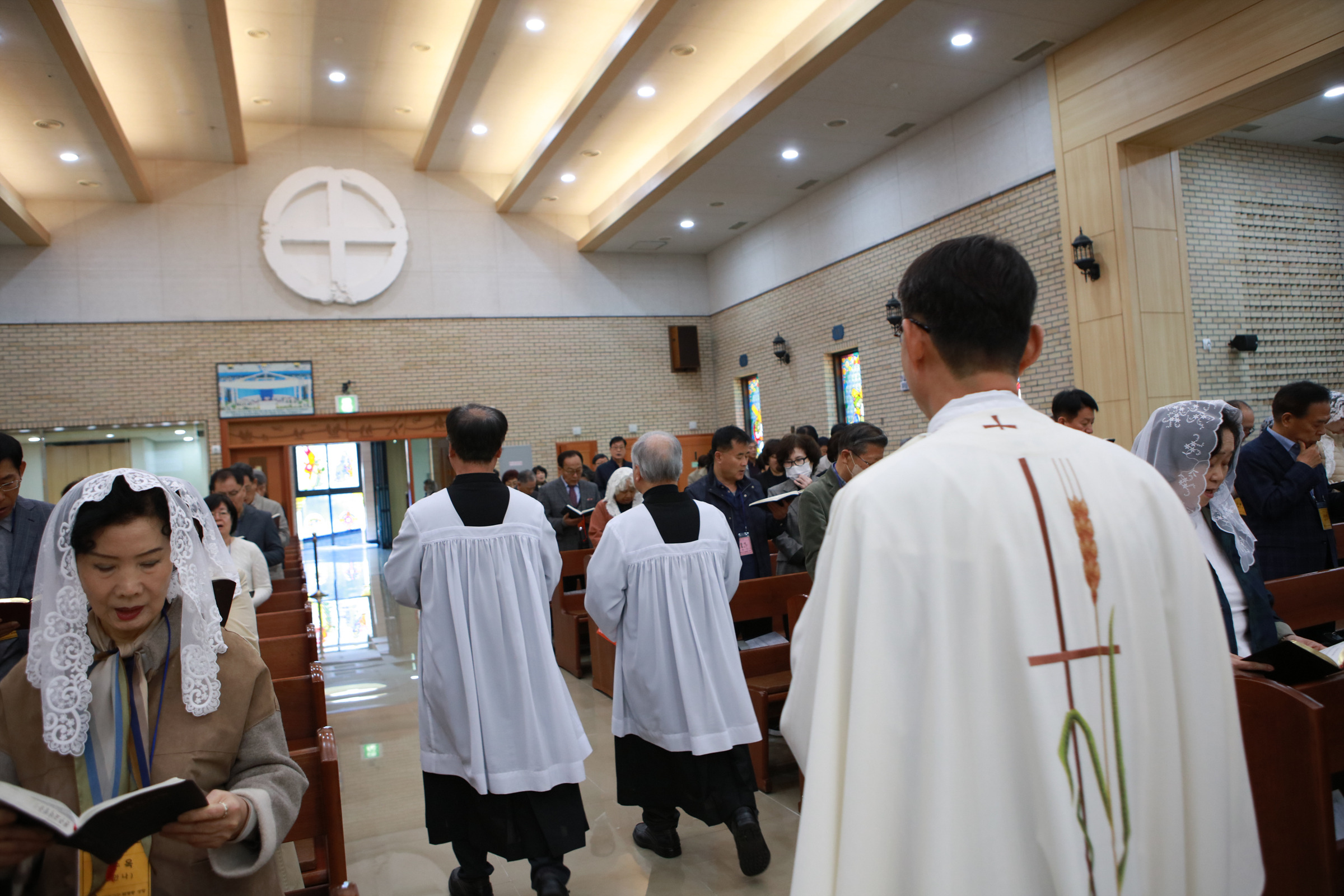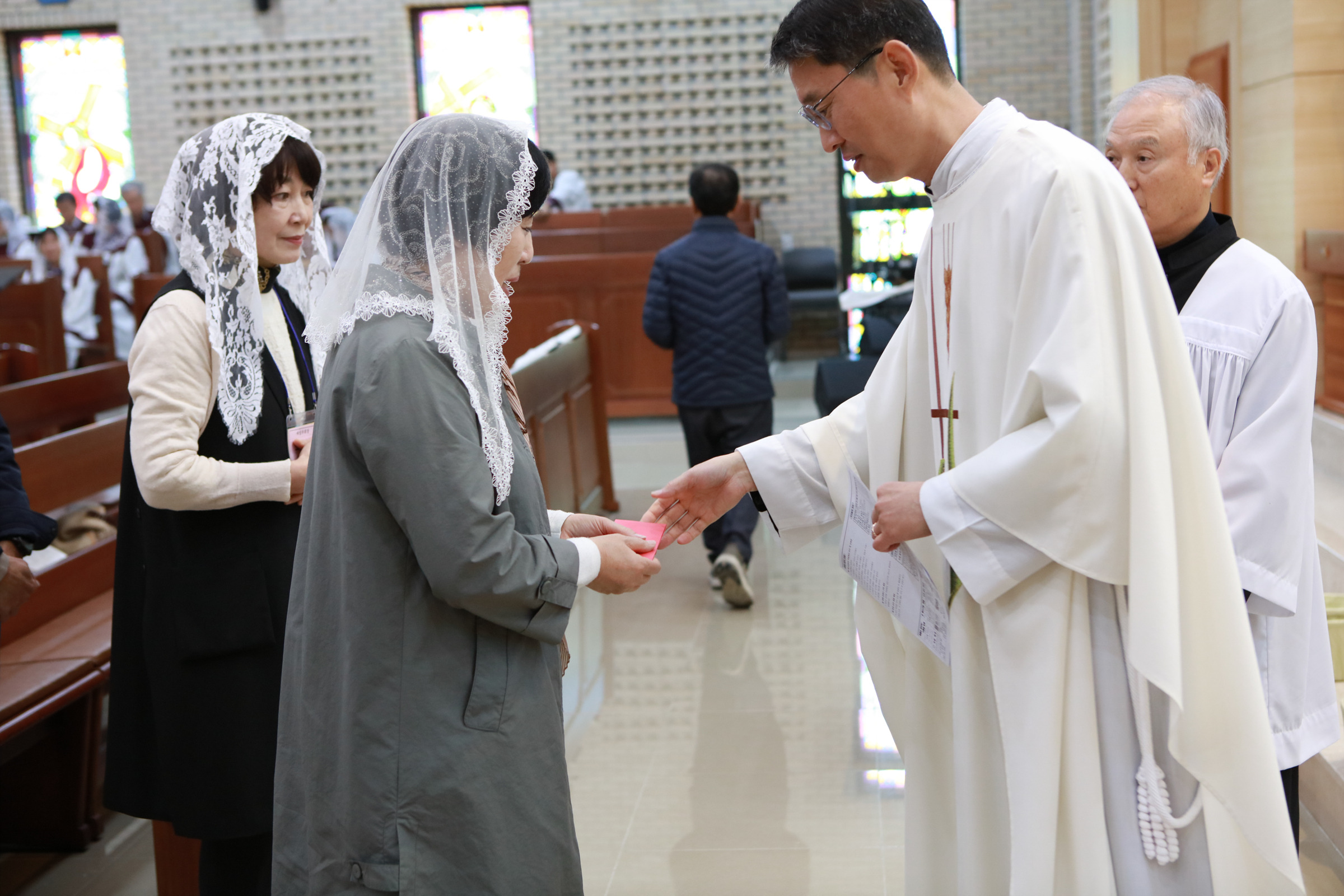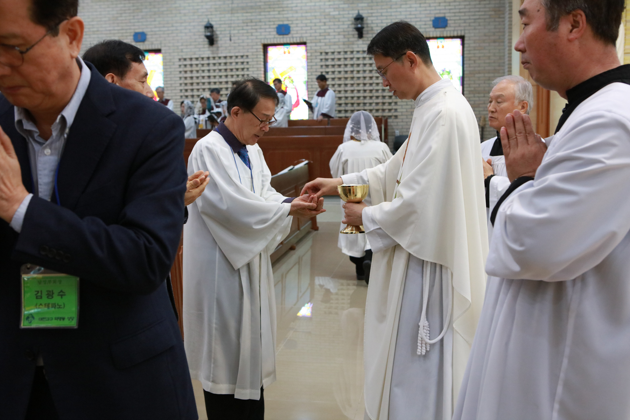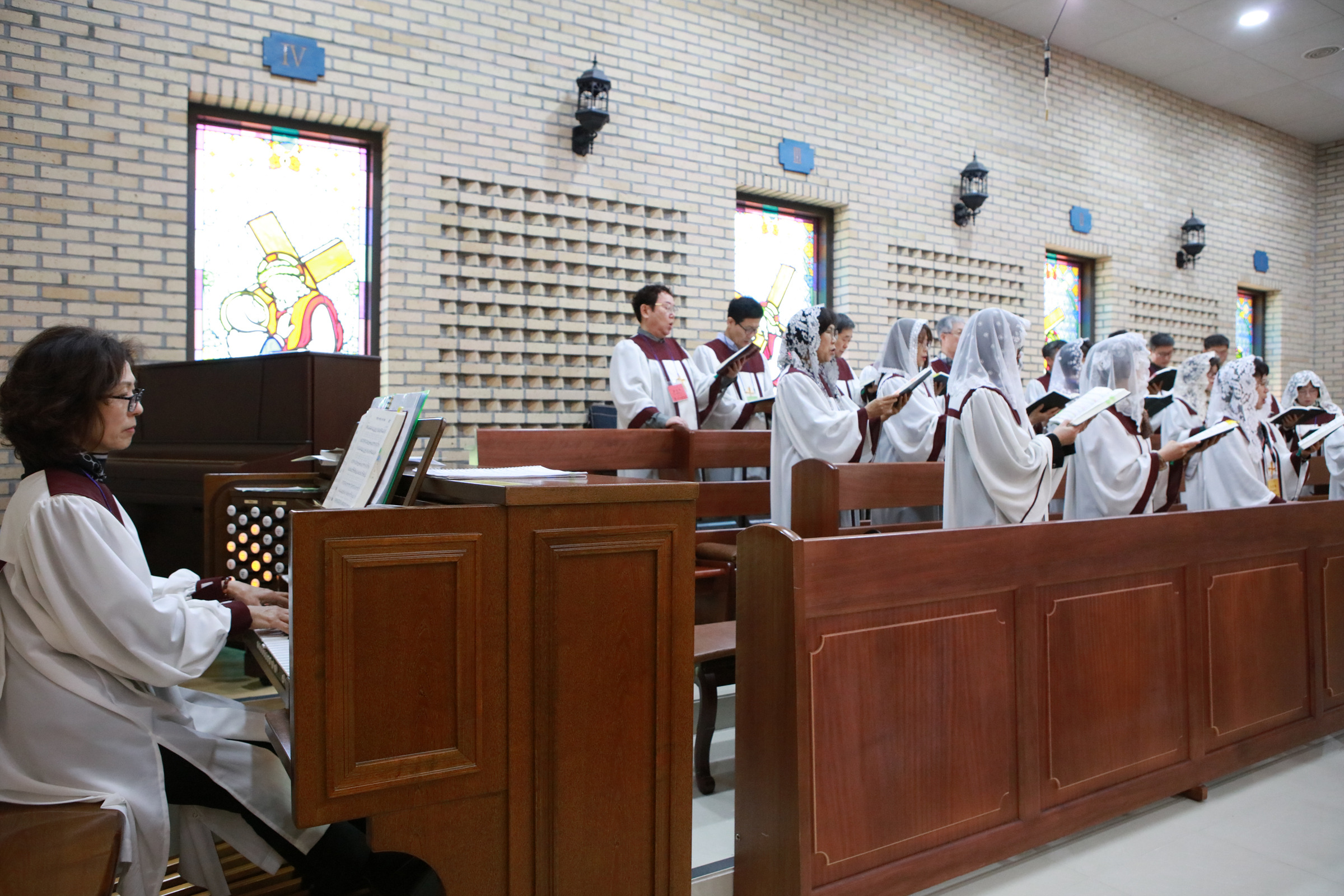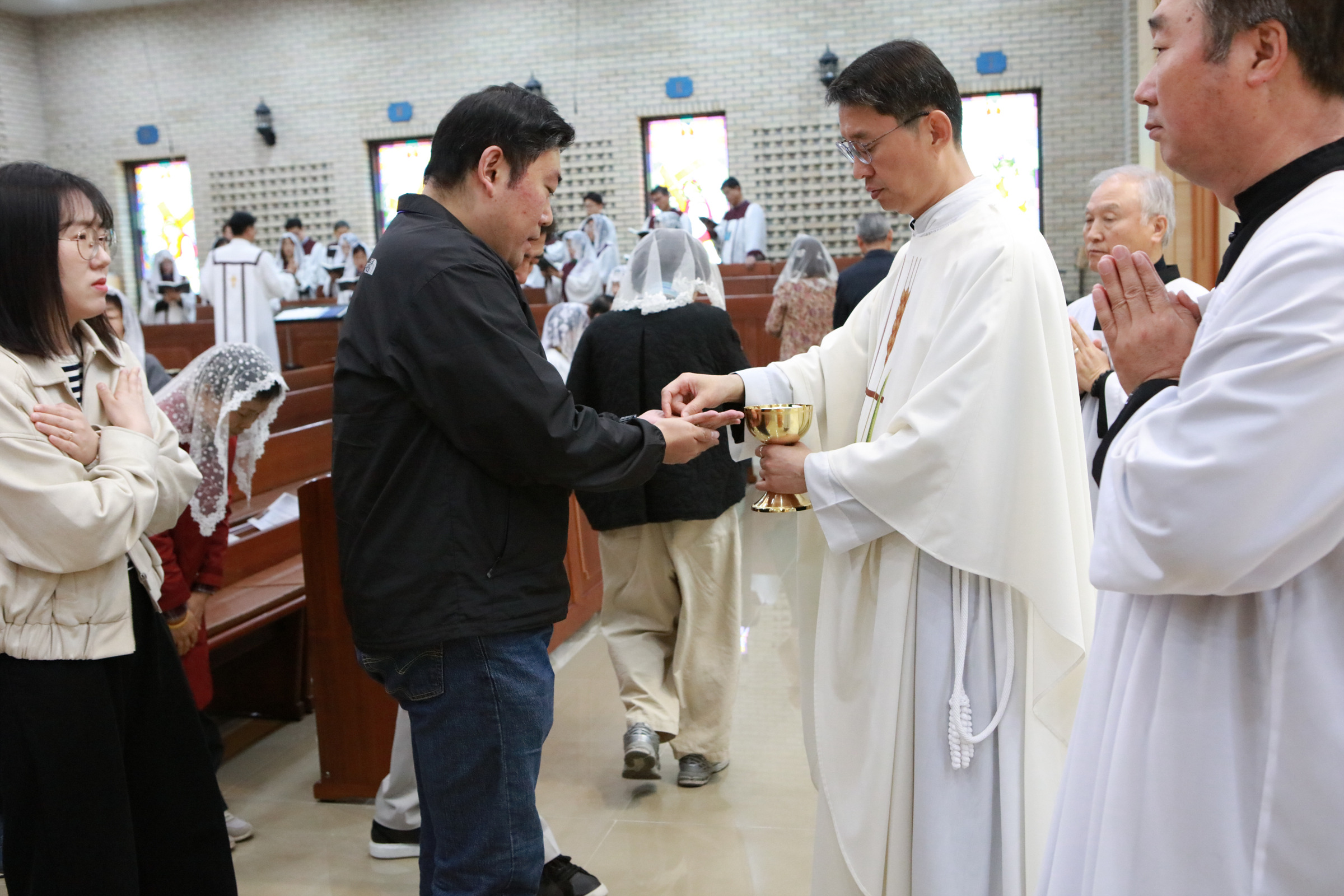 4월 12일 (주일) 오전 10시 30분 김영직 사도 요한 주임신부님 주례로 “하느님의 자비 주일” 미사를 봉헌했습니다. 강론에서 ‘오시어 가운데 서시며 “ 평화가 너희와 함께” 하고’ 함께함을 강조했습니다. 물동이 문제를 풀고 실천한 69명에게 나무로 손수 만드신 성경구 책갈피를 부상하고 로마서 필사를 치하했습니다. 미사 후 성전 입구에서 4 구역 봉사 차 나눔을, 105호실에서 사목회를 했습니다.