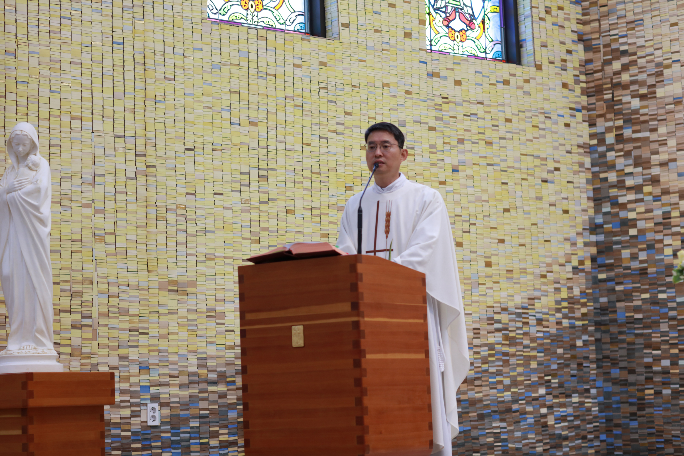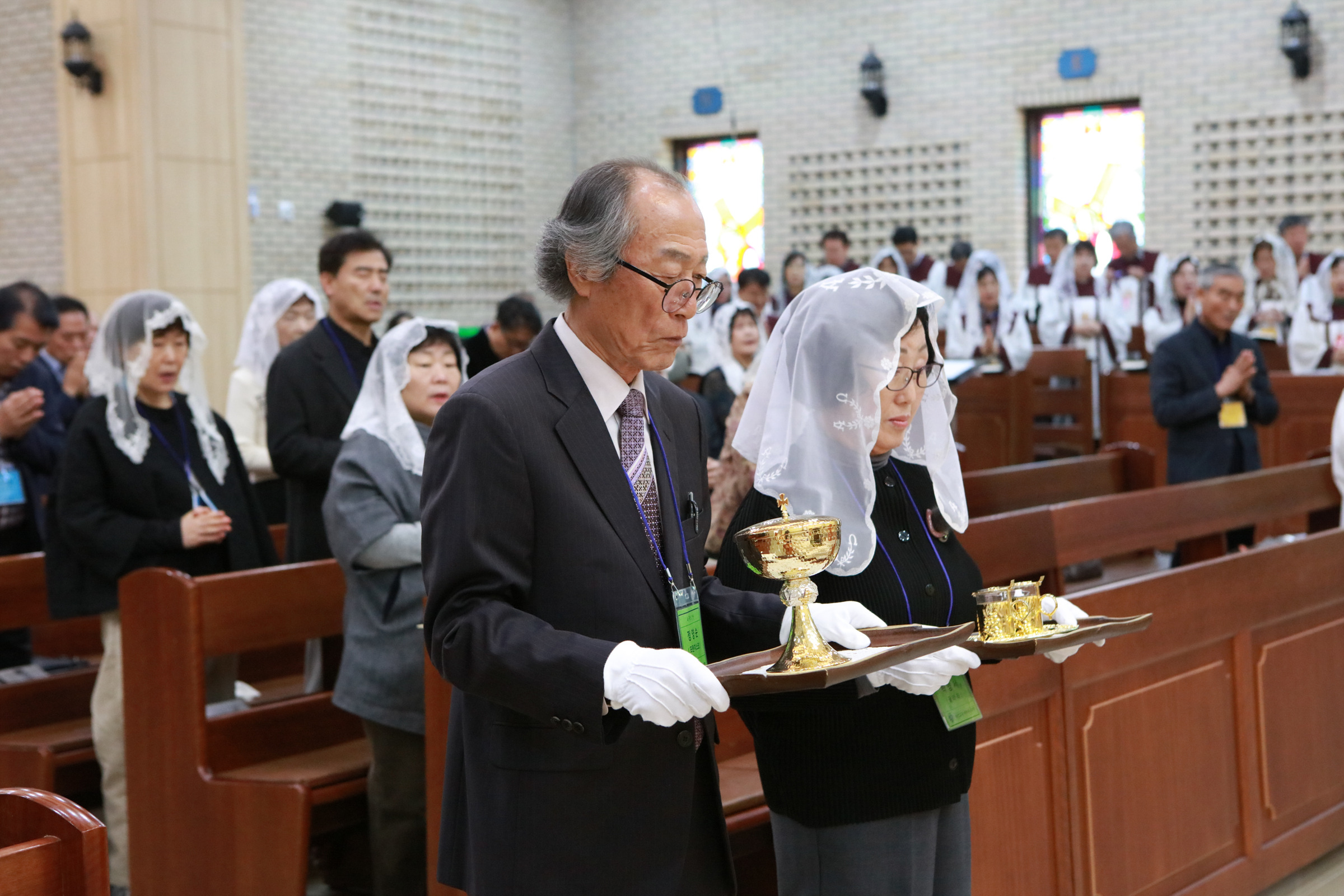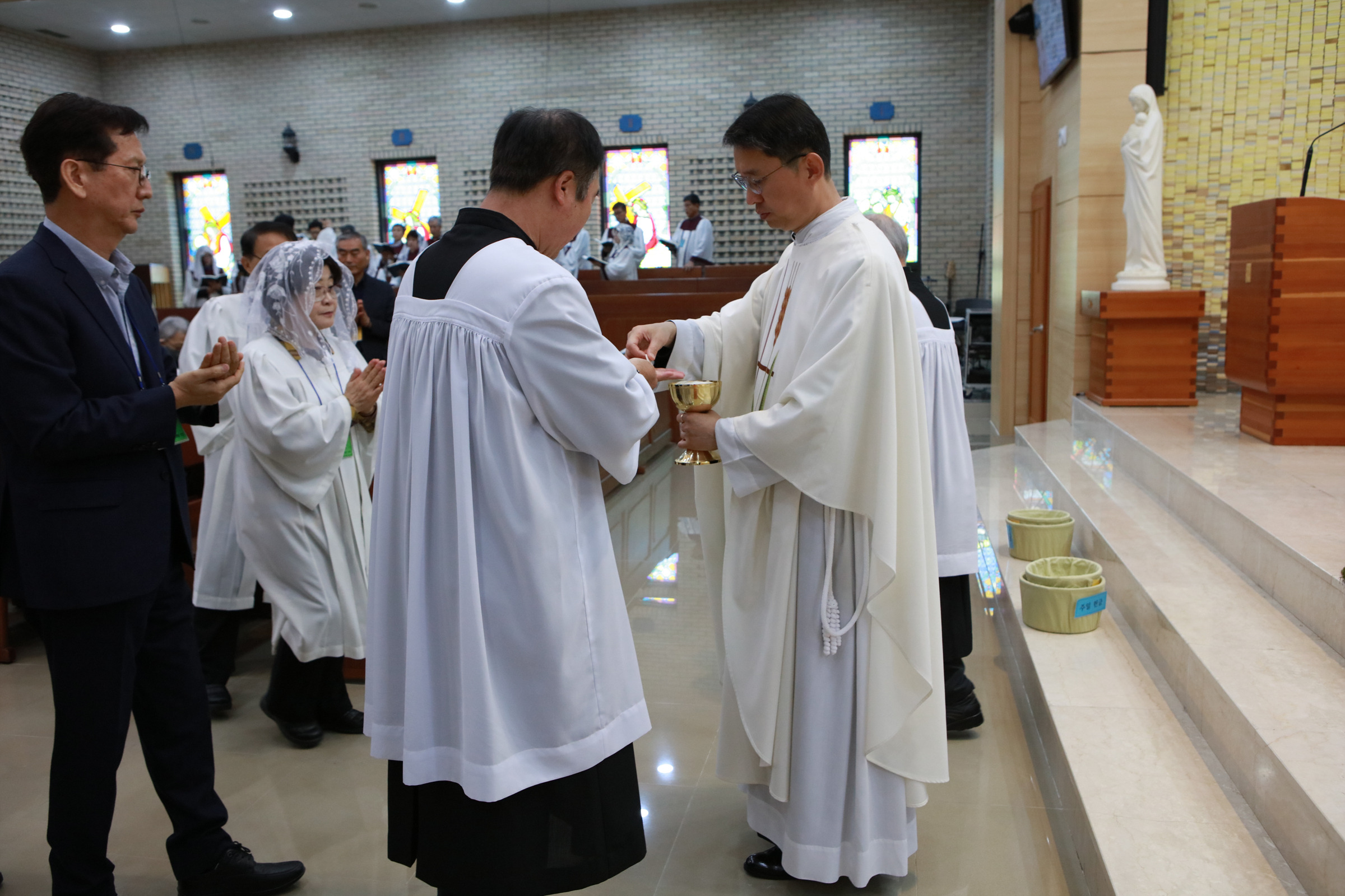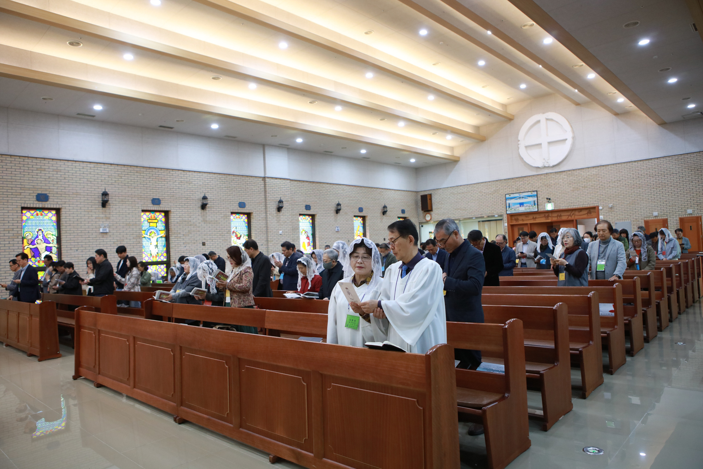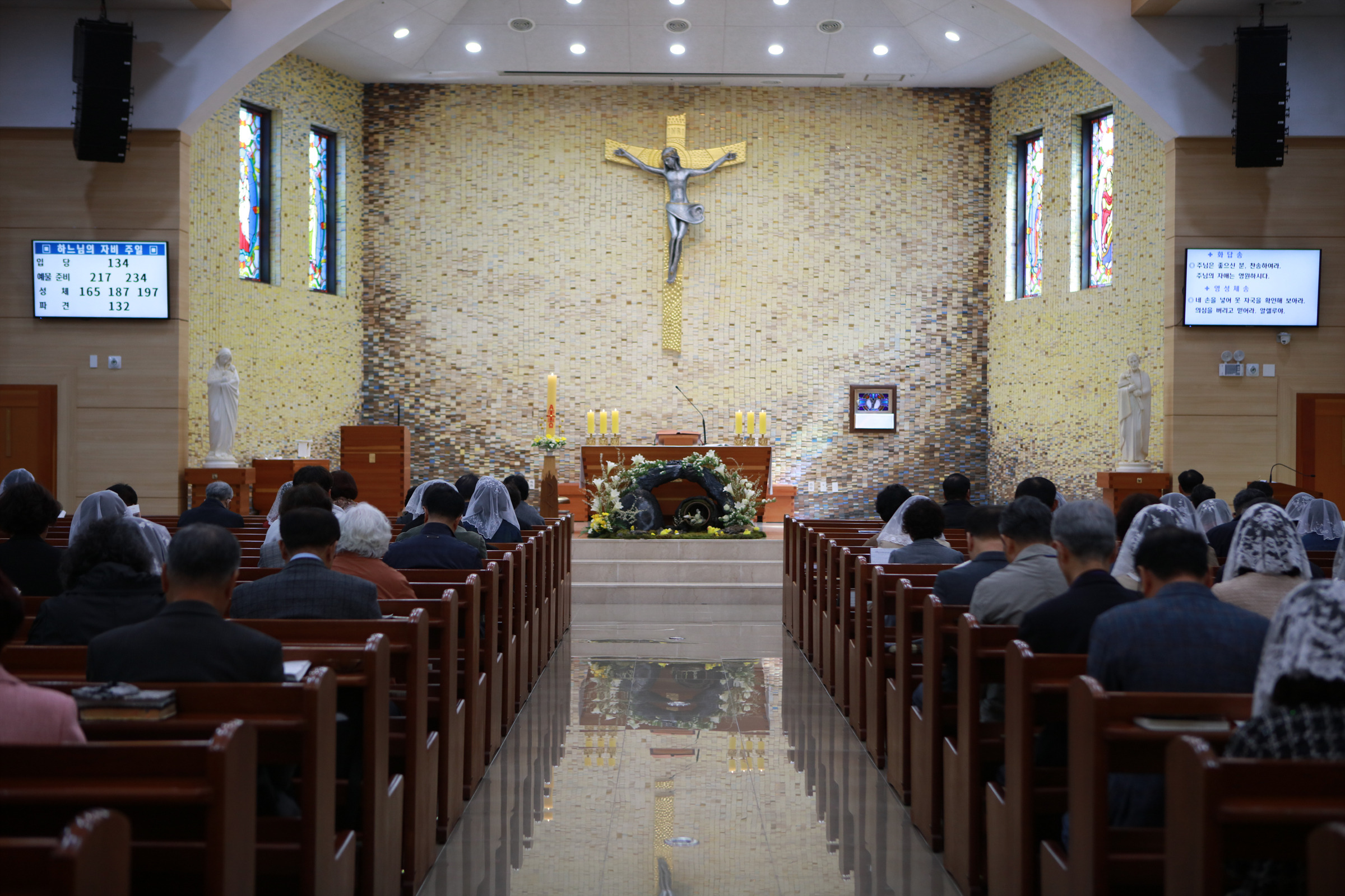 4월 12일 (주일) 오전 10시 30분 김영직 사도 요한 주임신부님 주례로 “하느님의 자비 주일” 미사를 봉헌했습니다. 강론에서 ‘오시어 가운데 서시며 “ 평화가 너희와 함께” 하고’ 함께함을 강조했습니다. 물동이 문제를 풀고 실천한 69명에게 나무로 손수 만드신 성경구 책갈피를 부상하고 로마서 필사를 치하했습니다. 미사 후 성전 입구에서 4 구역 봉사 차 나눔을, 105호실에서 사목회를 했습니다.
