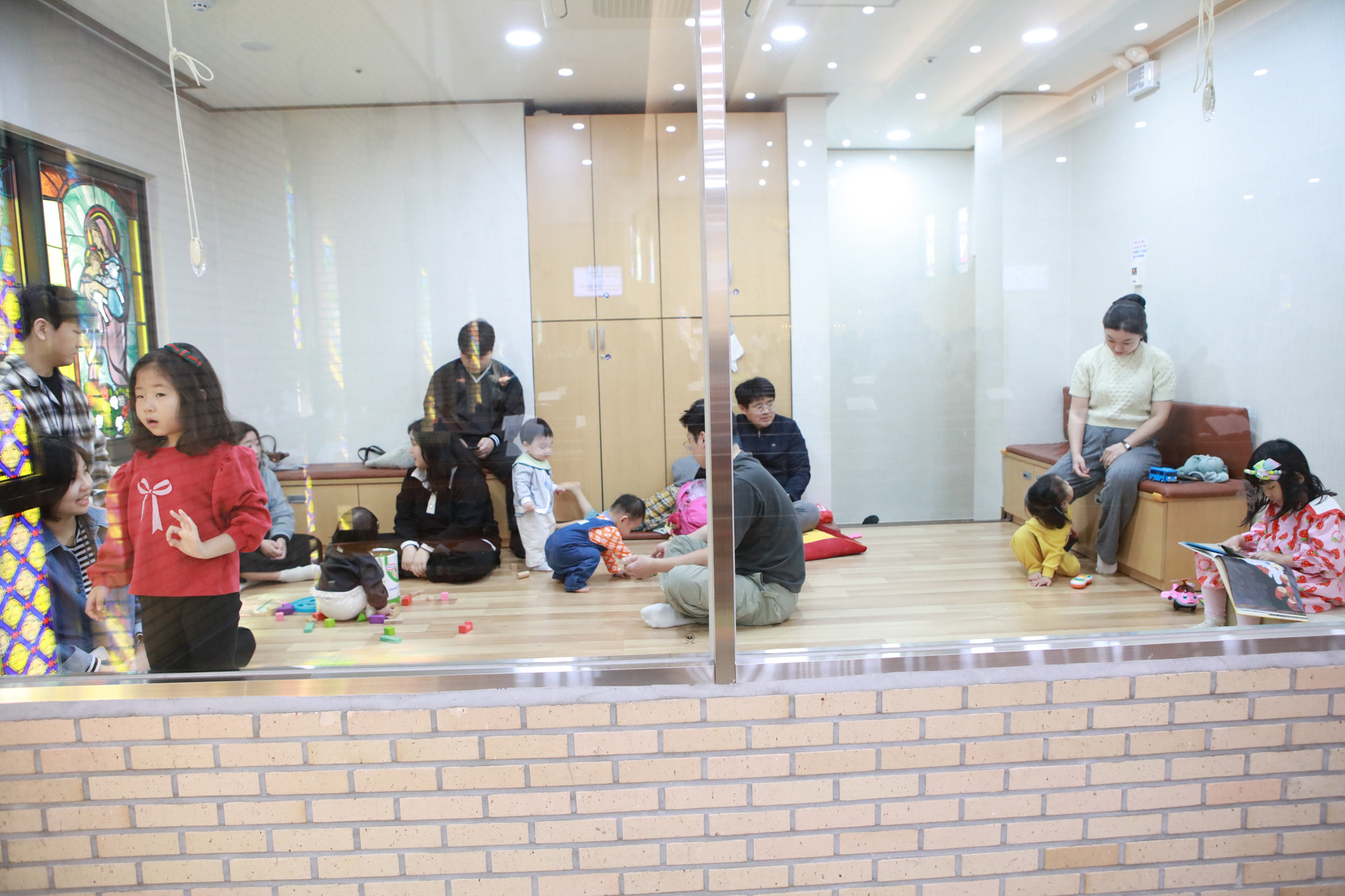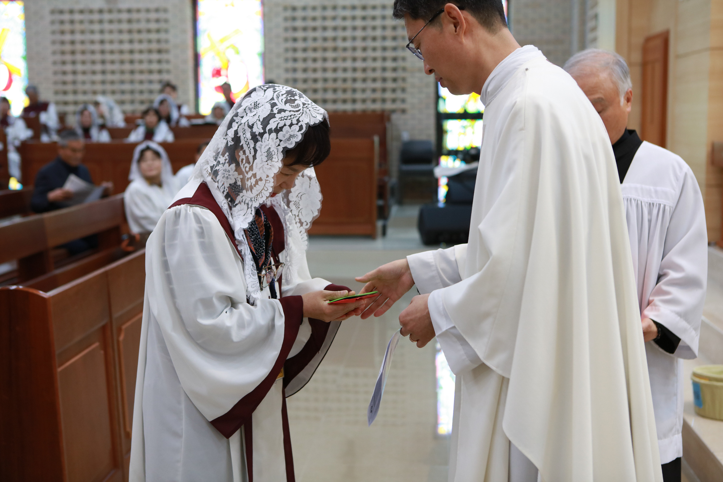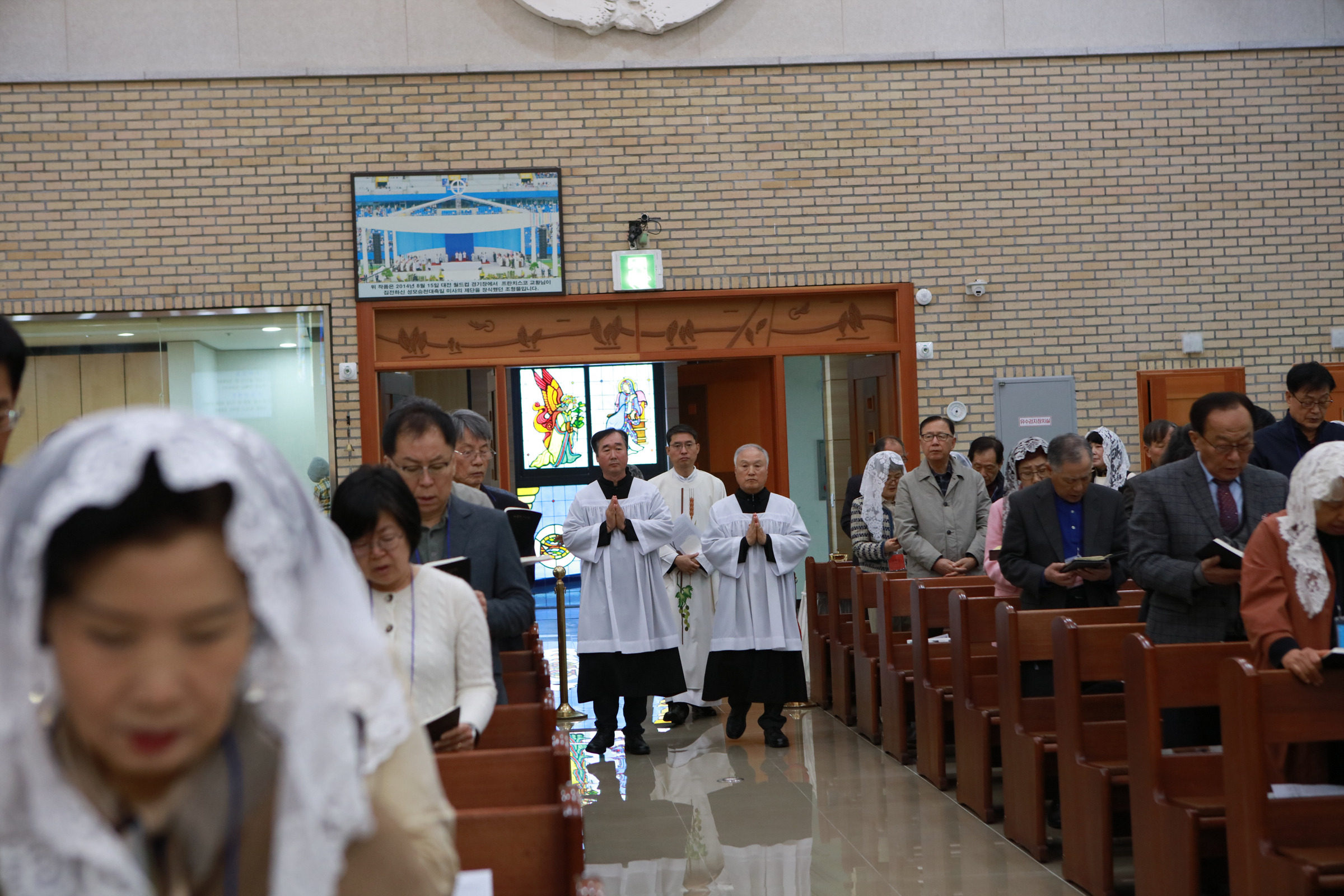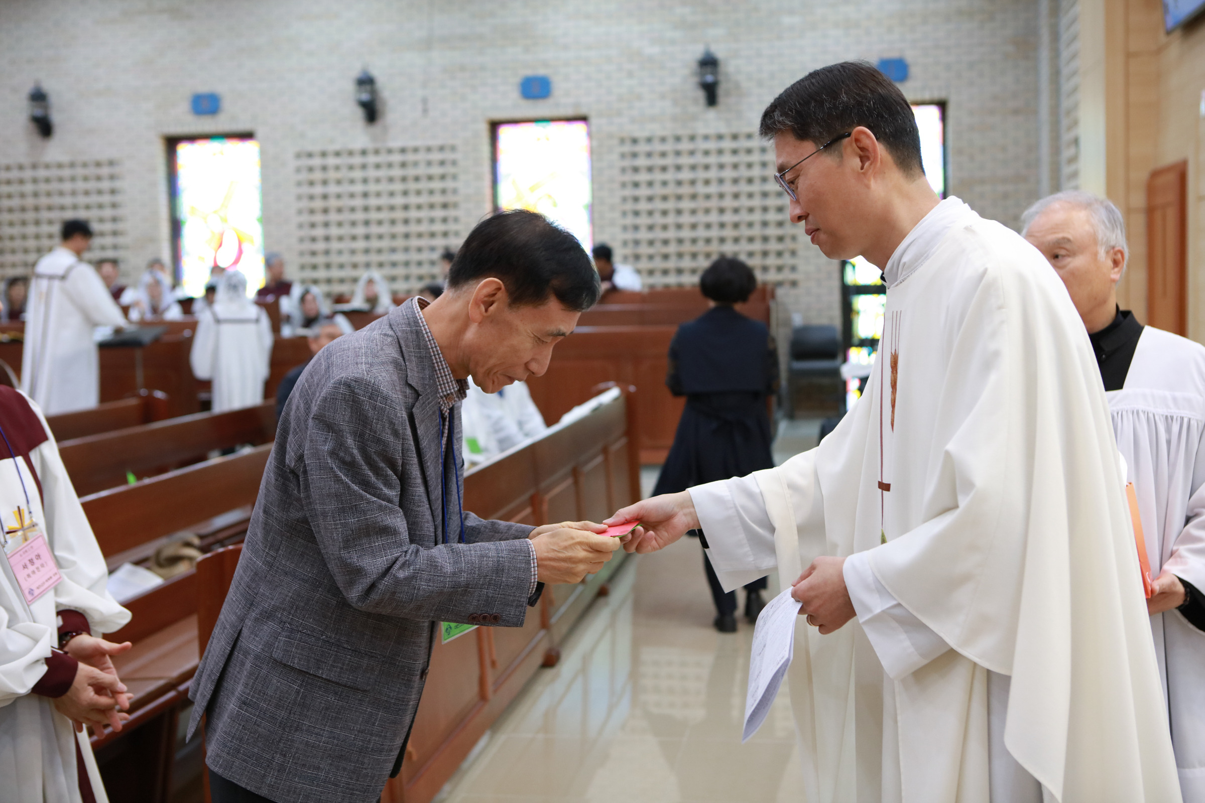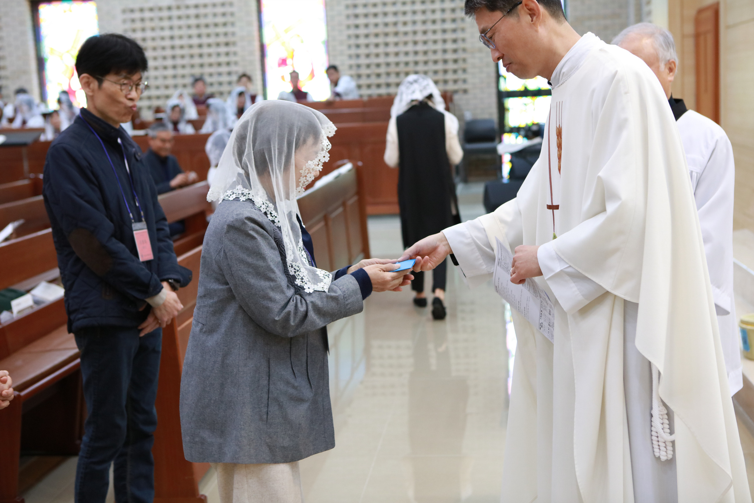 4월 12일 (주일) 오전 10시 30분 김영직 사도 요한 주임신부님 주례로 “하느님의 자비 주일” 미사를 봉헌했습니다. 강론에서 ‘오시어 가운데 서시며 “ 평화가 너희와 함께” 하고’ 함께함을 강조했습니다. 물동이 문제를 풀고 실천한 69명에게 나무로 손수 만드신 성경구 책갈피를 부상하고 로마서 필사를 치하했습니다. 미사 후 성전 입구에서 4 구역 봉사 차 나눔을, 105호실에서 사목회를 했습니다.