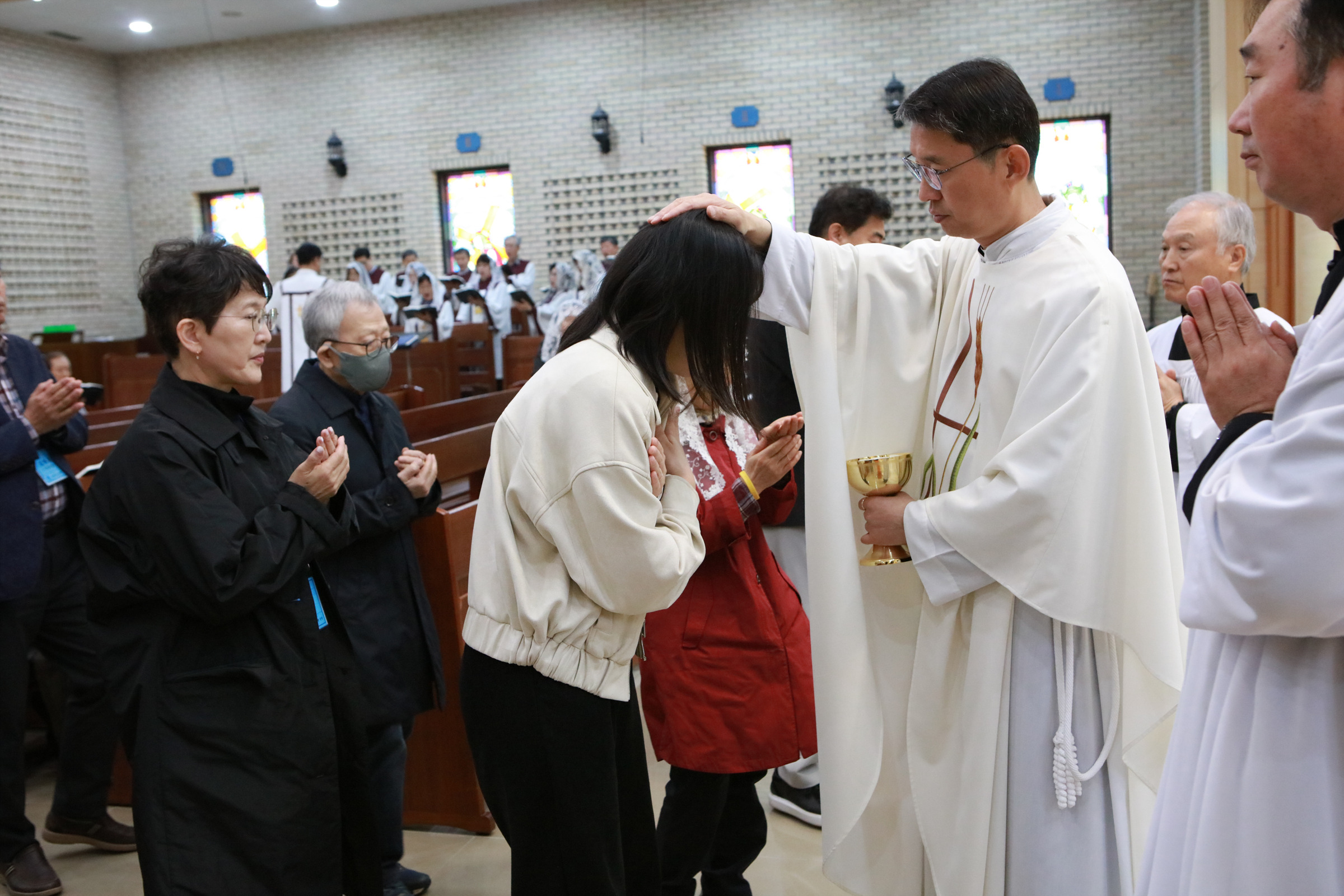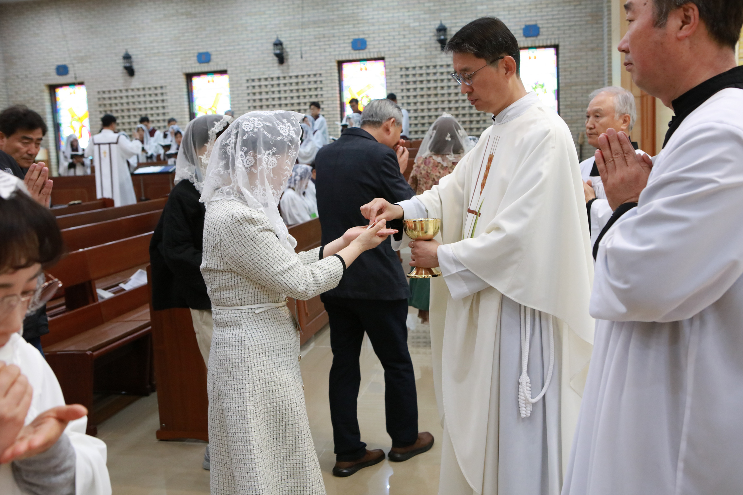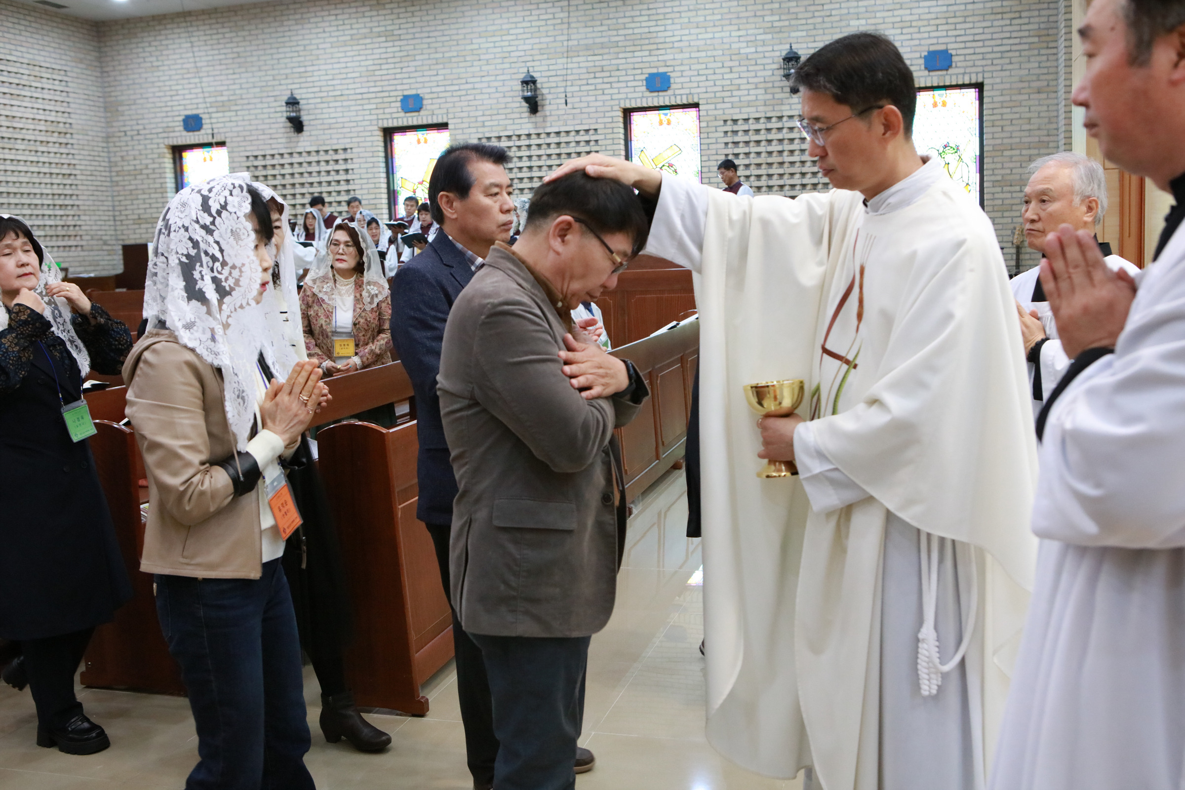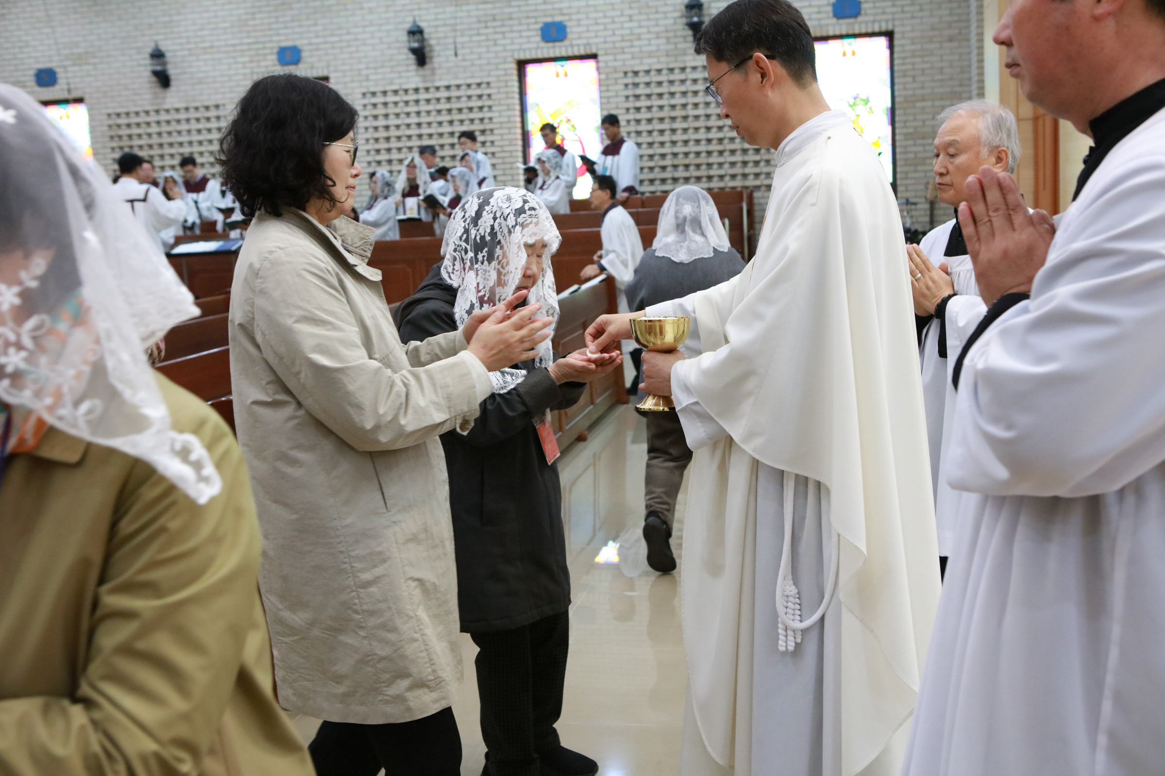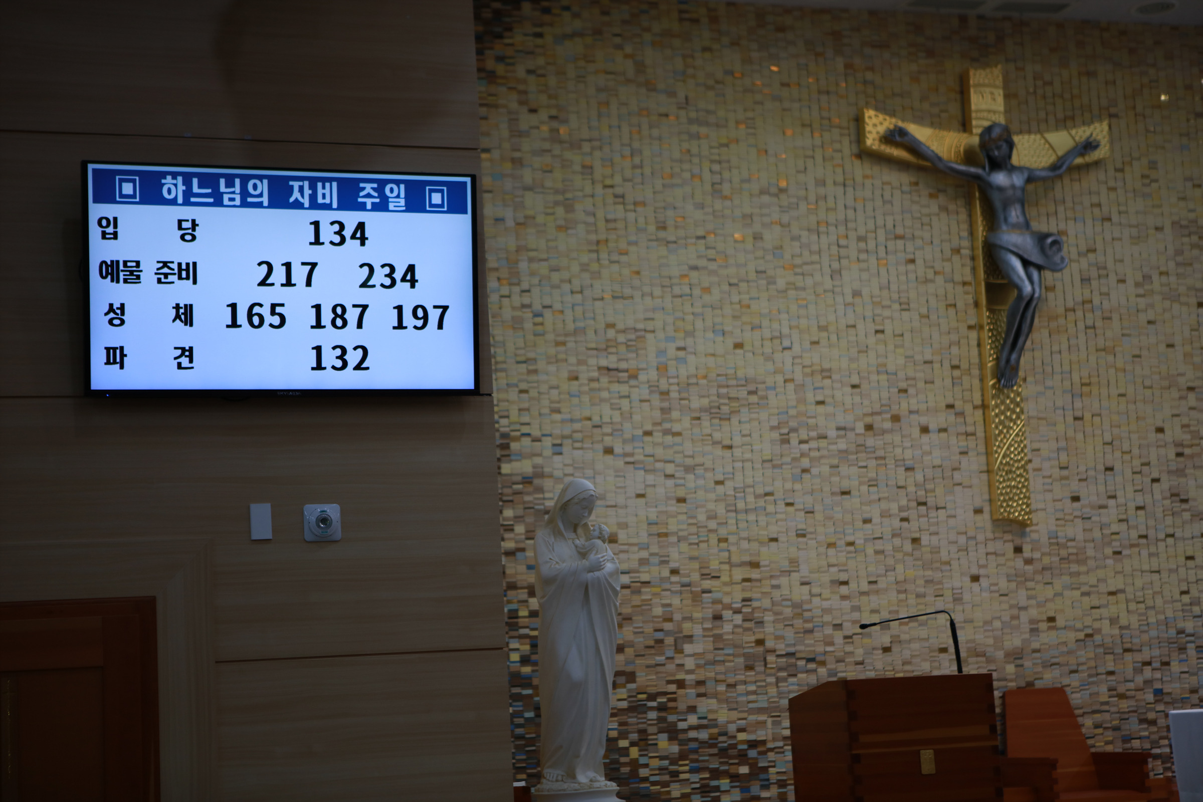 4월 12일 (주일) 오전 10시 30분 김영직 사도 요한 주임신부님 주례로 “하느님의 자비 주일” 미사를 봉헌했습니다. 강론에서 ‘오시어 가운데 서시며 “ 평화가 너희와 함께” 하고’ 함께함을 강조했습니다. 물동이 문제를 풀고 실천한 69명에게 나무로 손수 만드신 성경구 책갈피를 부상하고 로마서 필사를 치하했습니다. 미사 후 성전 입구에서 4 구역 봉사 차 나눔을, 105호실에서 사목회를 했습니다.