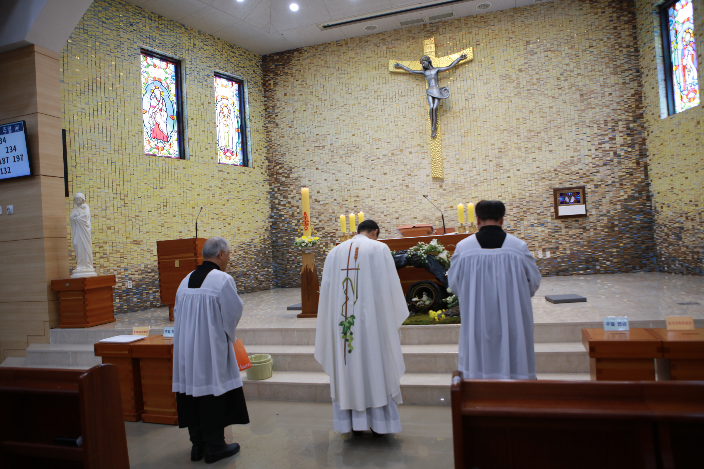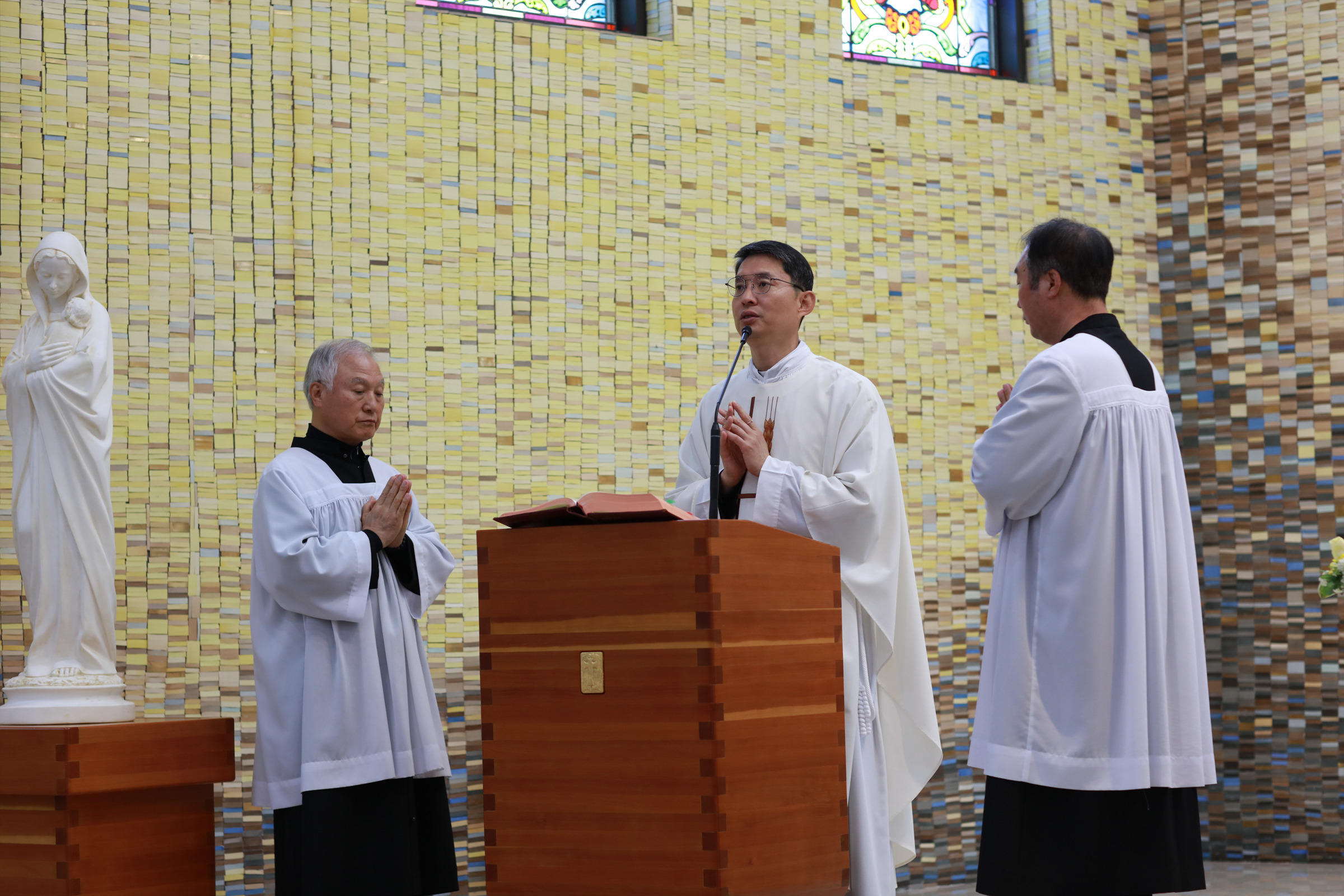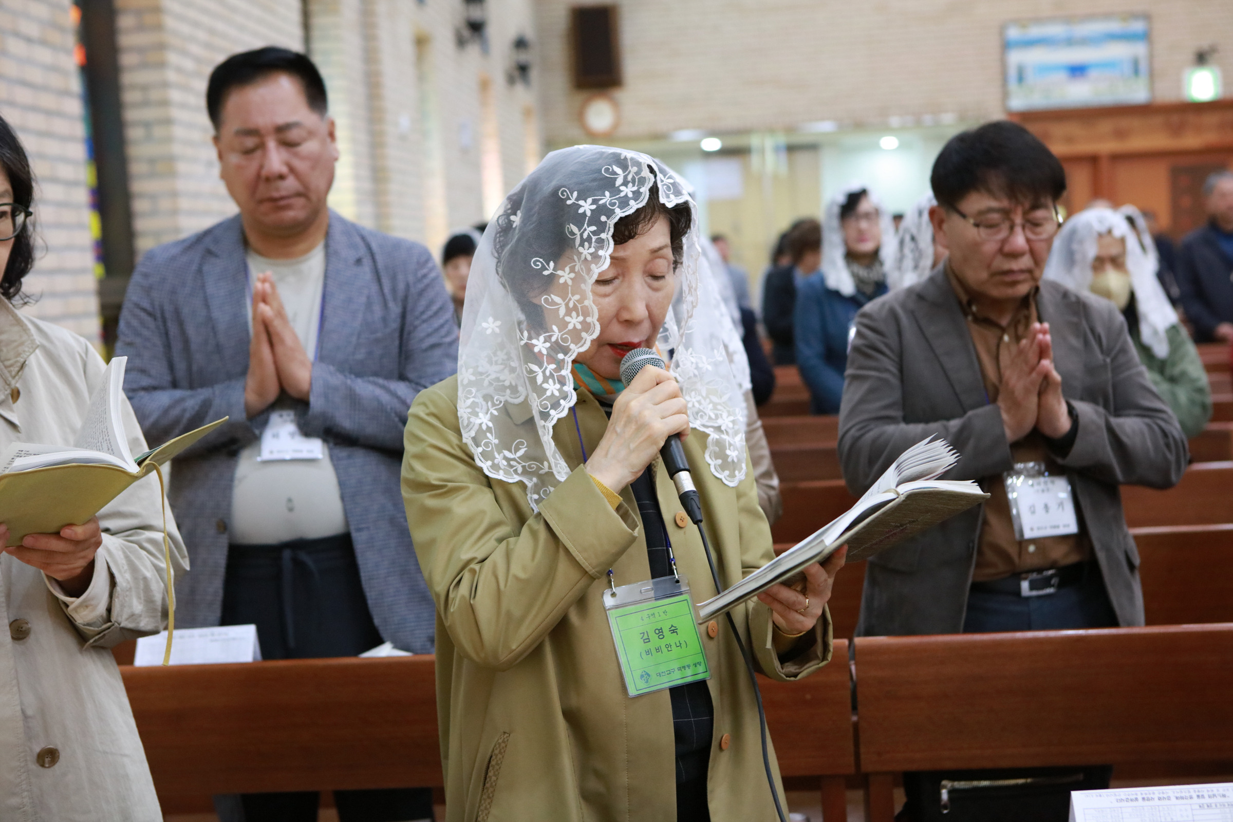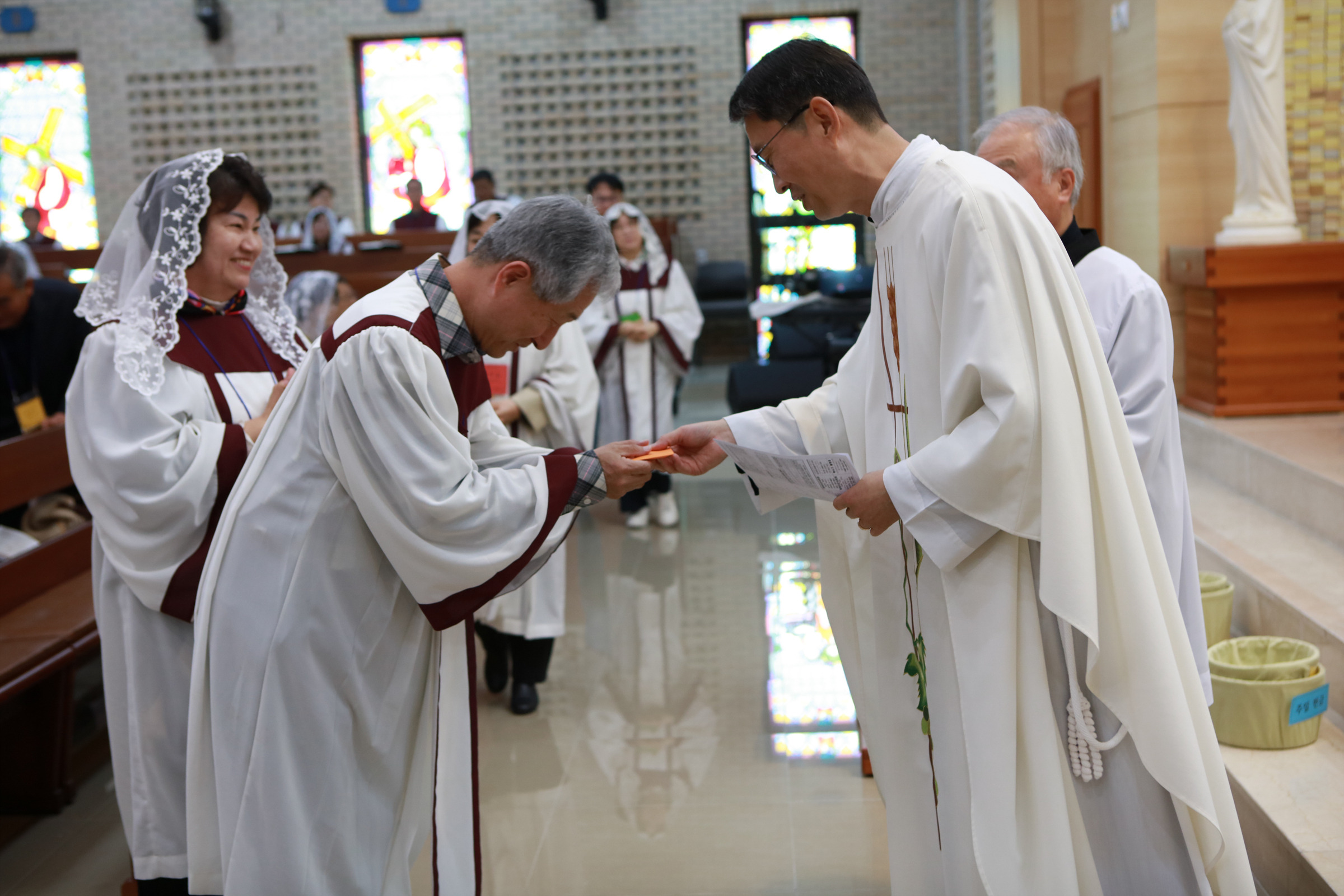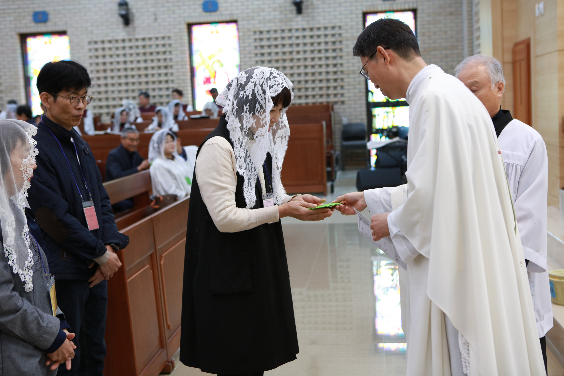 4월 12일 (주일) 오전 10시 30분 김영직 사도 요한 주임신부님 주례로 “하느님의 자비 주일” 미사를 봉헌했습니다. 강론에서 ‘오시어 가운데 서시며 “ 평화가 너희와 함께” 하고’ 함께함을 강조했습니다. 물동이 문제를 풀고 실천한 69명에게 나무로 손수 만드신 성경구 책갈피를 부상하고 로마서 필사를 치하했습니다. 미사 후 성전 입구에서 4 구역 봉사 차 나눔을, 105호실에서 사목회를 했습니다.