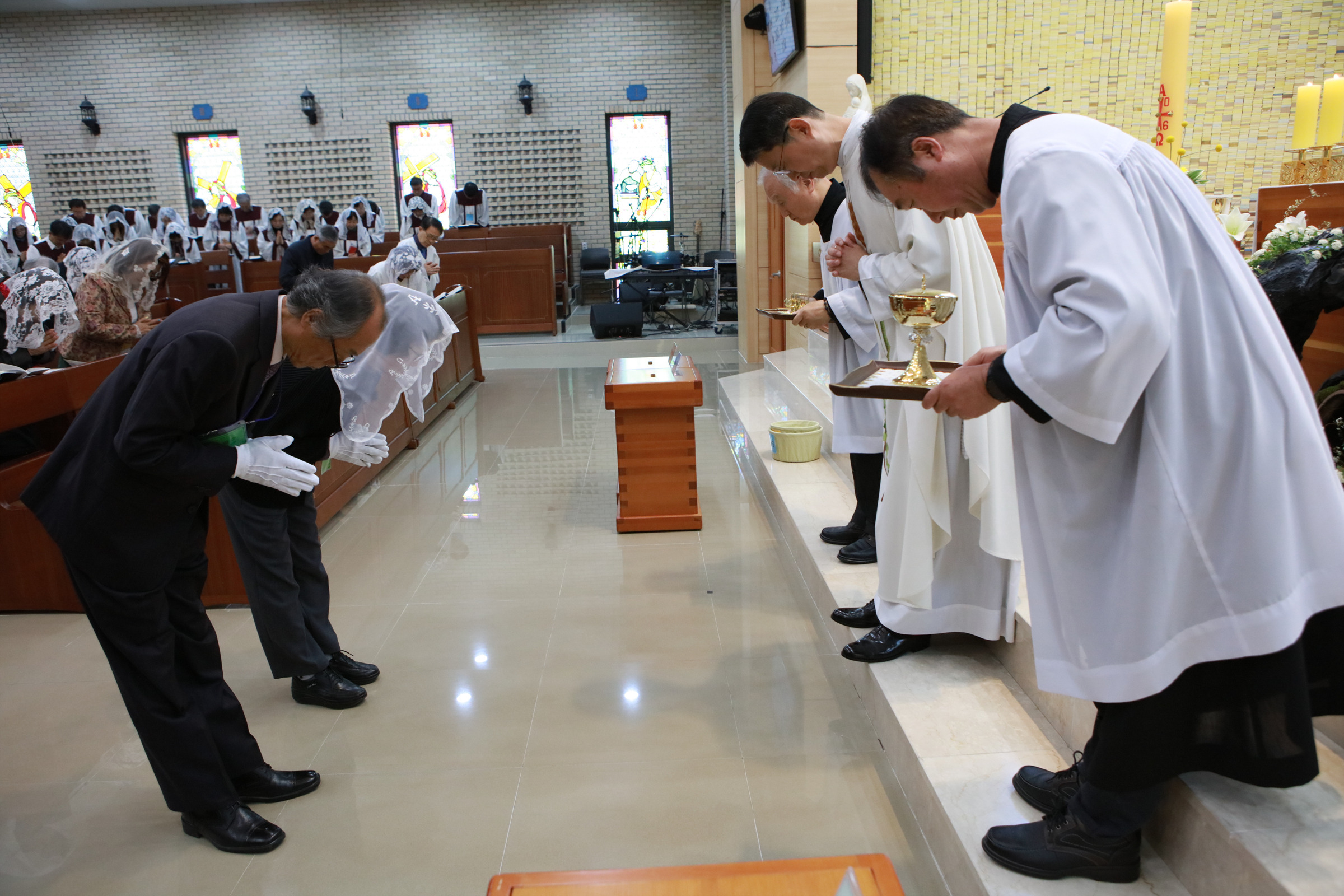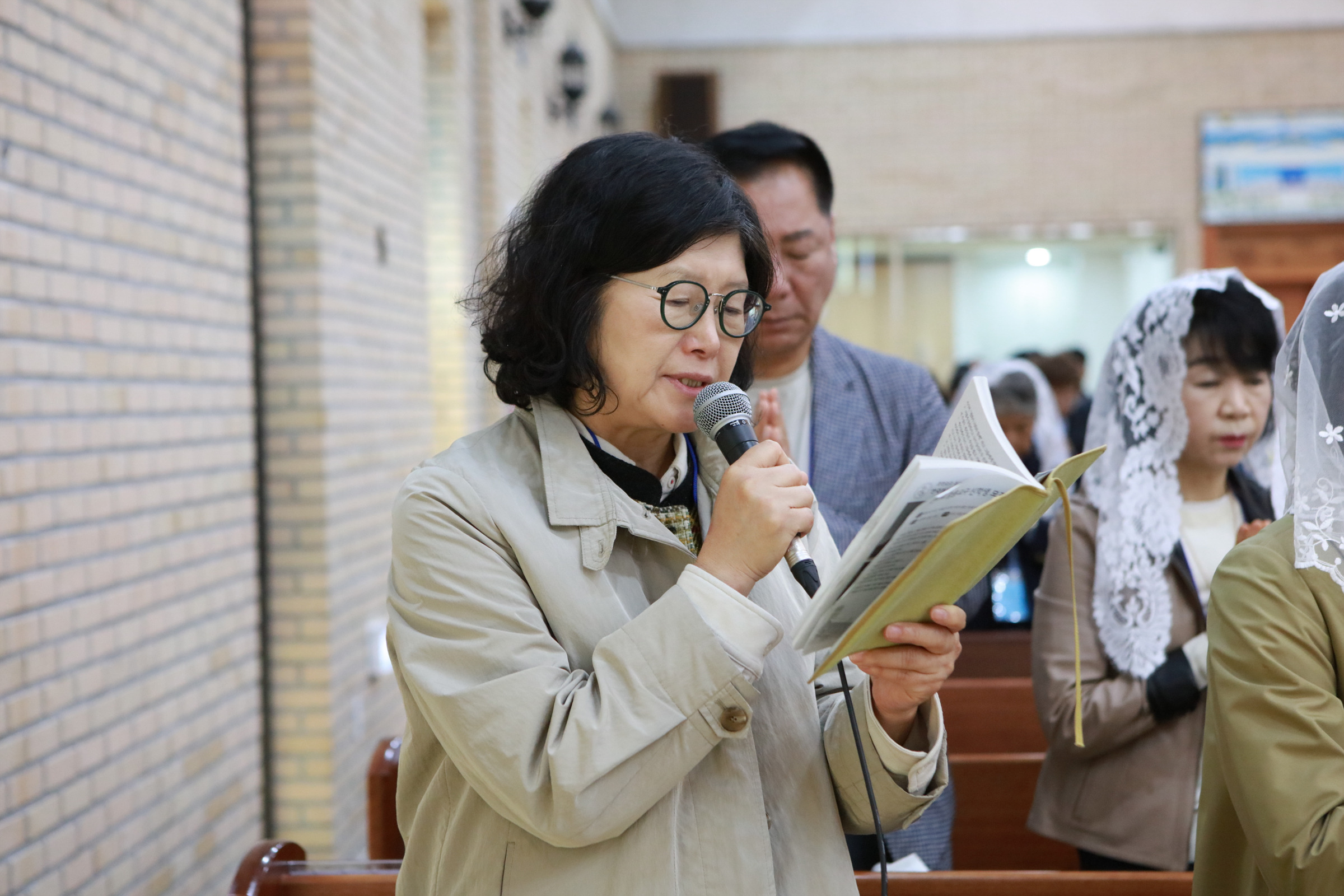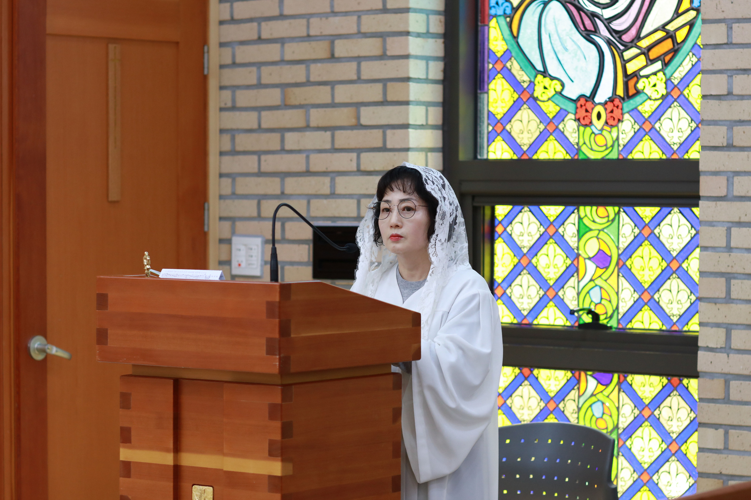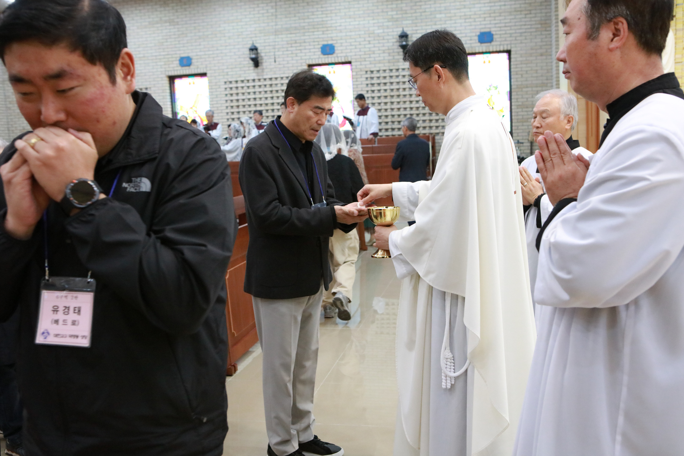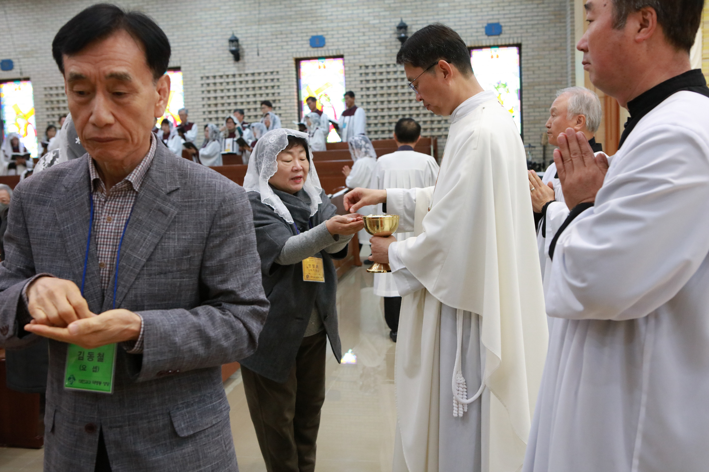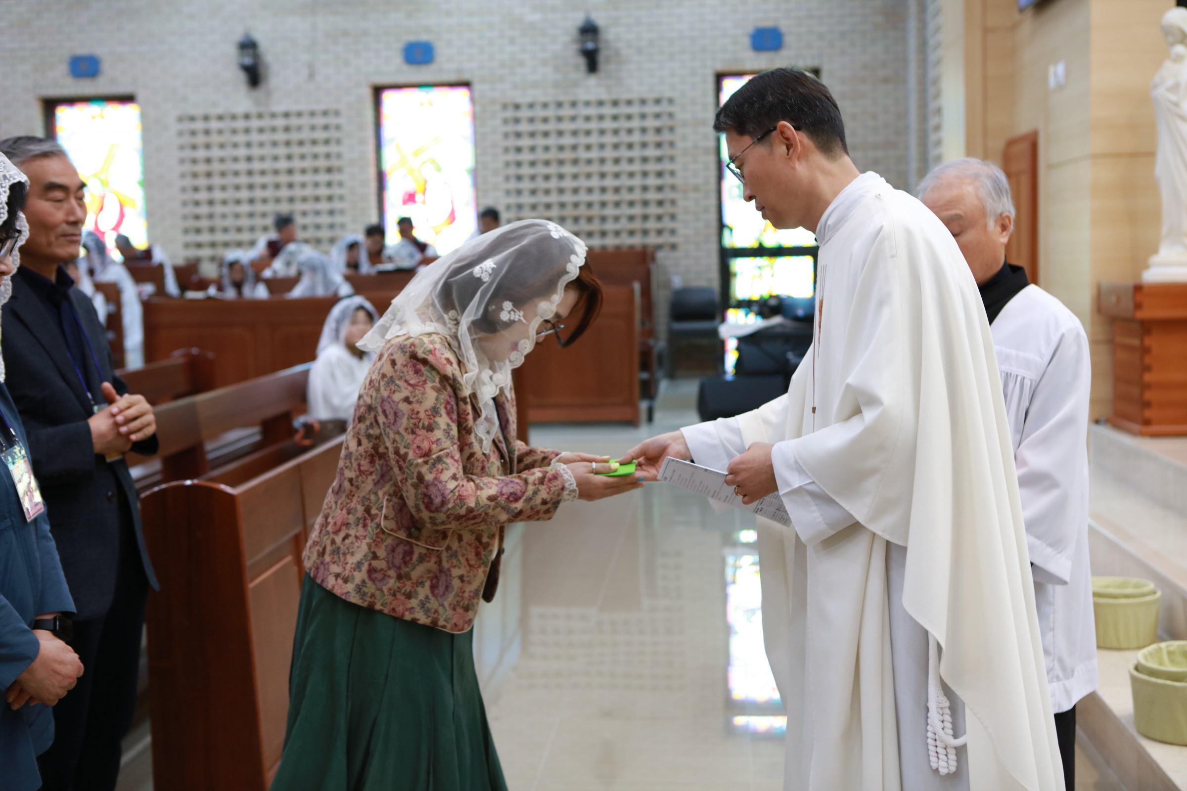 4월 12일 (주일) 오전 10시 30분 김영직 사도 요한 주임신부님 주례로 “하느님의 자비 주일” 미사를 봉헌했습니다. 강론에서 ‘오시어 가운데 서시며 “ 평화가 너희와 함께” 하고’ 함께함을 강조했습니다. 물동이 문제를 풀고 실천한 69명에게 나무로 손수 만드신 성경구 책갈피를 부상하고 로마서 필사를 치하했습니다. 미사 후 성전 입구에서 4 구역 봉사 차 나눔을, 105호실에서 사목회를 했습니다.