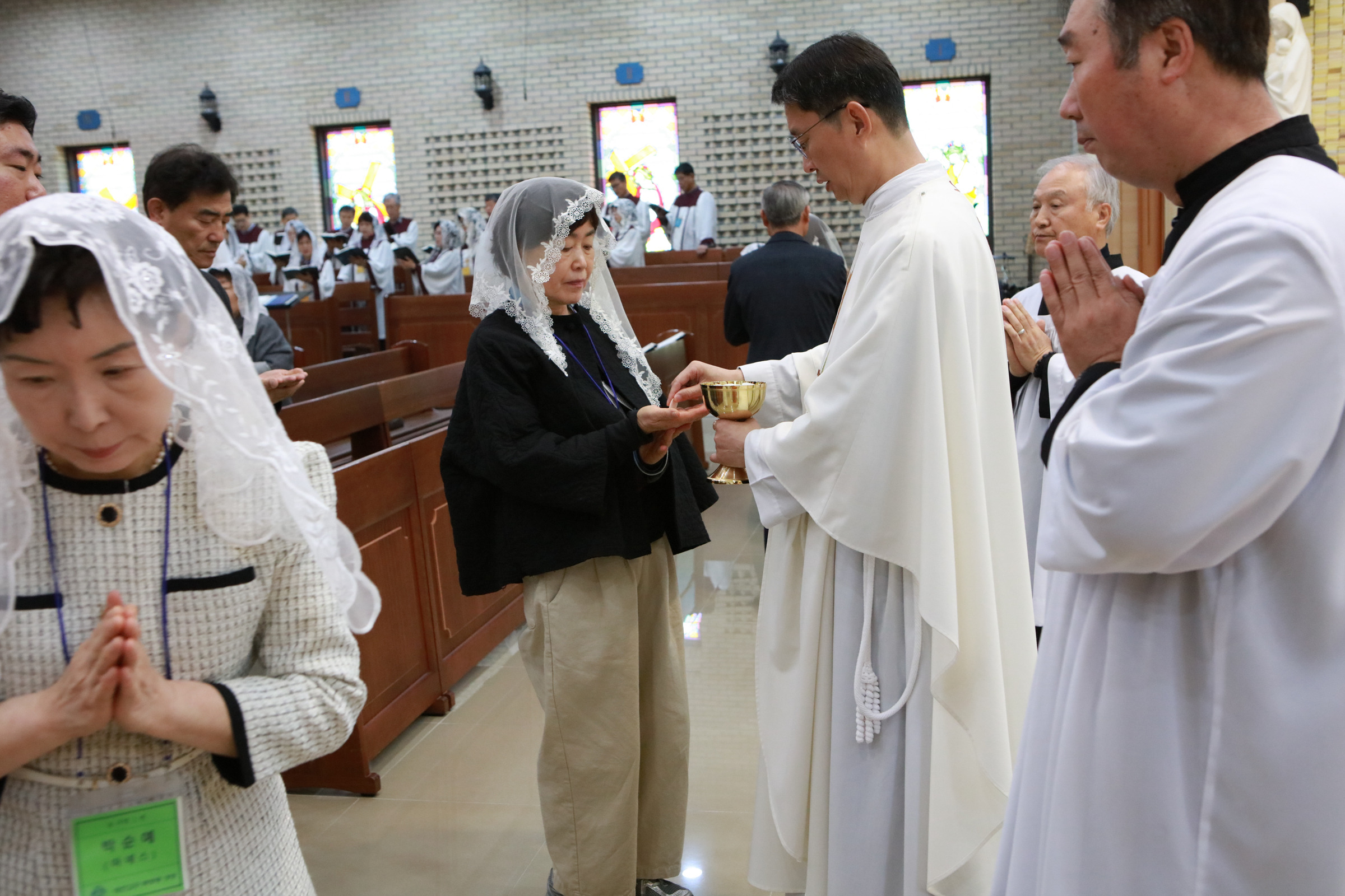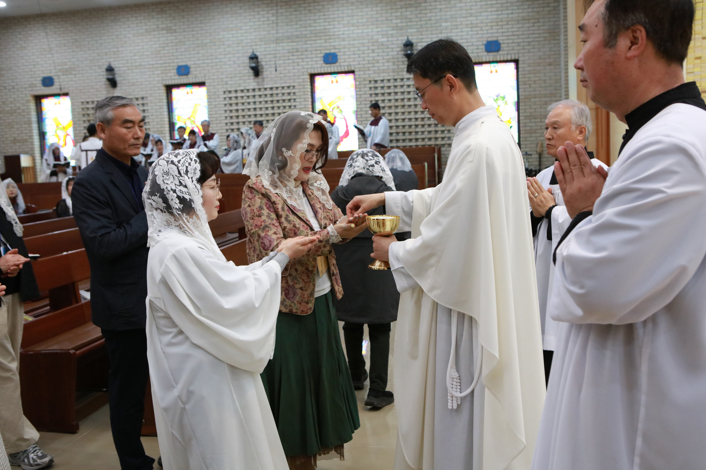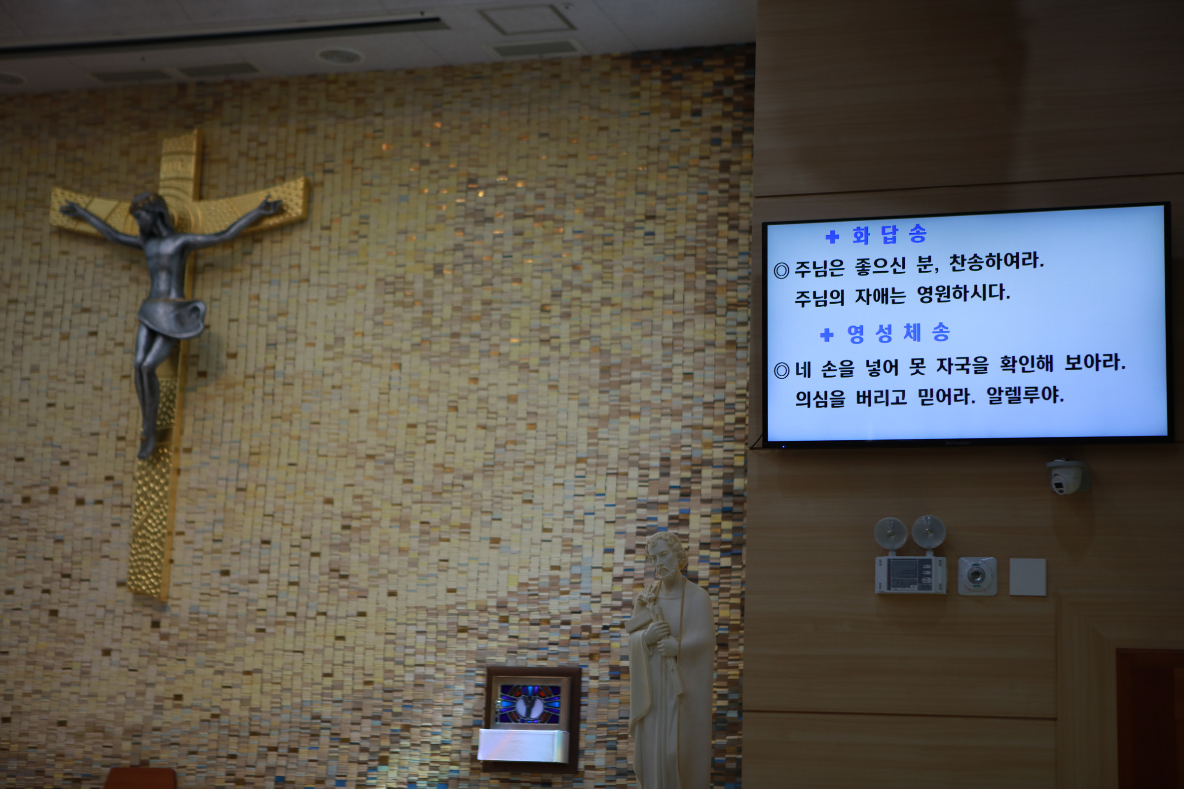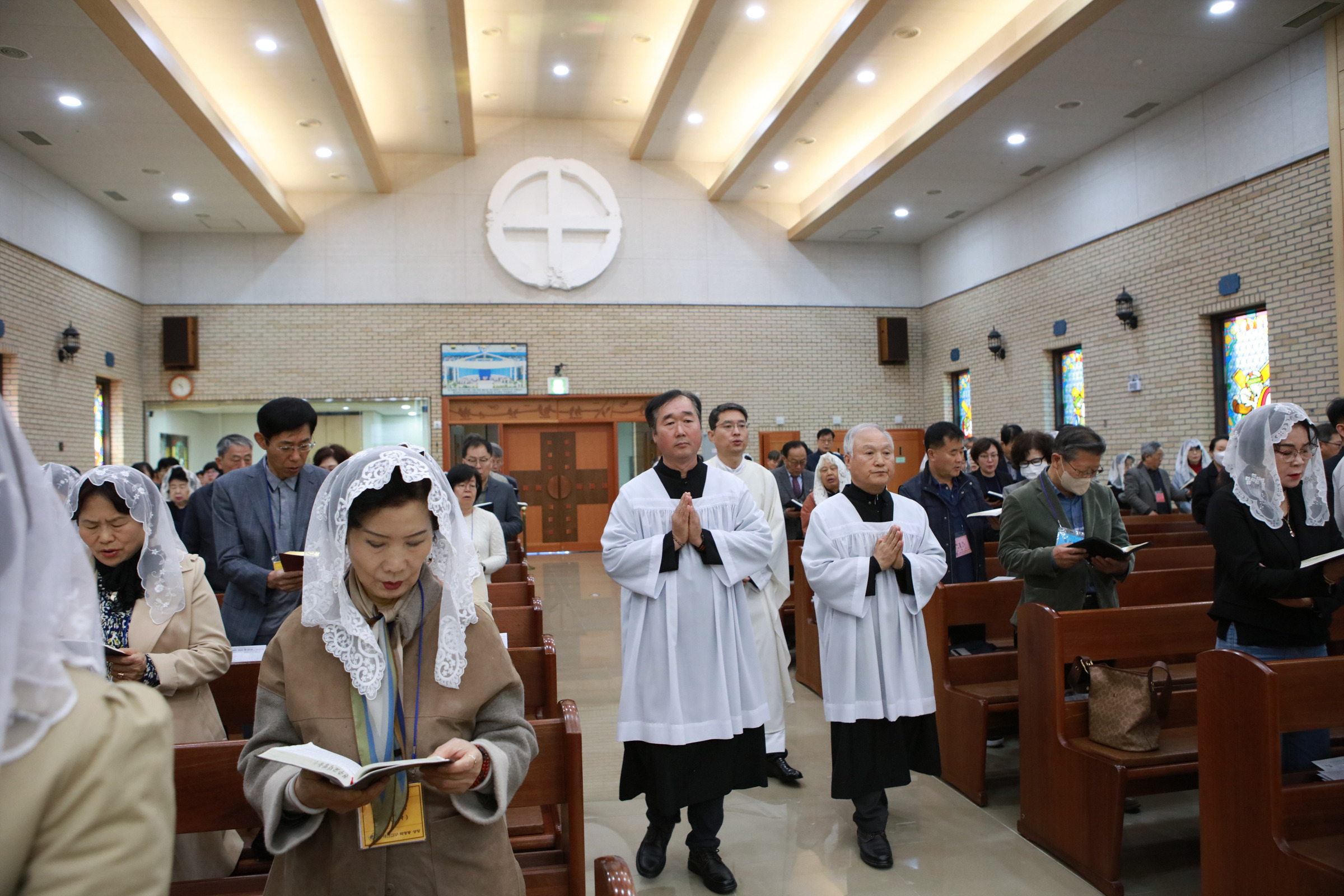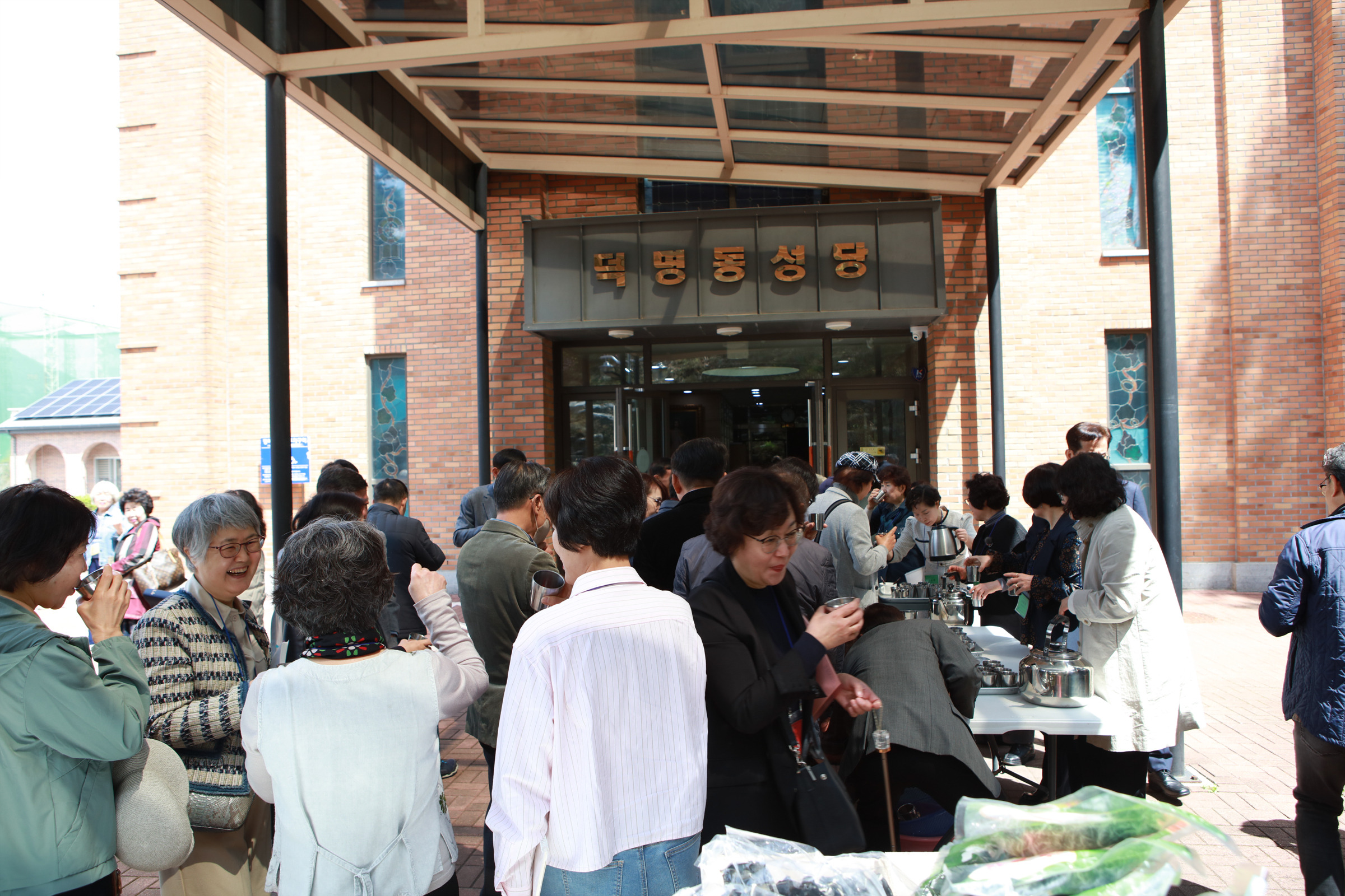 4월 12일 (주일) 오전 10시 30분 김영직 사도 요한 주임신부님 주례로 “하느님의 자비 주일” 미사를 봉헌했습니다. 강론에서 ‘오시어 가운데 서시며 “ 평화가 너희와 함께” 하고’ 함께함을 강조했습니다. 물동이 문제를 풀고 실천한 69명에게 나무로 손수 만드신 성경구 책갈피를 부상하고 로마서 필사를 치하했습니다. 미사 후 성전 입구에서 4 구역 봉사 차 나눔을, 105호실에서 사목회를 했습니다.