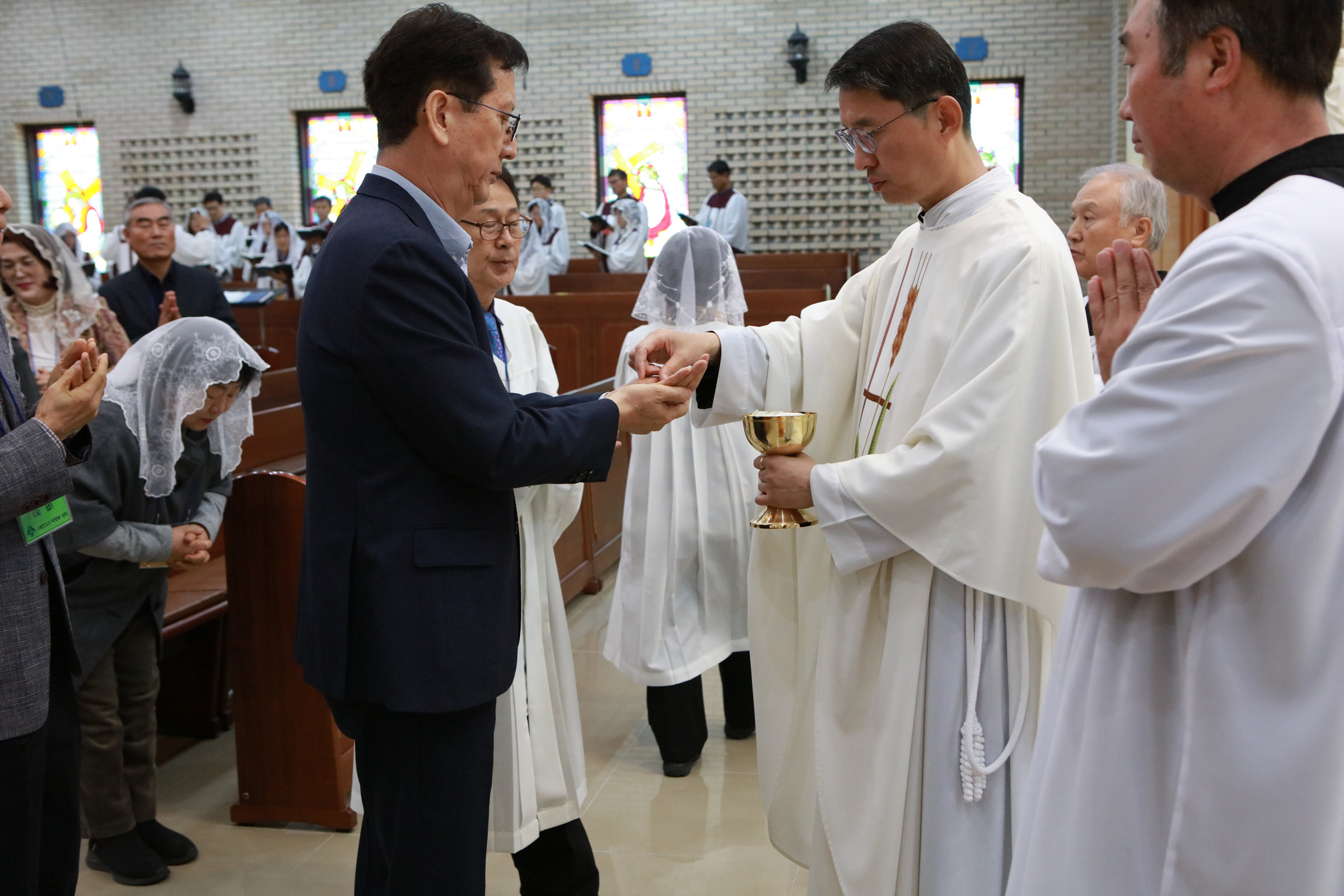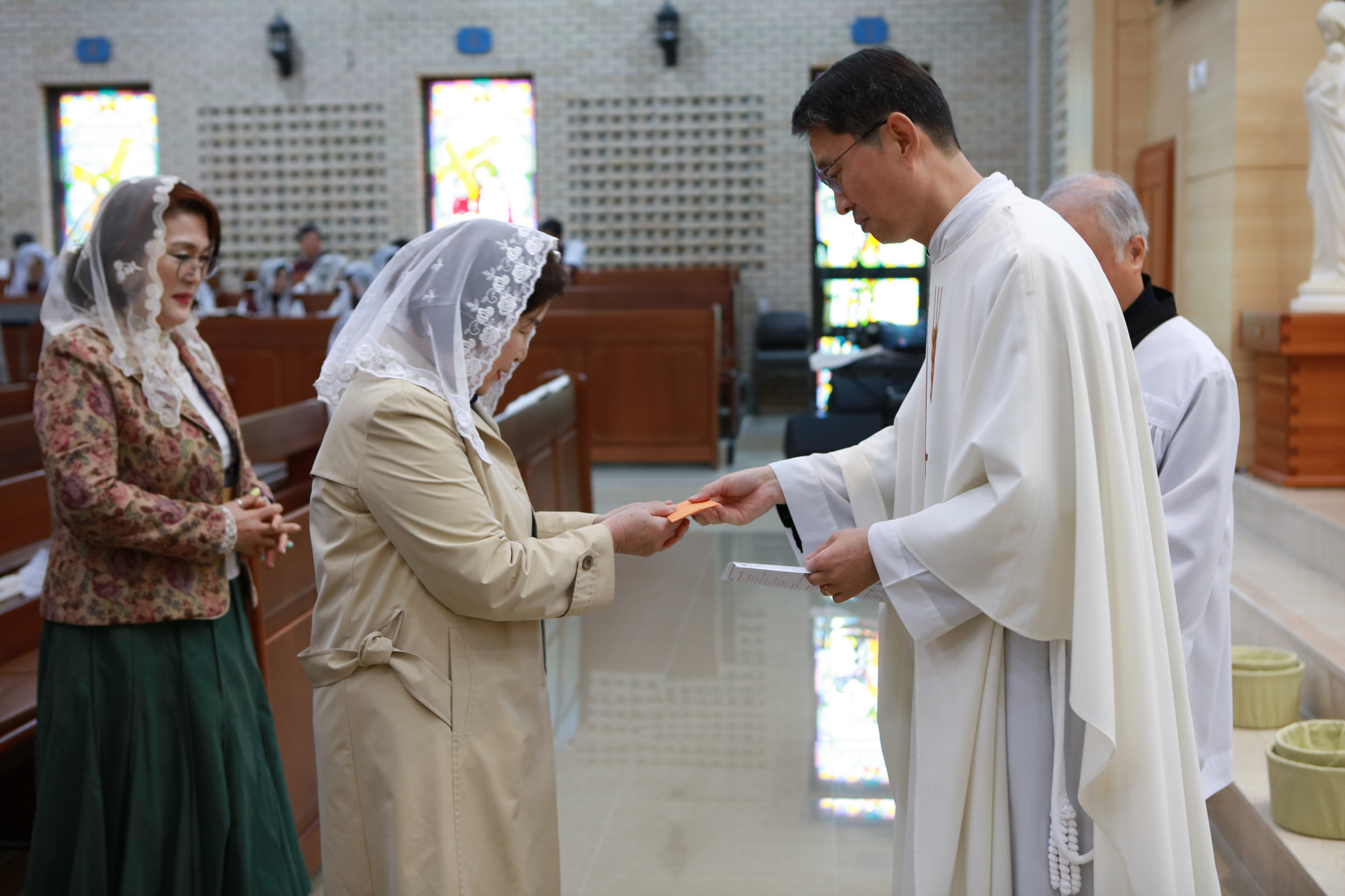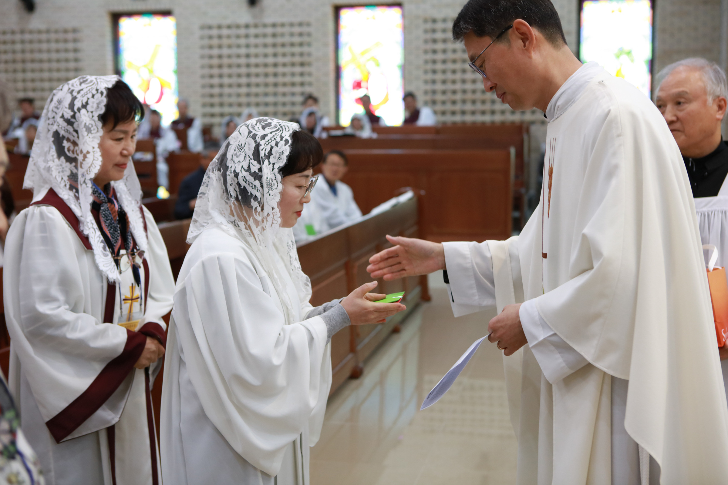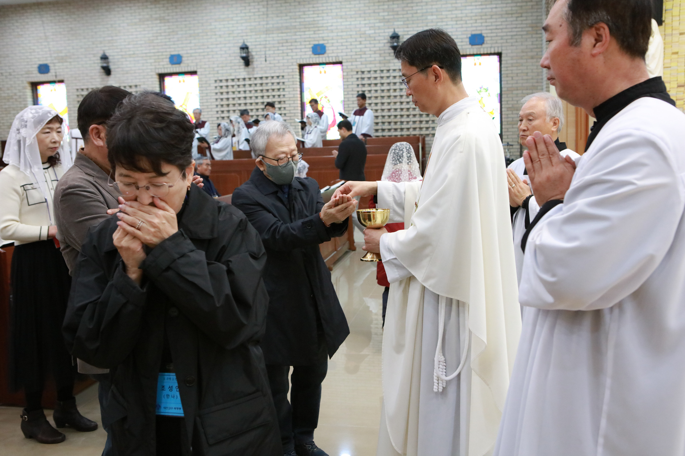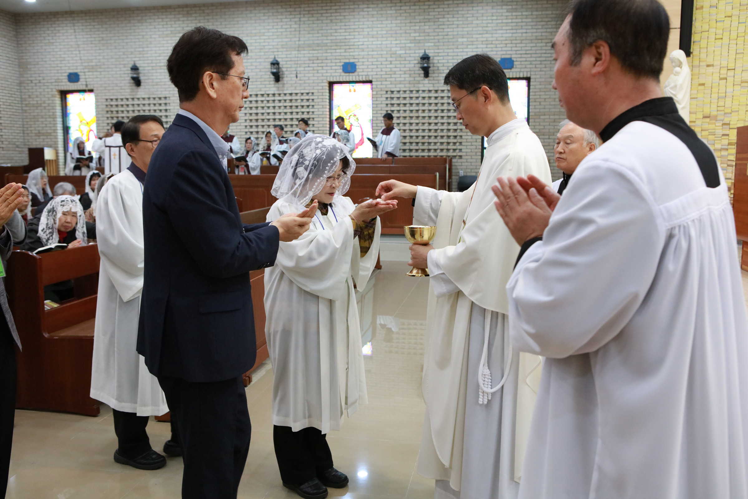 4월 12일 (주일) 오전 10시 30분 김영직 사도 요한 주임신부님 주례로 “하느님의 자비 주일” 미사를 봉헌했습니다. 강론에서 ‘오시어 가운데 서시며 “ 평화가 너희와 함께” 하고’ 함께함을 강조했습니다. 물동이 문제를 풀고 실천한 69명에게 나무로 손수 만드신 성경구 책갈피를 부상하고 로마서 필사를 치하했습니다. 미사 후 성전 입구에서 4 구역 봉사 차 나눔을, 105호실에서 사목회를 했습니다.