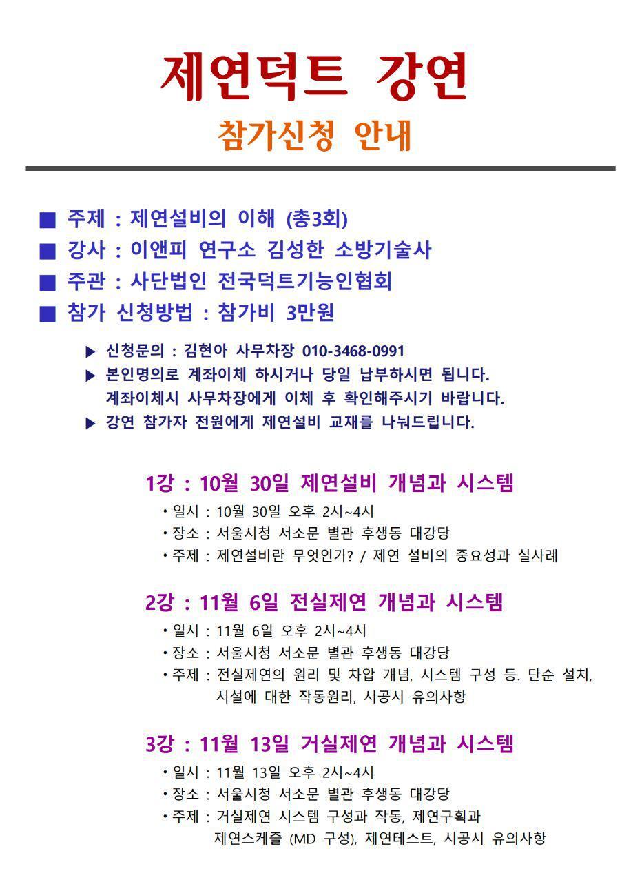 2016년 전국덕트기능인협회 강좌를 진행합니다. '제연설비의 이해' 총3회 작성자덕트협회|작성시간16.11.04|조회수512 목록 댓글 0 글자크기 작게가 글자크기 크게가 다음검색 현재 게시글 추가 기능 열기 북마크 공유하기 신고 센터로 신고 댓글 댓글 0 댓글쓰기 답글쓰기 댓글 리스트