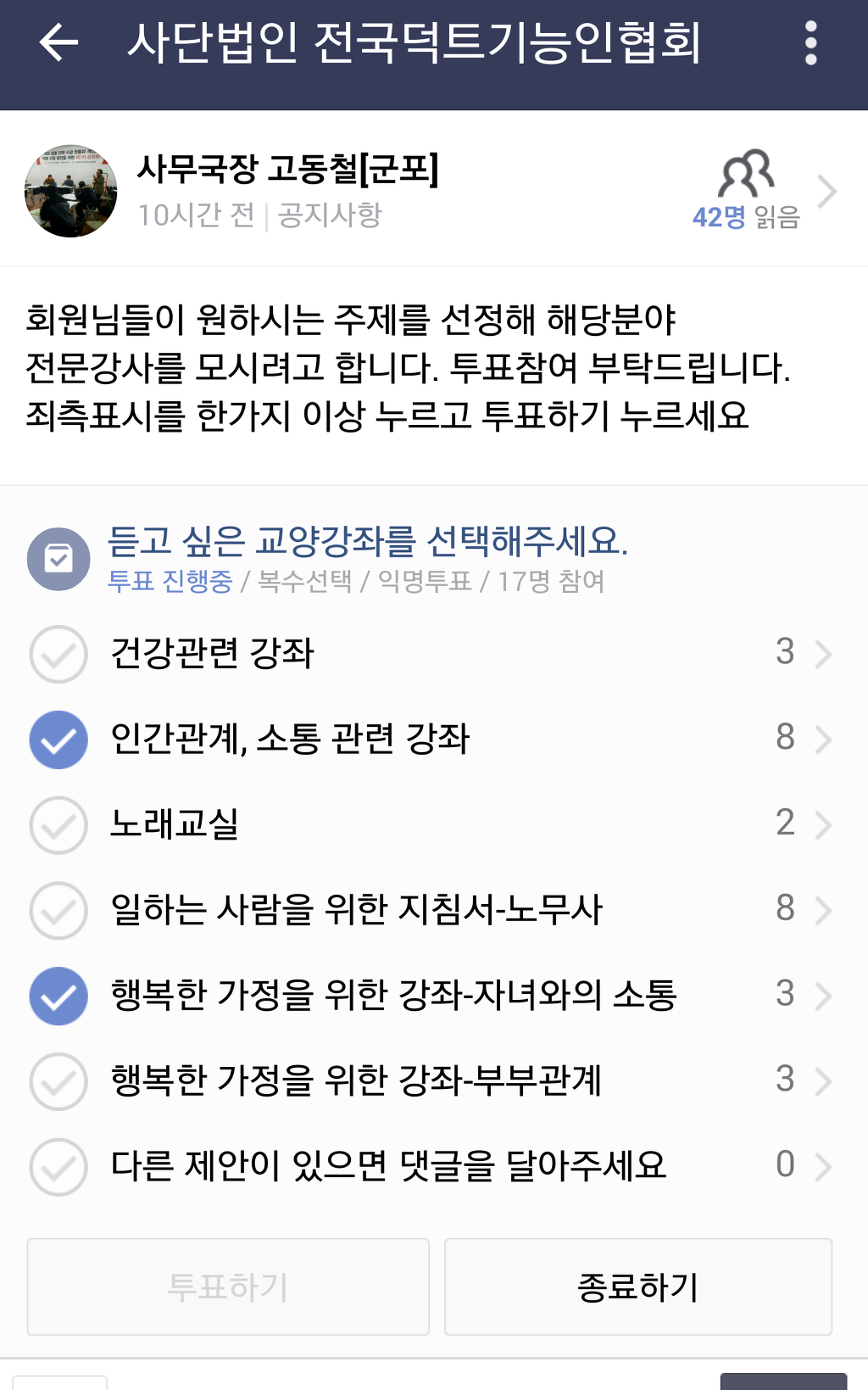 교양강좌 설문 투표 - 협회 카카오그룹에서 진행중 작성자덕트협회|작성시간15.03.17|조회수207 목록 댓글 0 글자크기 작게가 글자크기 크게가 다음검색 현재 게시글 추가 기능 열기 북마크 공유하기 신고 센터로 신고 댓글 댓글 0 댓글쓰기 답글쓰기 댓글 리스트