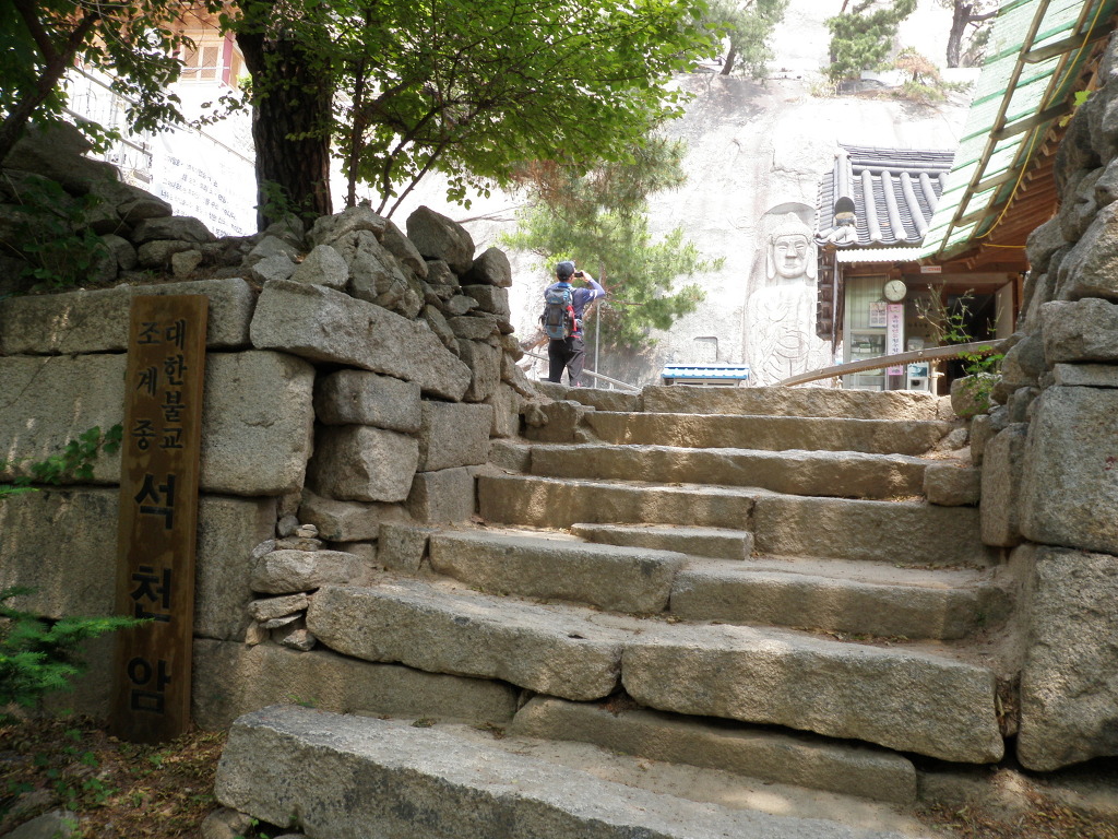 하산 길을 잡고 급경사 바위 길을 따라 석천계곡으로 하산하여 석림사를 지나 장암역