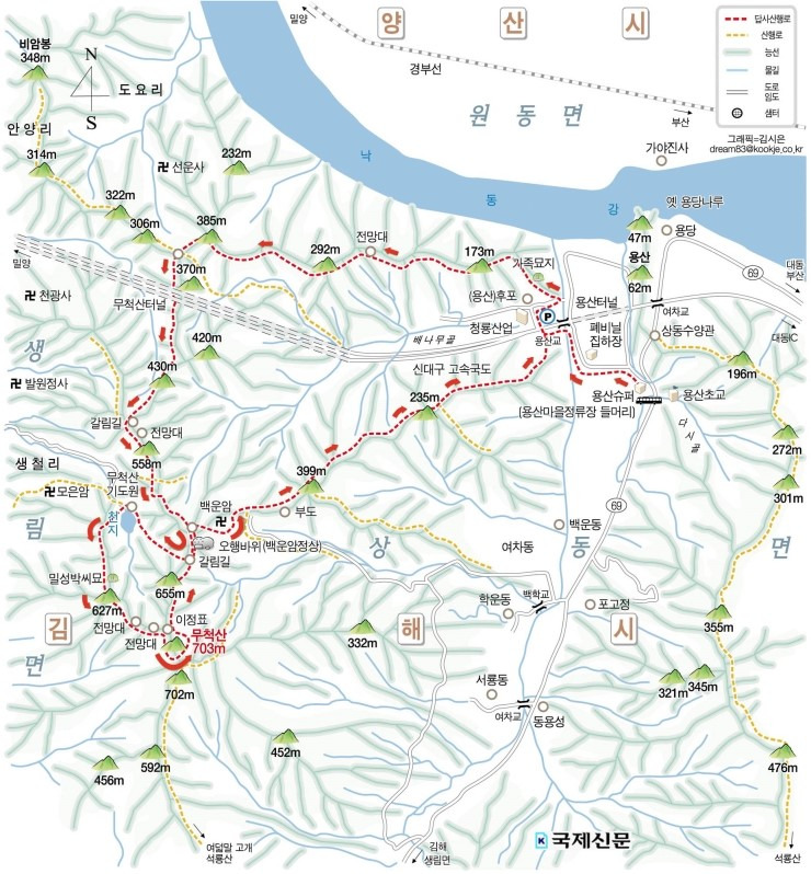 나. 산행코스 : 용산초교~용산교~292봉~370봉~430봉~558봉~기도원~천지~무척산~
