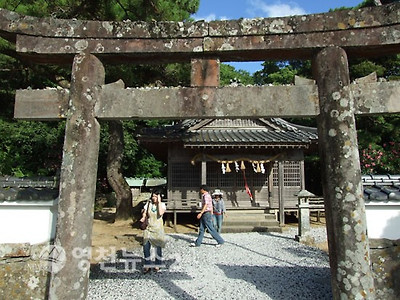 본전 정면의 다섯 개의 도리이(鳥井)중 바다 위에 서있는 두 개의 도리이는 조수에 따라 그 모습이 바뀌어 잔잔한 아소만과 어우러져 신화의 세계를 연상케 한다.