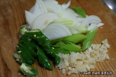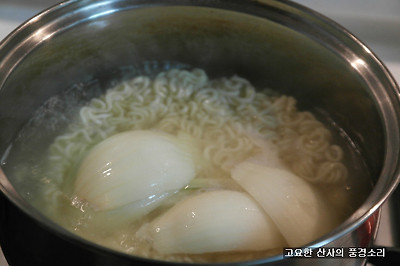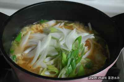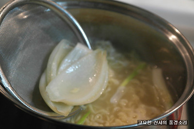▶ 재료 : 라면 사리 2개, 멸치 육수 3컵, 양파 1/2개, 청양초 3개,