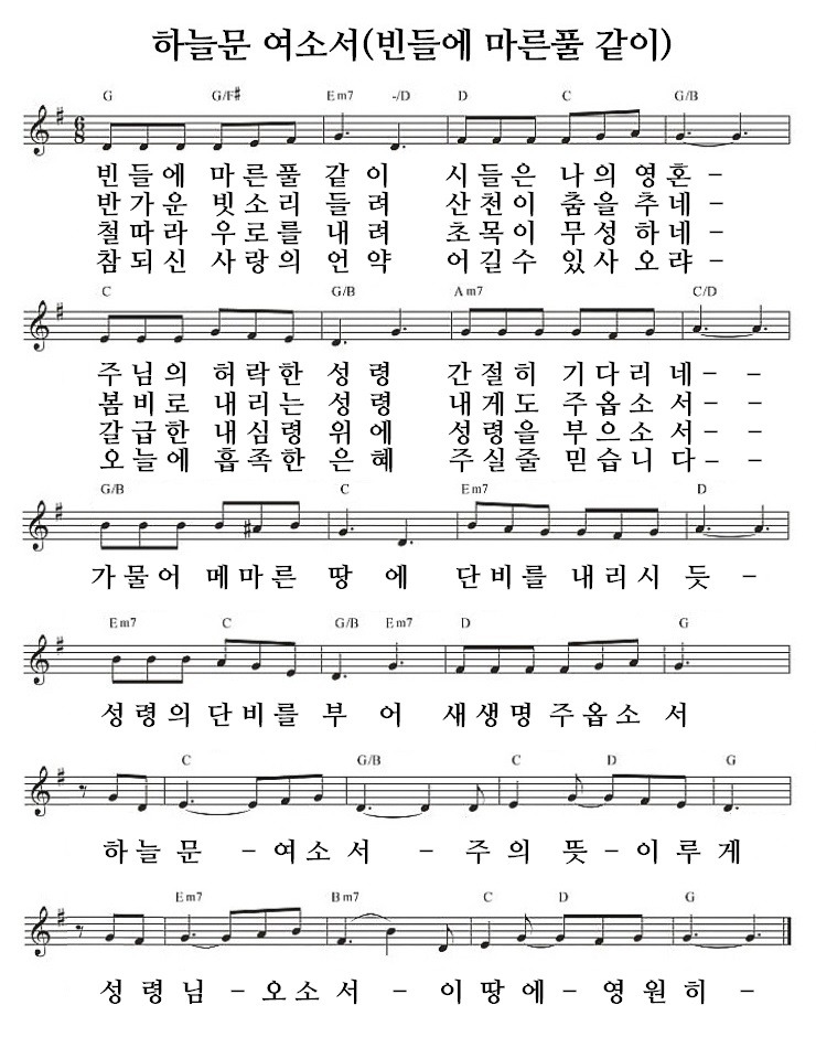 하늘문 여소서(빈들에 마른 풀같이) 악보 작성자김홍일|작성시간15.05.02|조회수9,237 목록 댓글 0 글자크기 작게가 글자크기 크게가 다음검색 현재 게시글 추가 기능 열기 북마크 공유하기 신고 센터로 신고 댓글 댓글 0 댓글쓰기 답글쓰기 댓글 리스트
