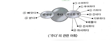 06. ‘주다’의 관련 어휘를 탐색한 결과인 <보기>에 대한 이해로 적절하지 않은 것은?